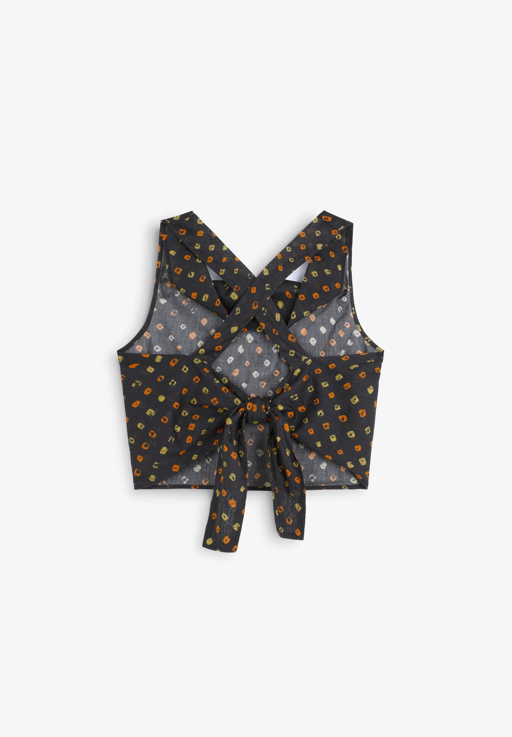 Top en tissu 100 % coton BCI imprimé. Coupe droite, col en V. Bretelles croisées dans le dos et emmanchures américaines.