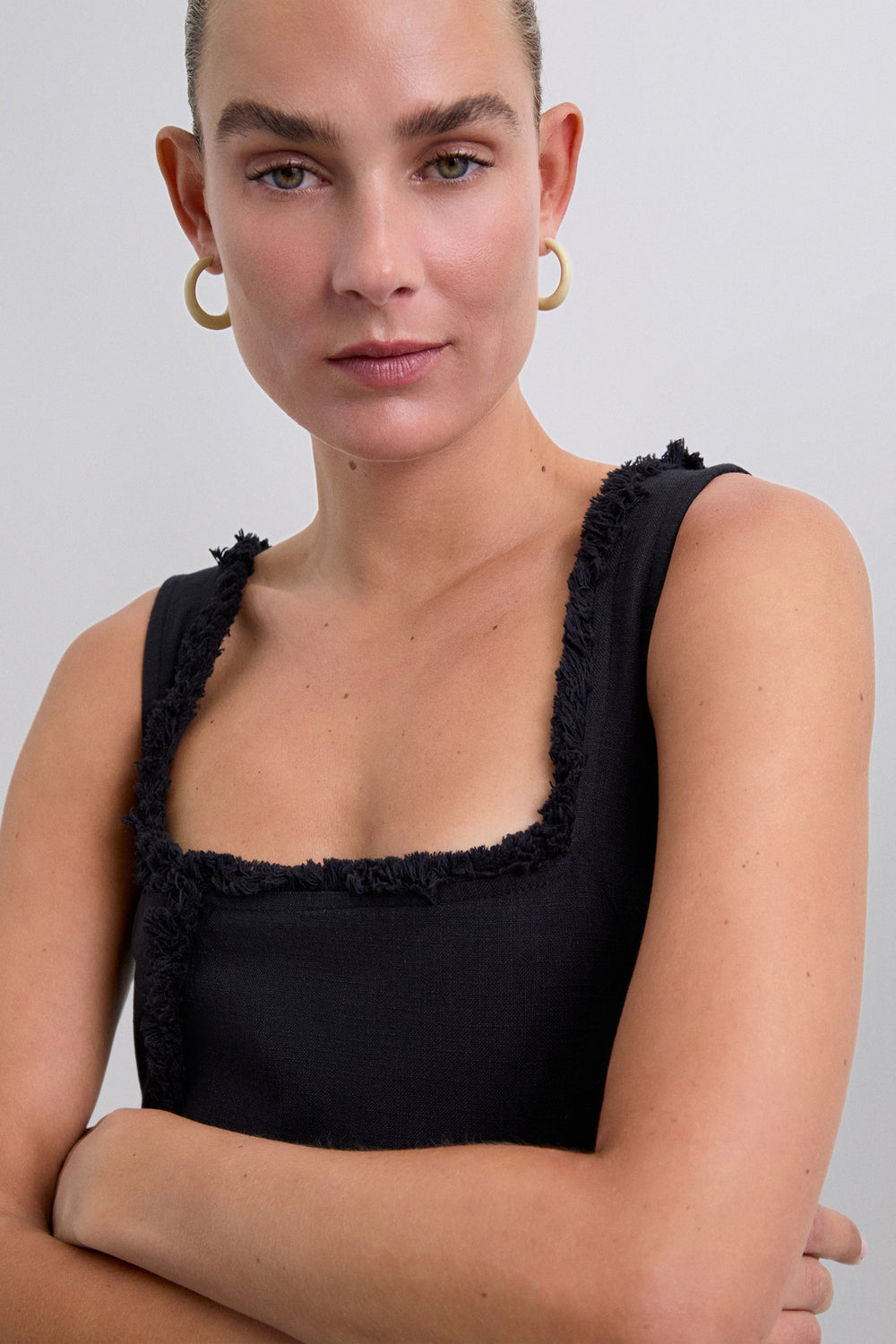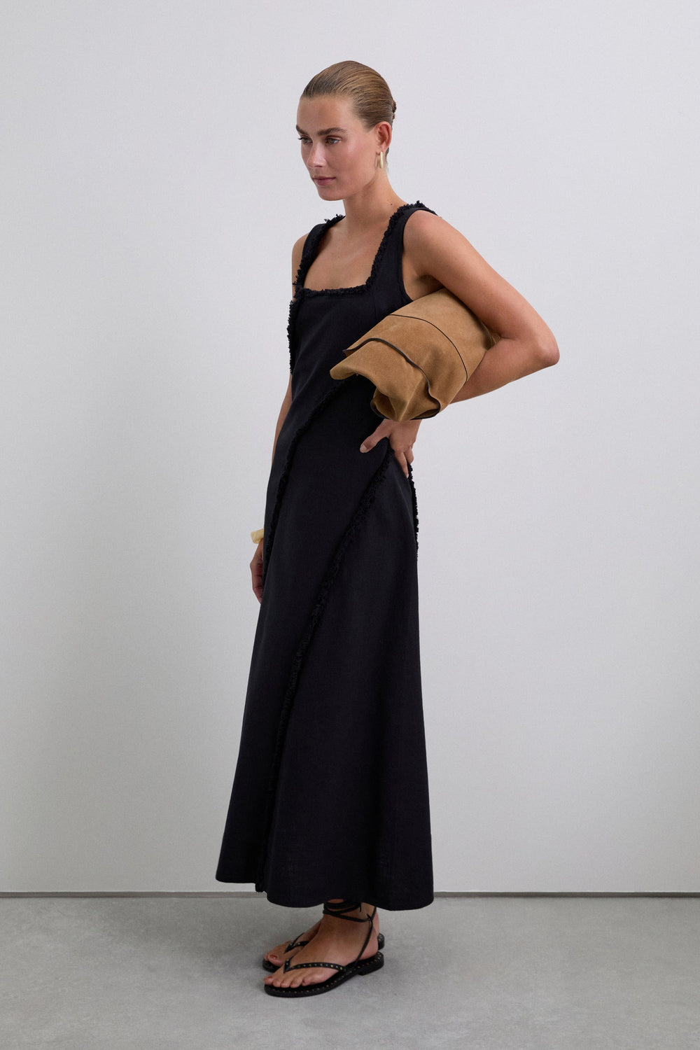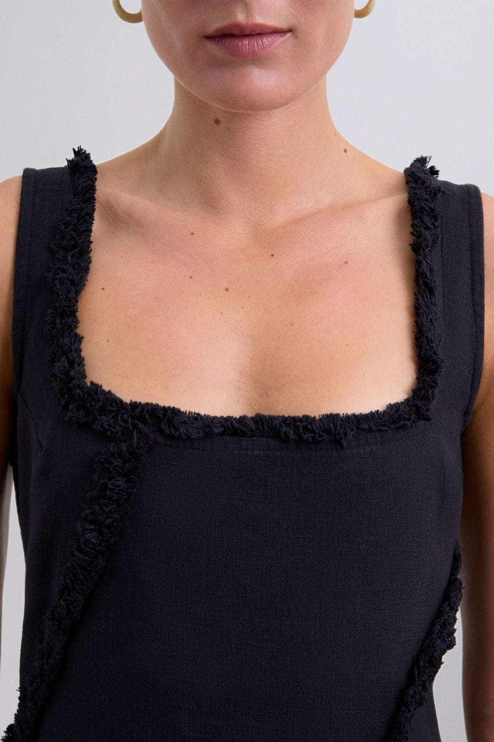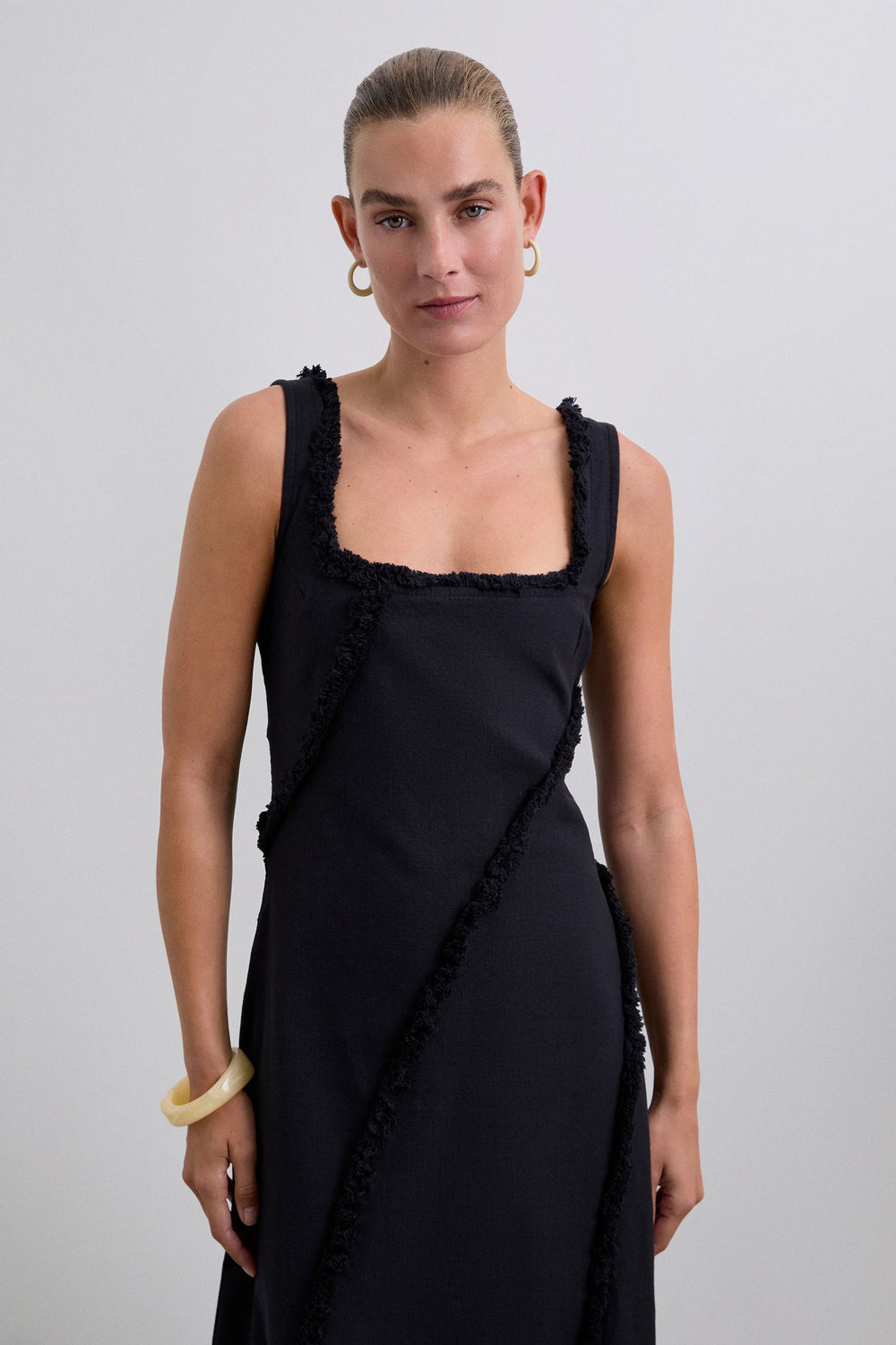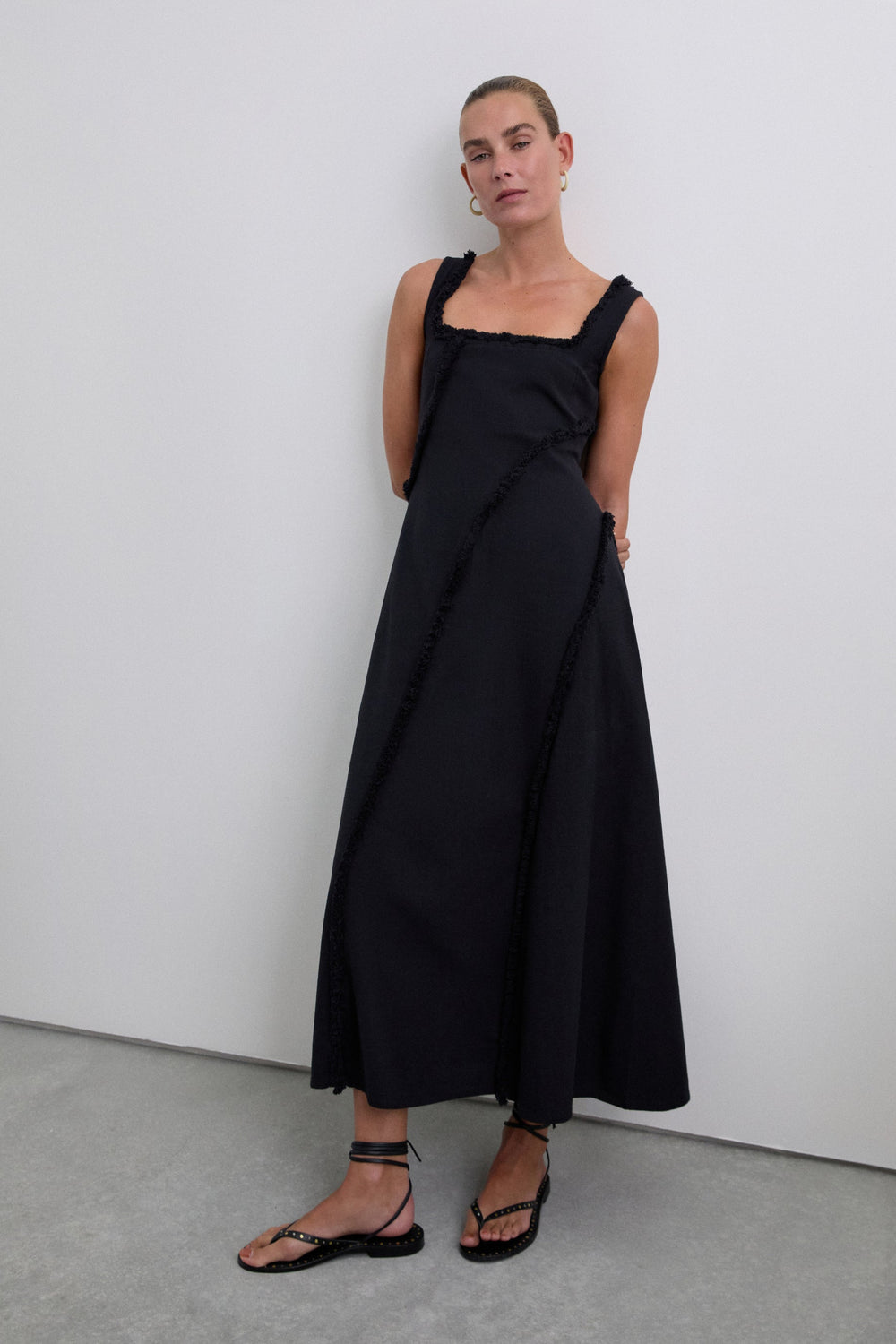 Robe midi 100 % coton bio BCI. Bretelles. Col carré. Franges sur les surpiqûres.