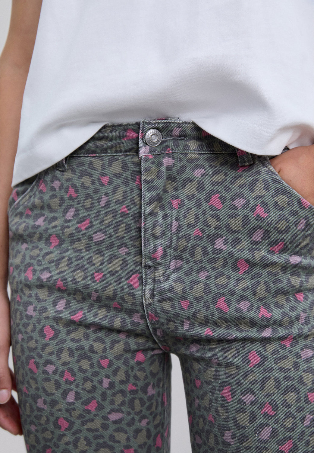 Jean. Deux poches sur le devant. Deux poches arrière avec étiquette avec logo et skull. Effet effiloché dans le bas. Passants de ceinture. Bouton et fermeture Éclair. Motif animal.