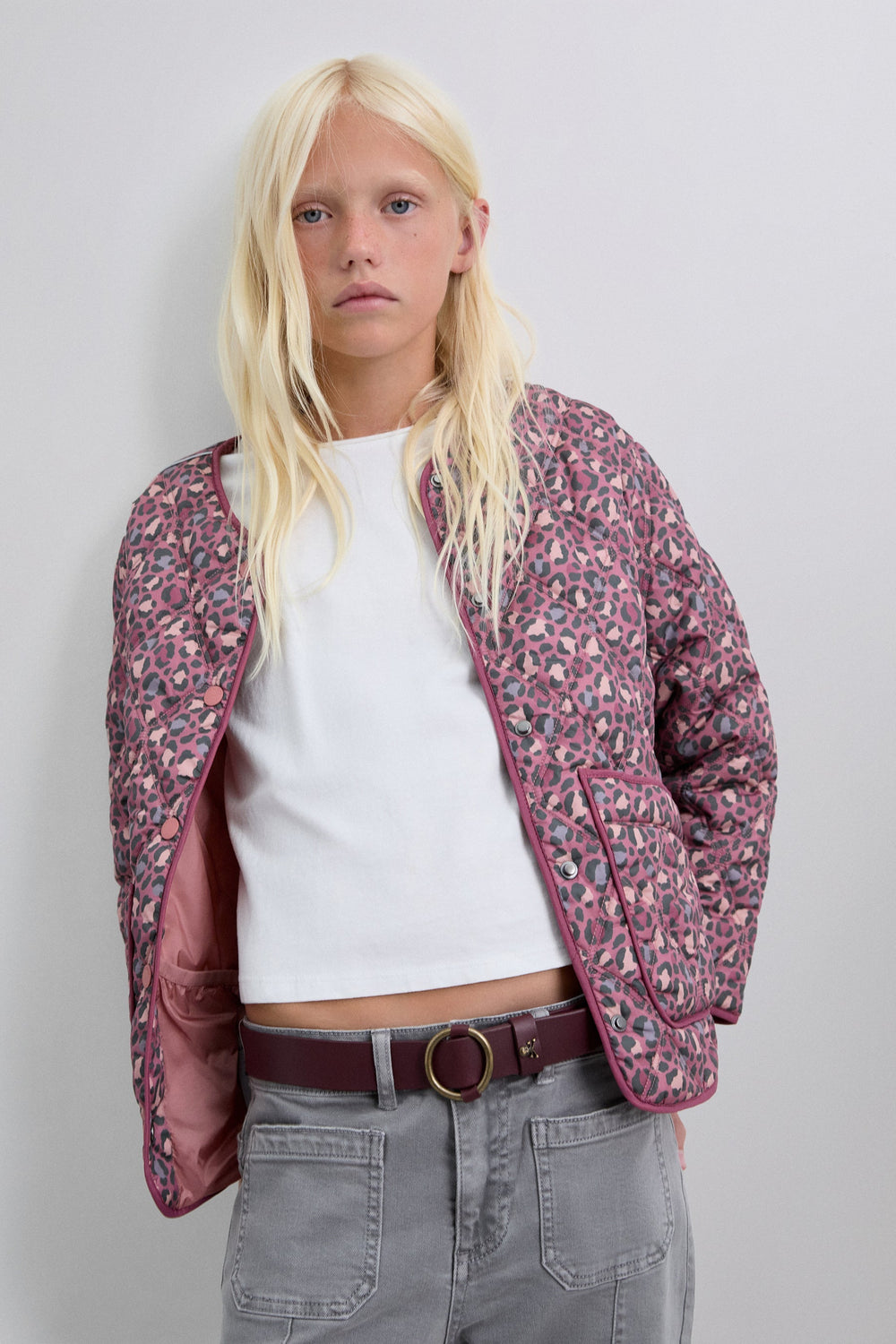 Puffer jacket made of a synthetic blend. Animal print. Button fastening. Slightly V-neck. Long sleeves. Two front pockets.