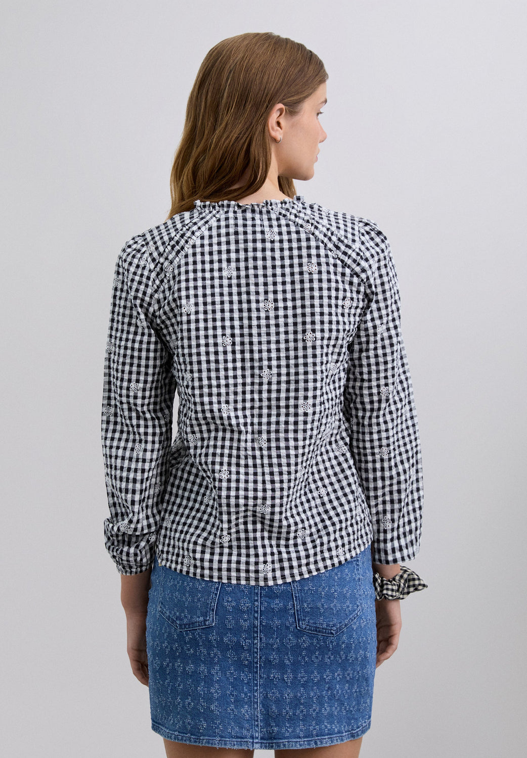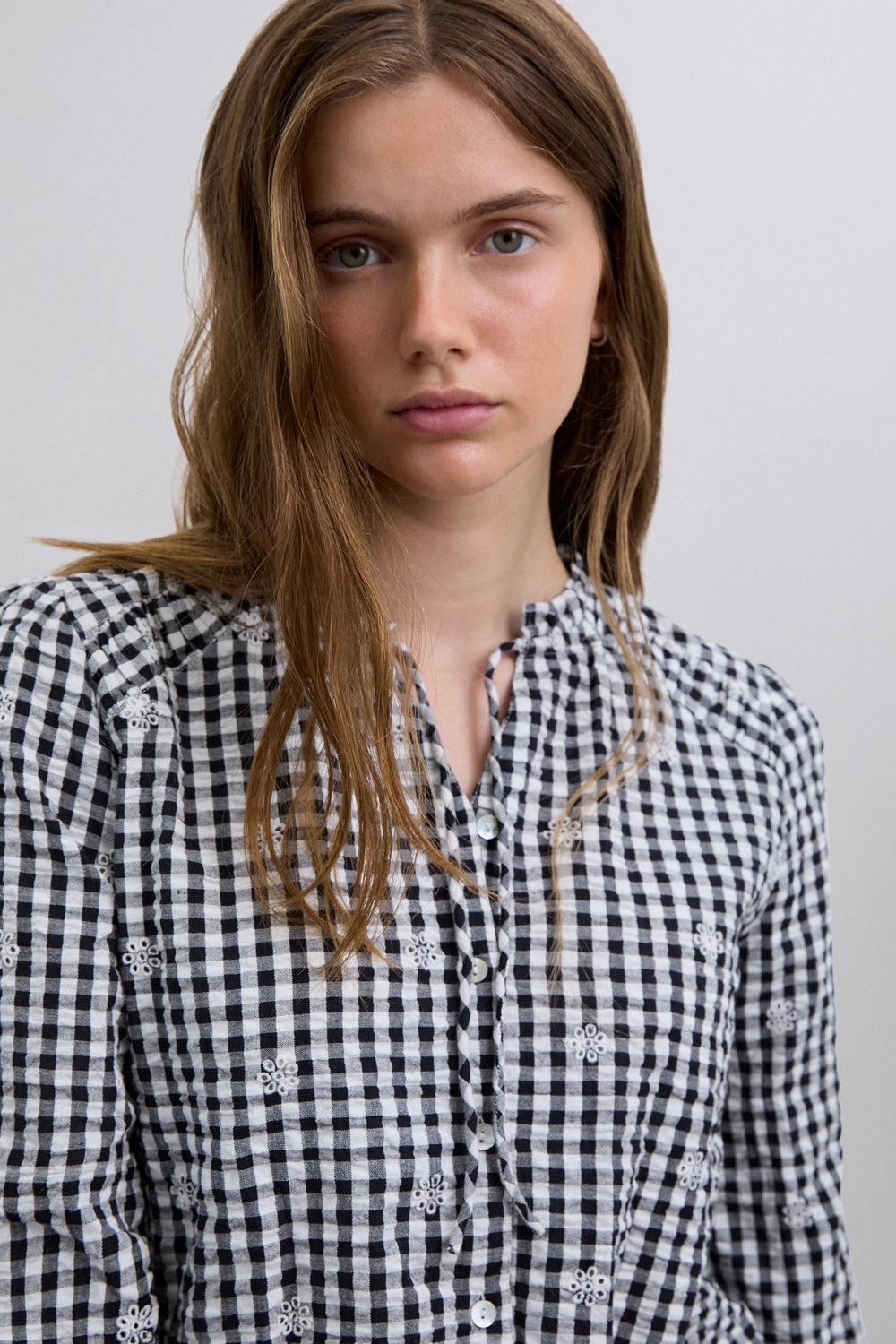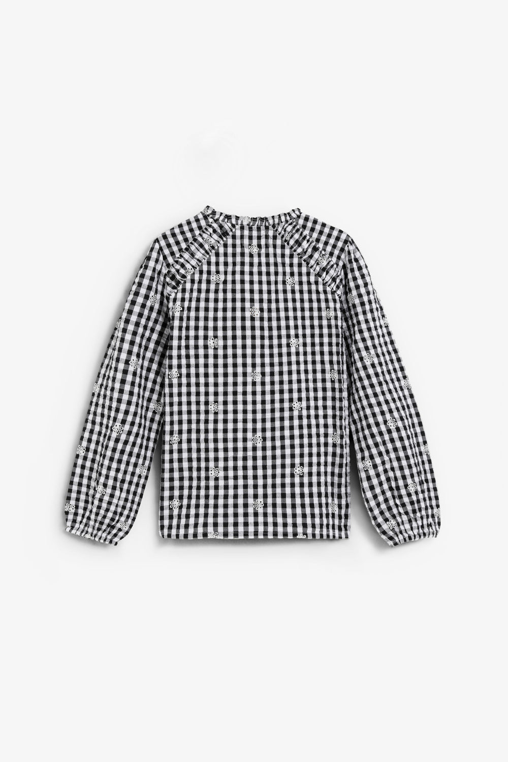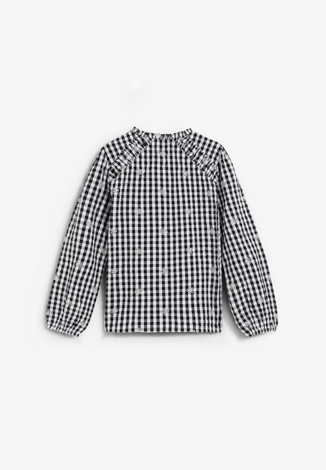 Chemise 100 % coton BCI. Manches longues. Col fermé par un lien devant et boutons. Détails brodés.