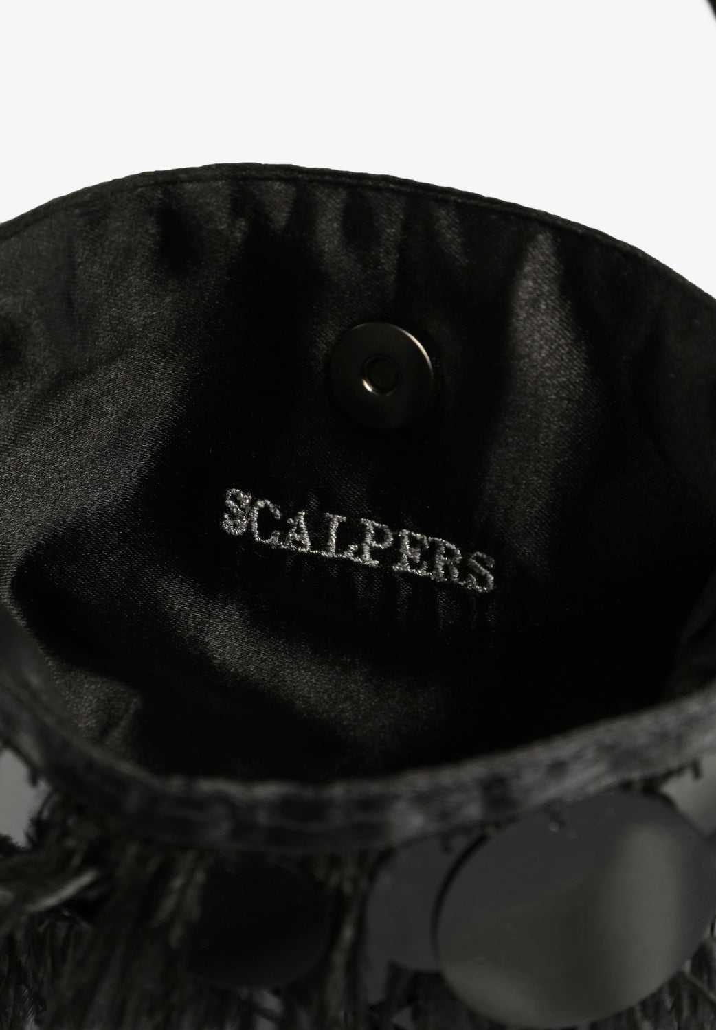 Bolso de mano confeccionado con plumas y lentejuelas. Forro interior con cierre de botón de snap.