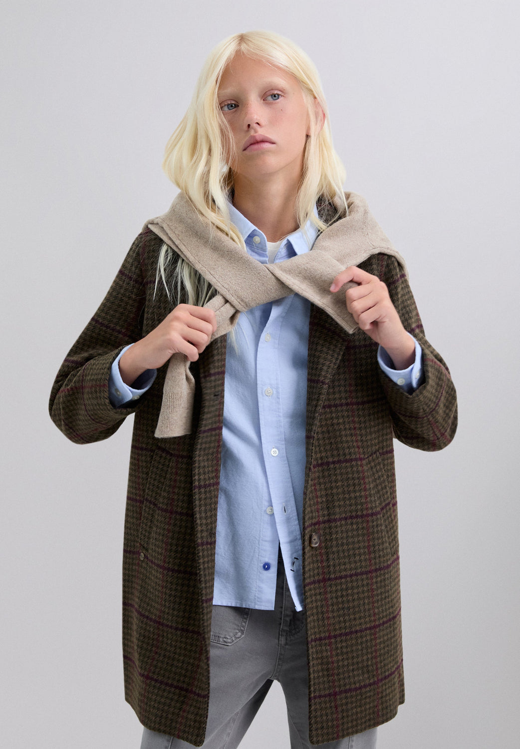 Manteau à carreaux. Col à revers. Fermeture boutonnée. Manches longues. Poches passepoilées à rabat.