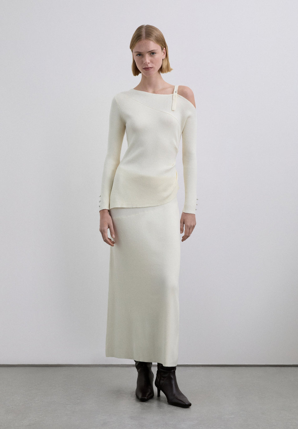 Pull en maille côtelée avec encolure asymétrique et manches longues. Il présente des plis sur la couture latérale gauche et une fente au bas du côté droit. Boutons rectangulaires argentés sur l’épaule et les poignets.