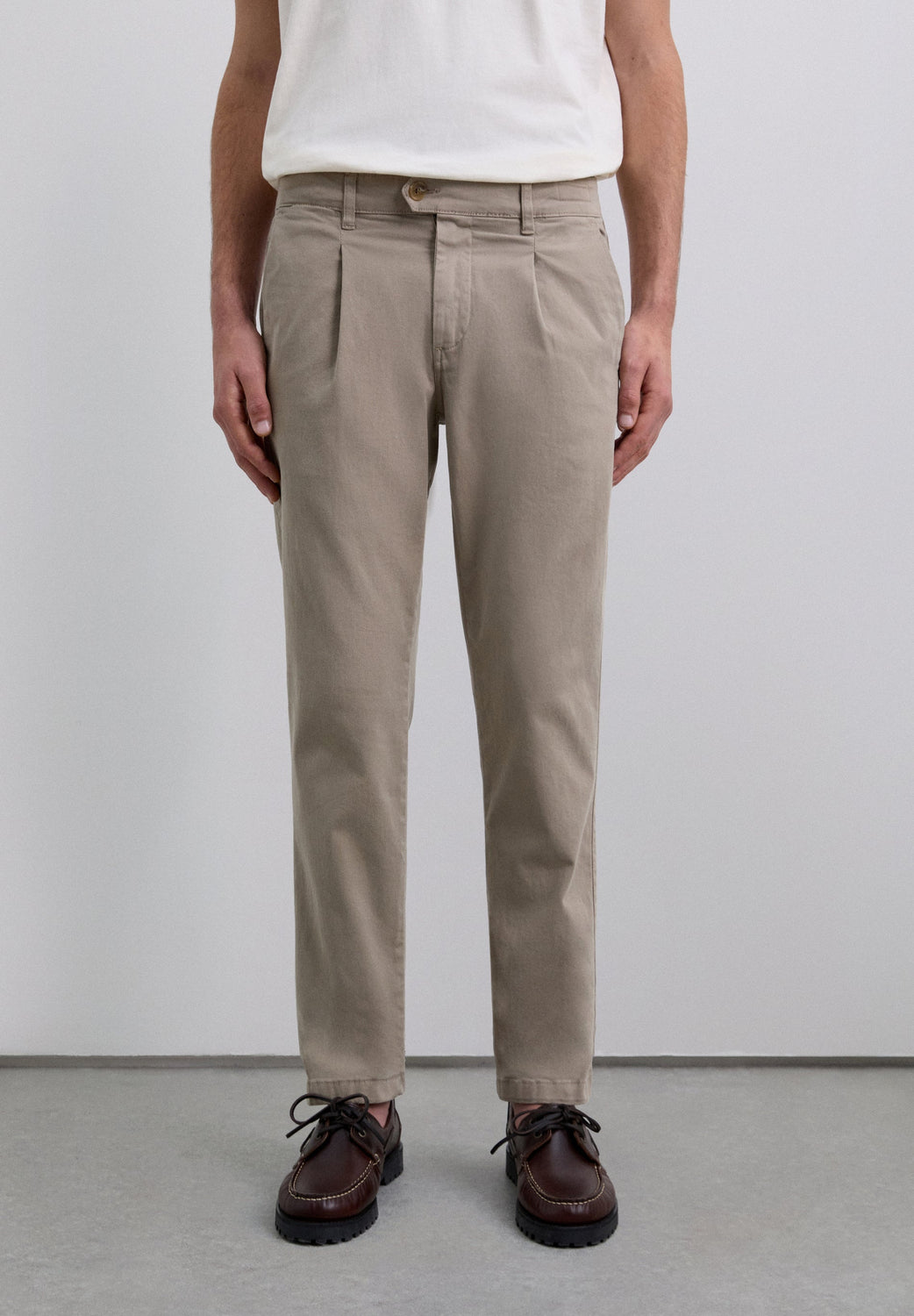 Trousers made of BCI cotton. With darts. Side pockets. Pockets at the back. Front zip and button fastening.