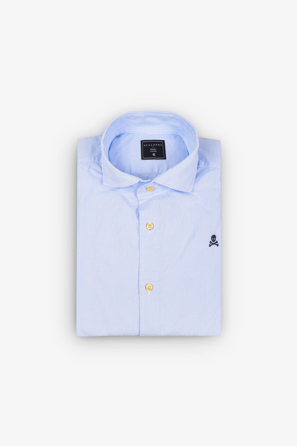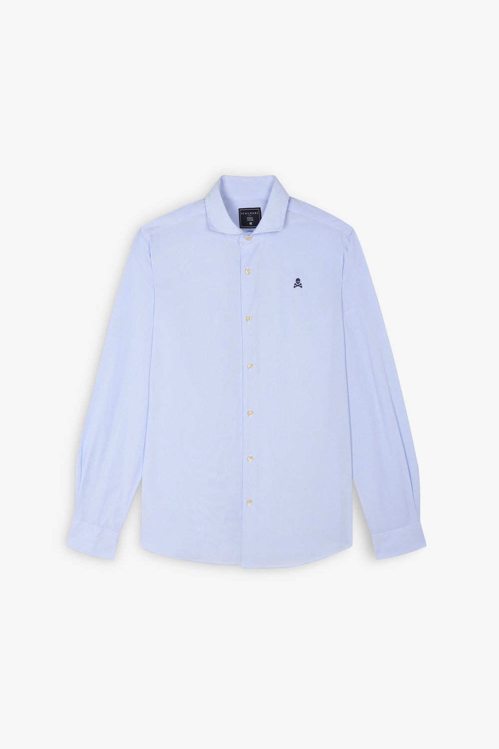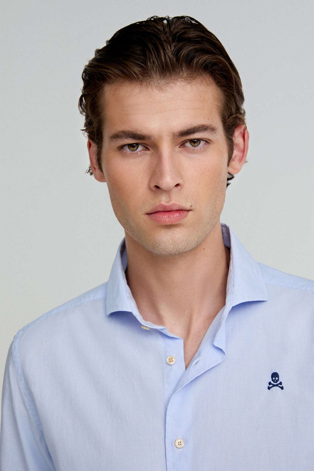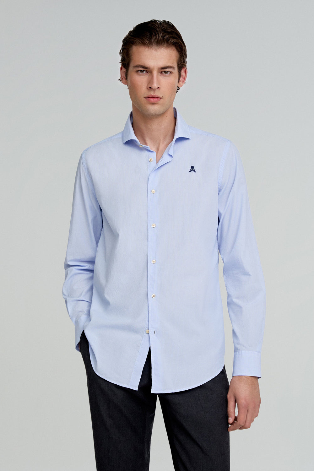 Chemise habillée unie. 100 % coton. Coupe droite. Col cutaway. Fermeture boutonnée. Manches longues et poignets simples. Skull brodé sur la poitrine.