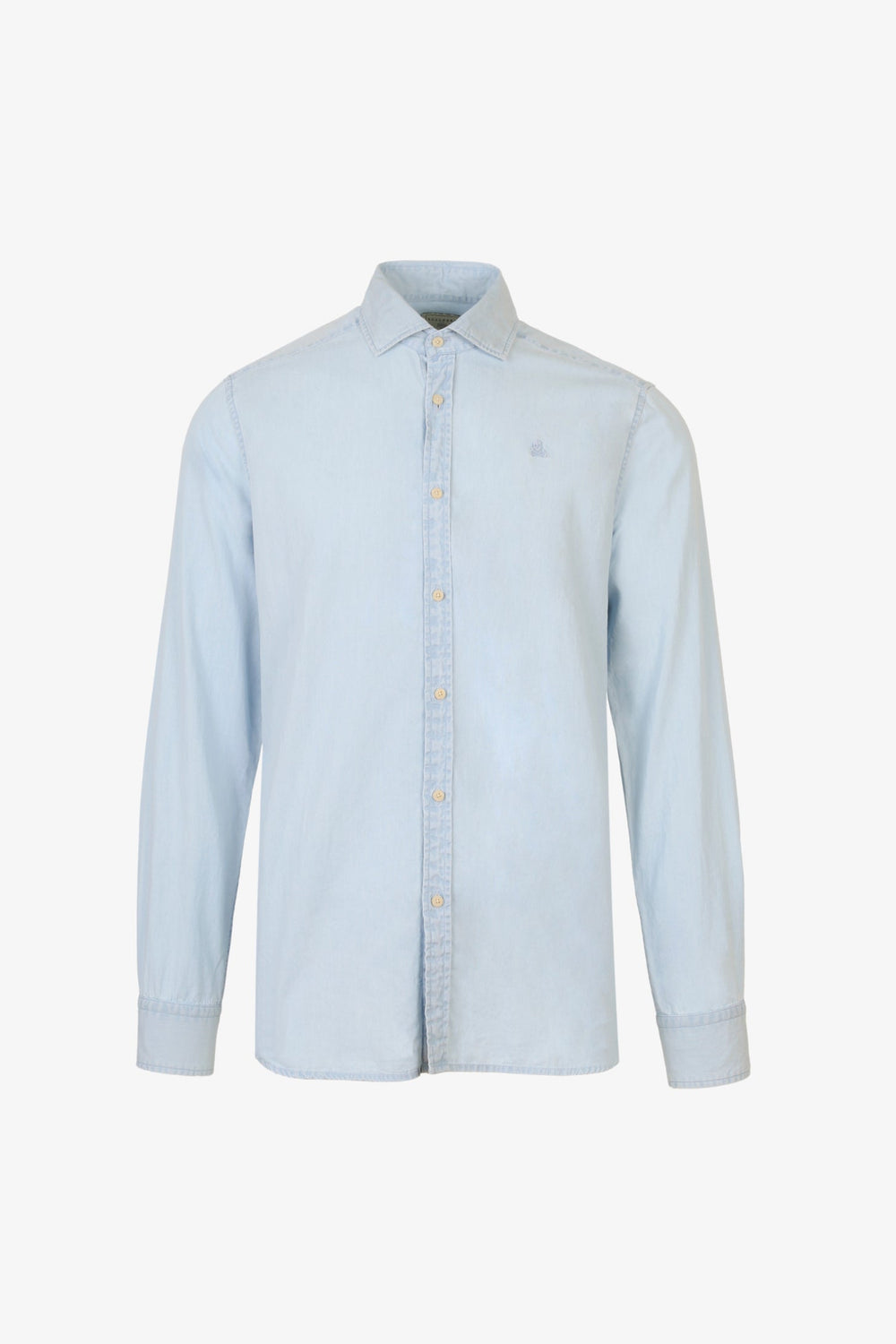 Denim shirt. Regular fit, Italian collar with collar stays and button fastening. Long sleeves with cuffs and matching embroidered skull detail on the chest.