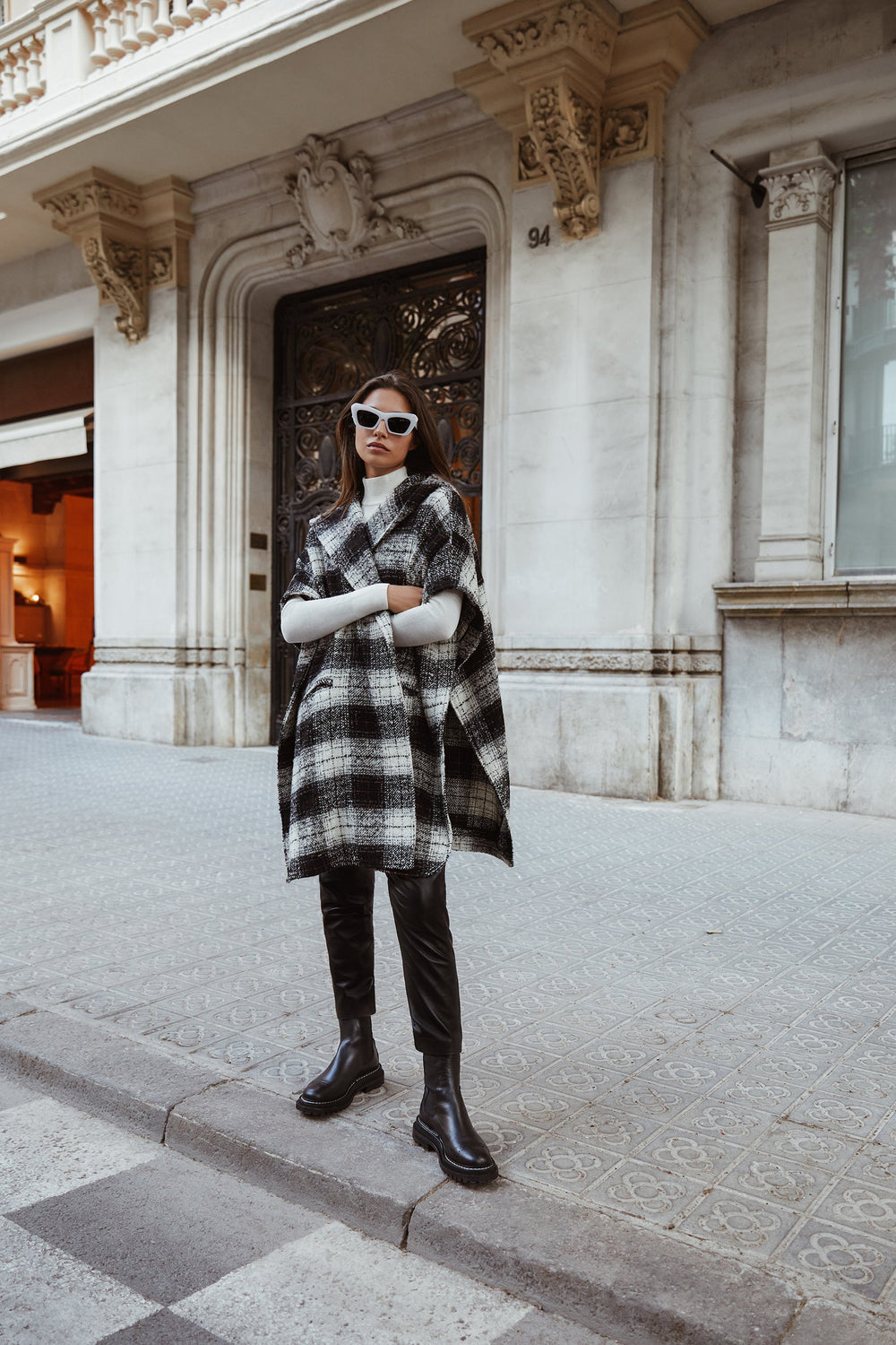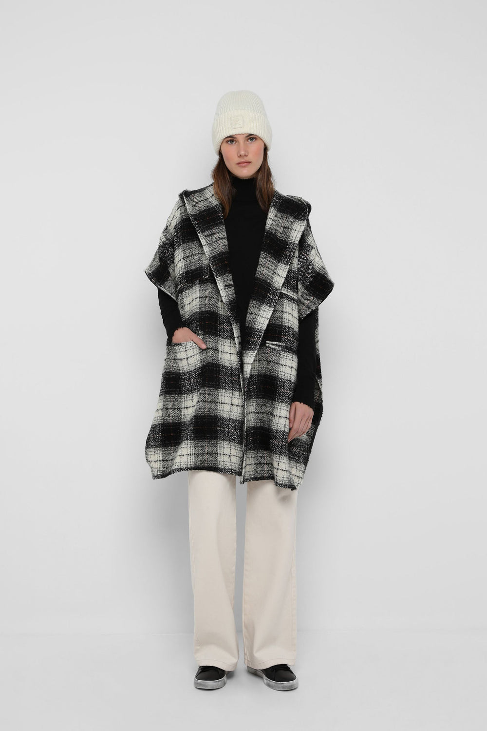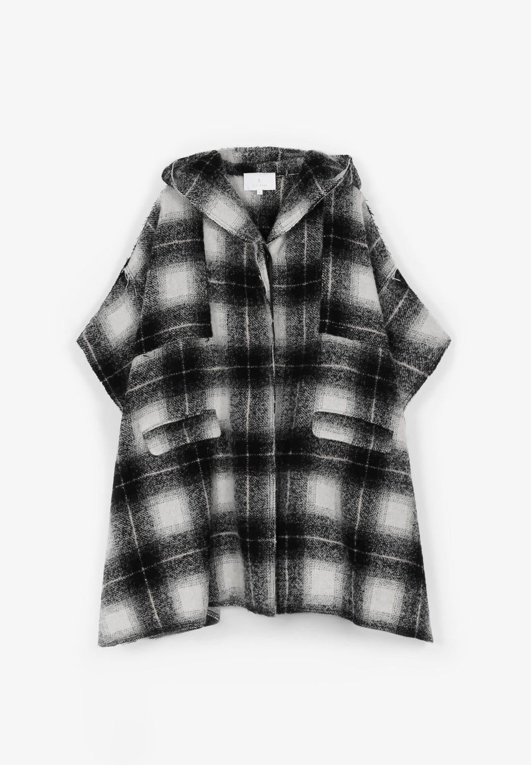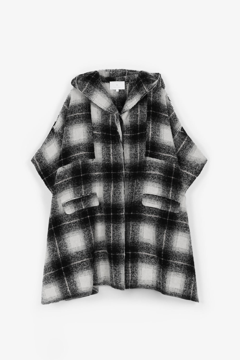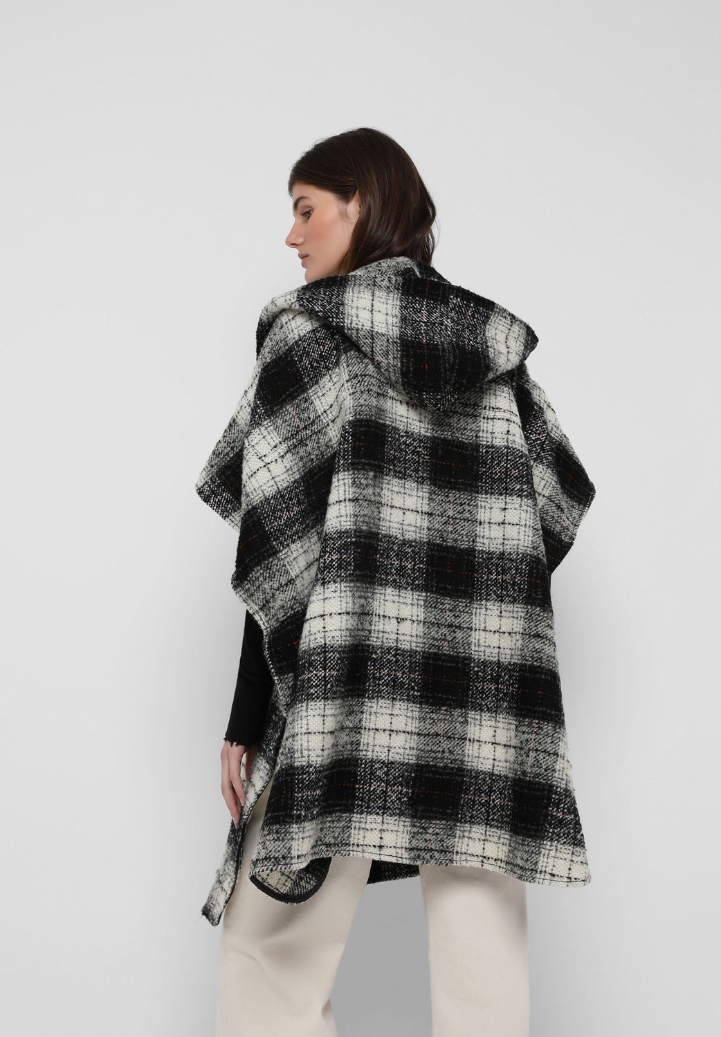 Cape-style check coat made of a wool and cotton blend. Oversize cut, button fastening and hooded collar. Short sleeves and patch pockets.