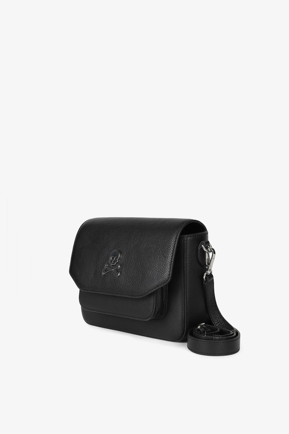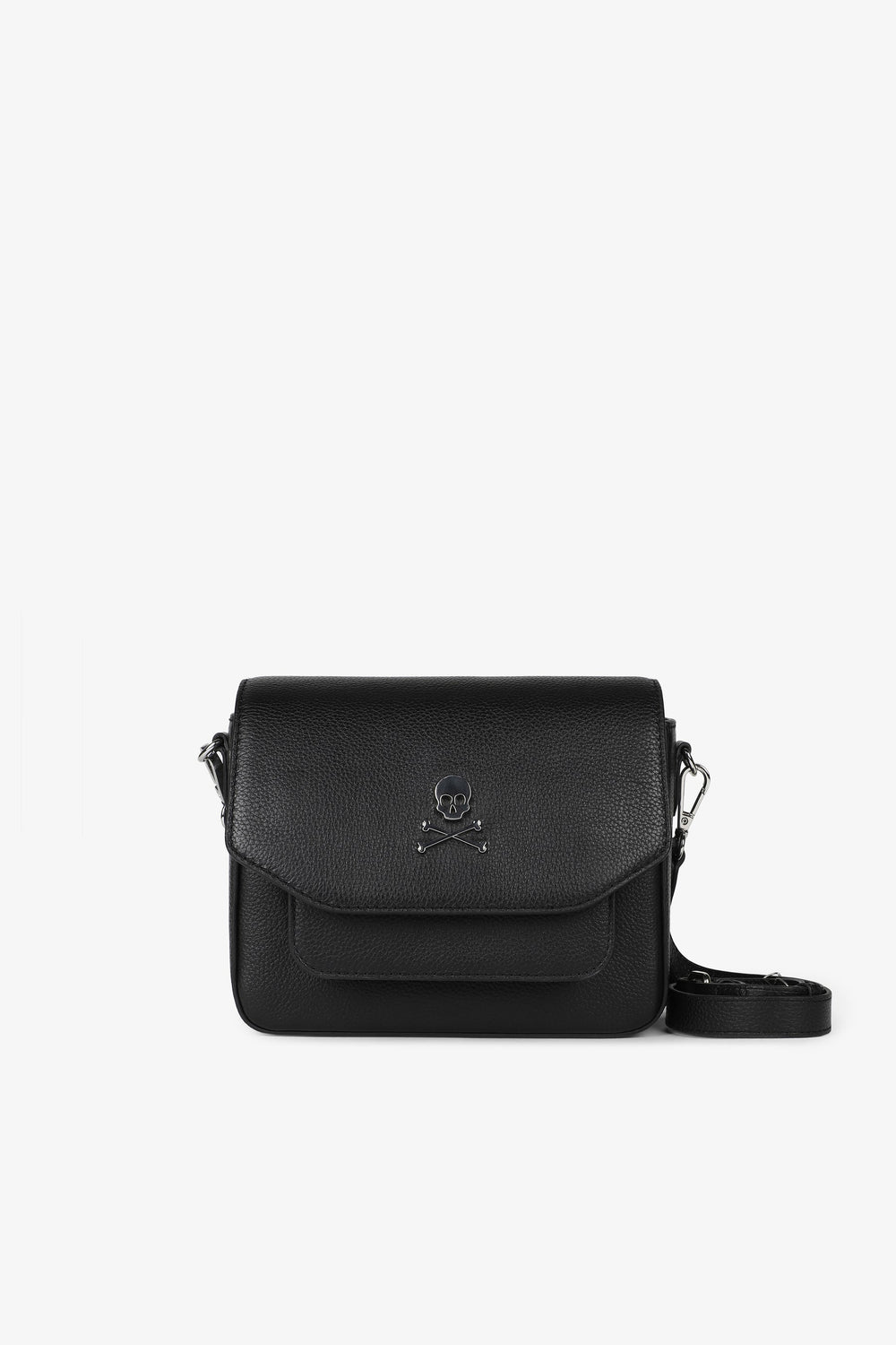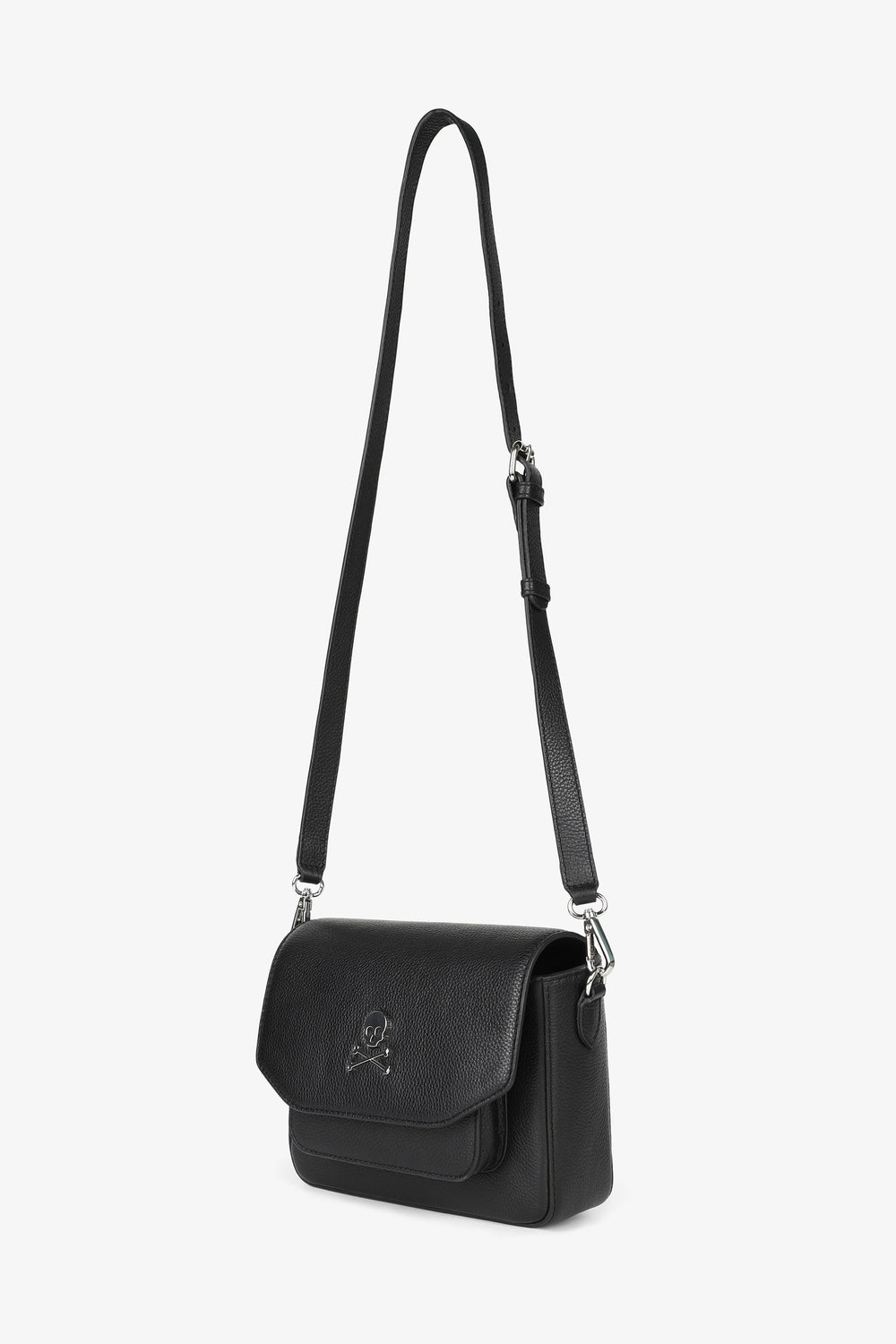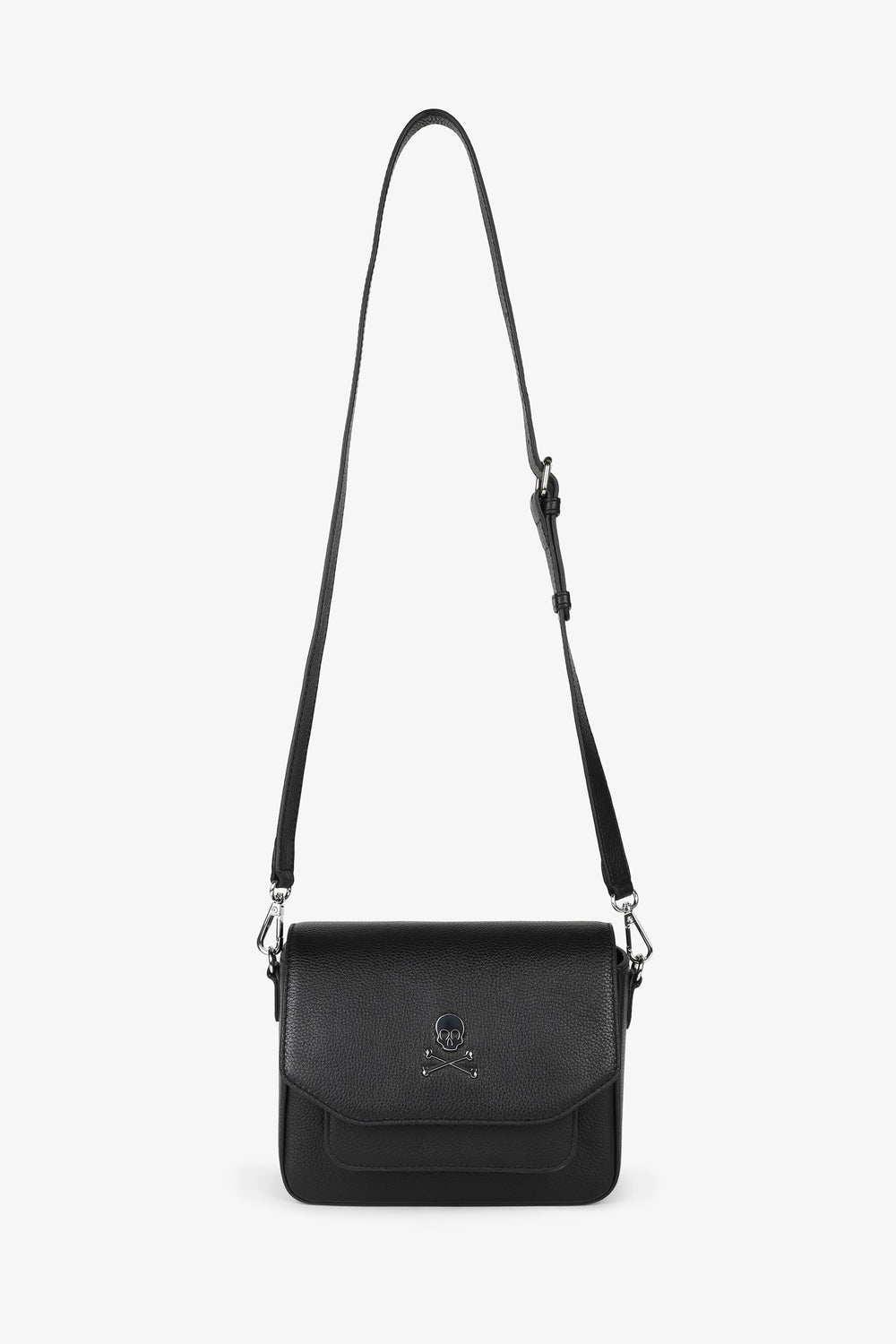 Leather bag with metal skull made from 100% leather. Snap clasp, front pocket striker and long adjustable strap.