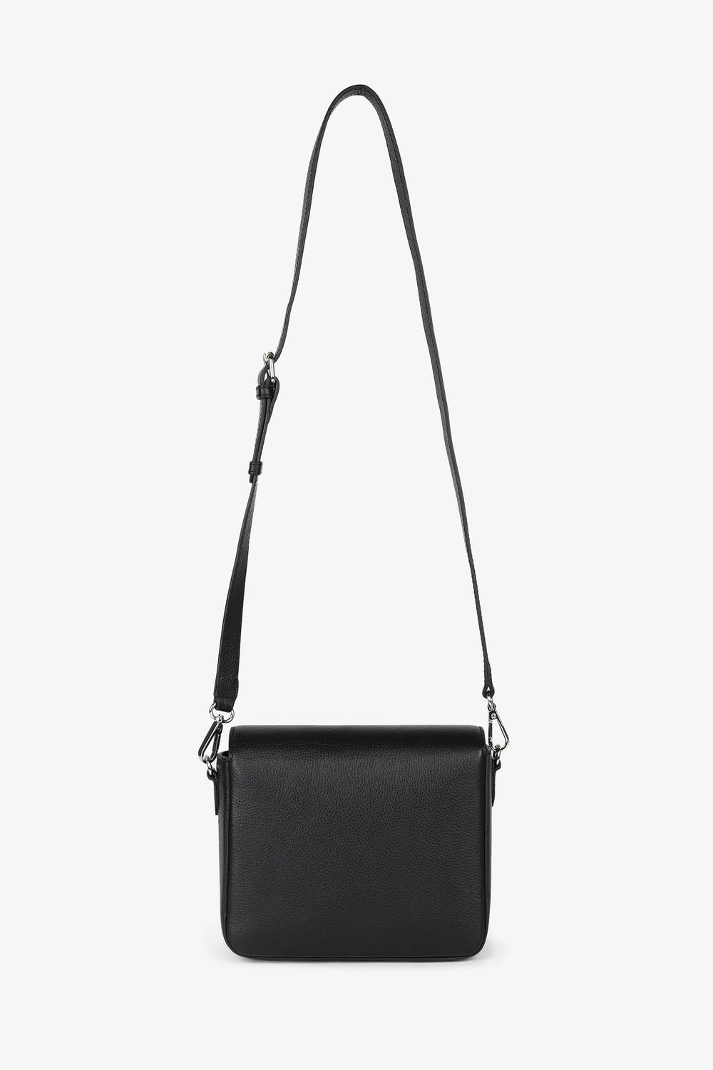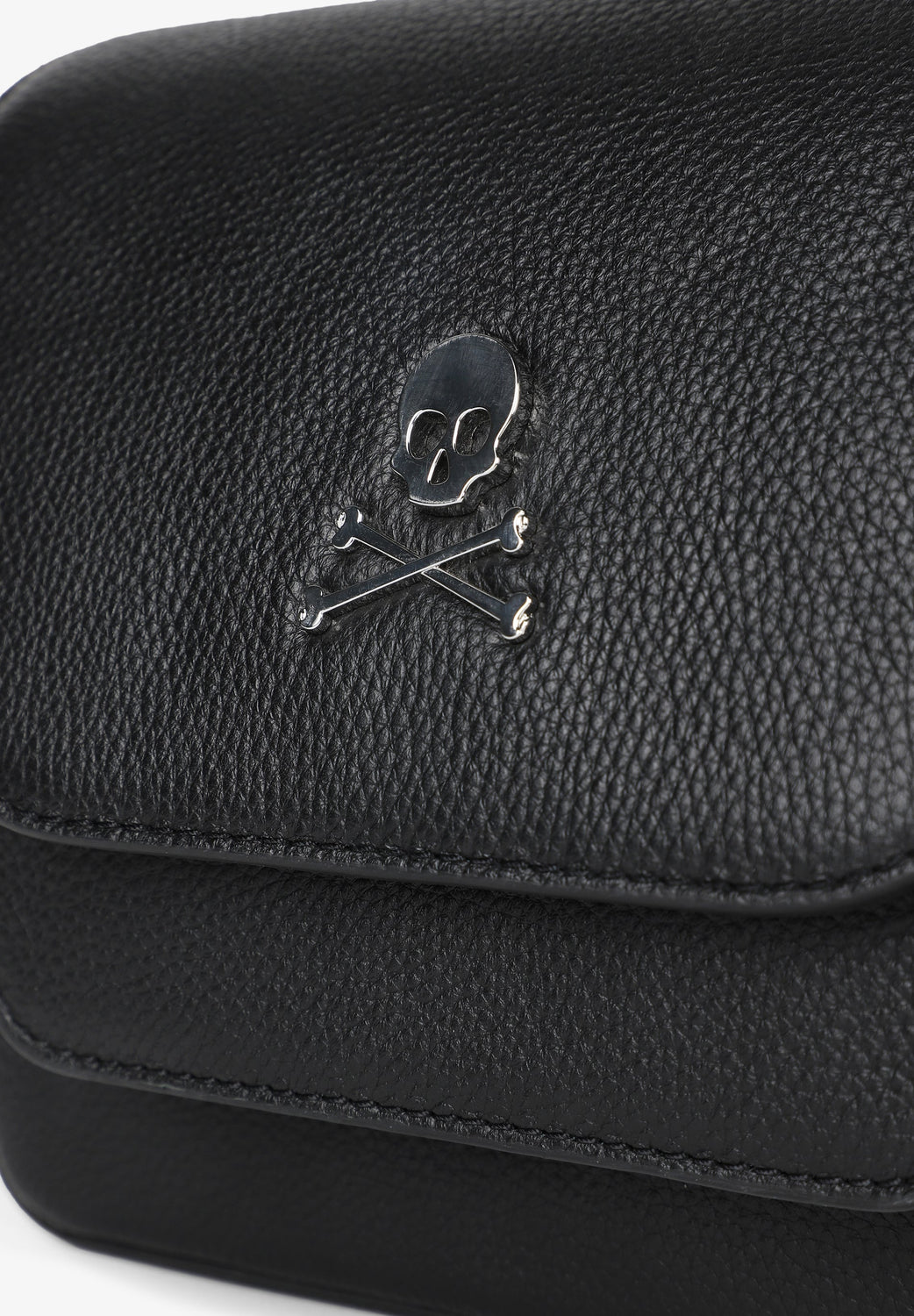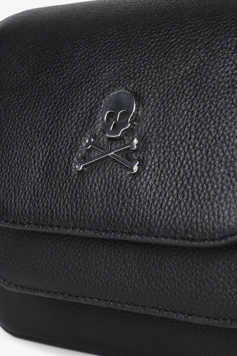 Leather bag with metal skull made from 100% leather. Snap clasp, front pocket striker and long adjustable strap.