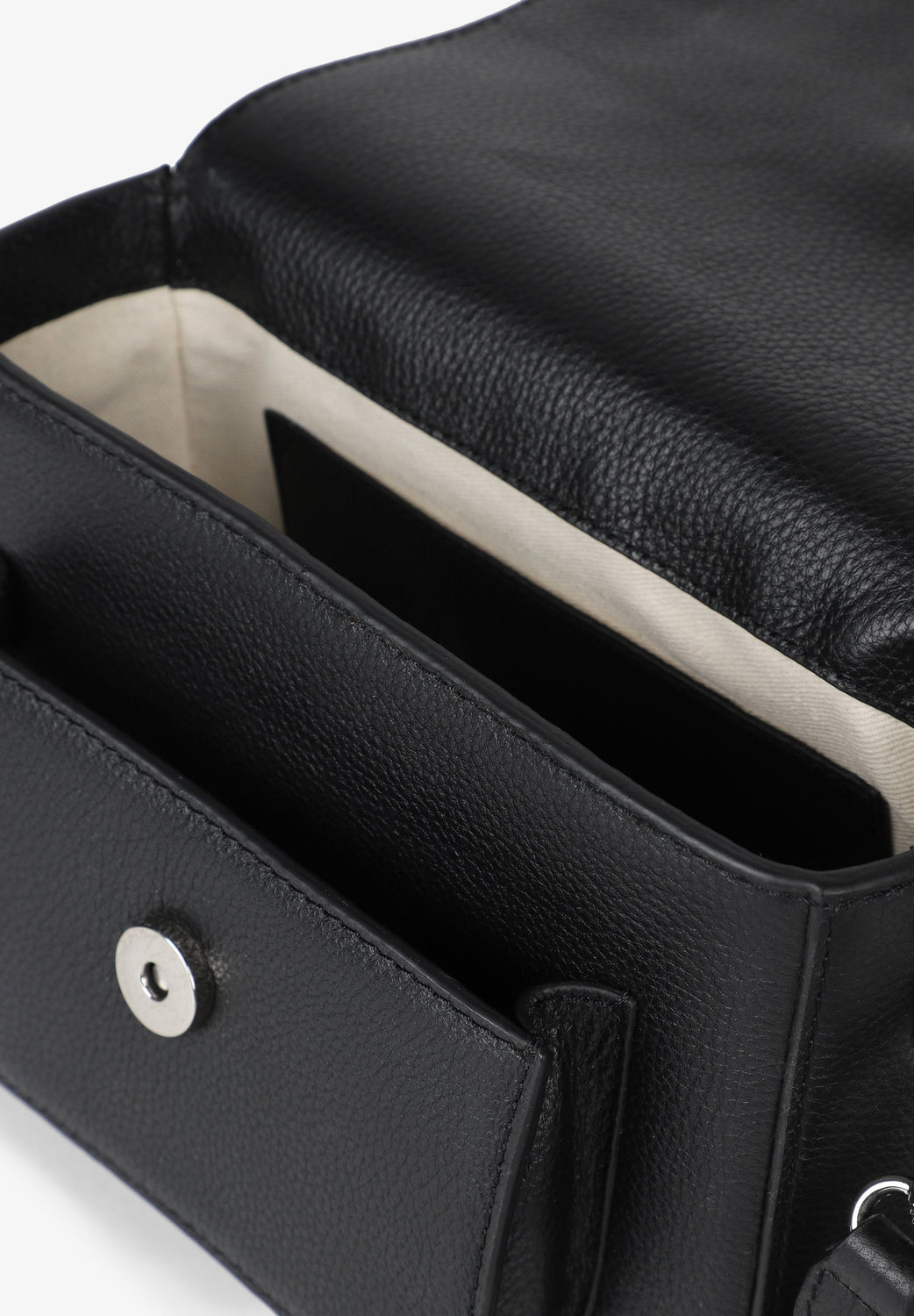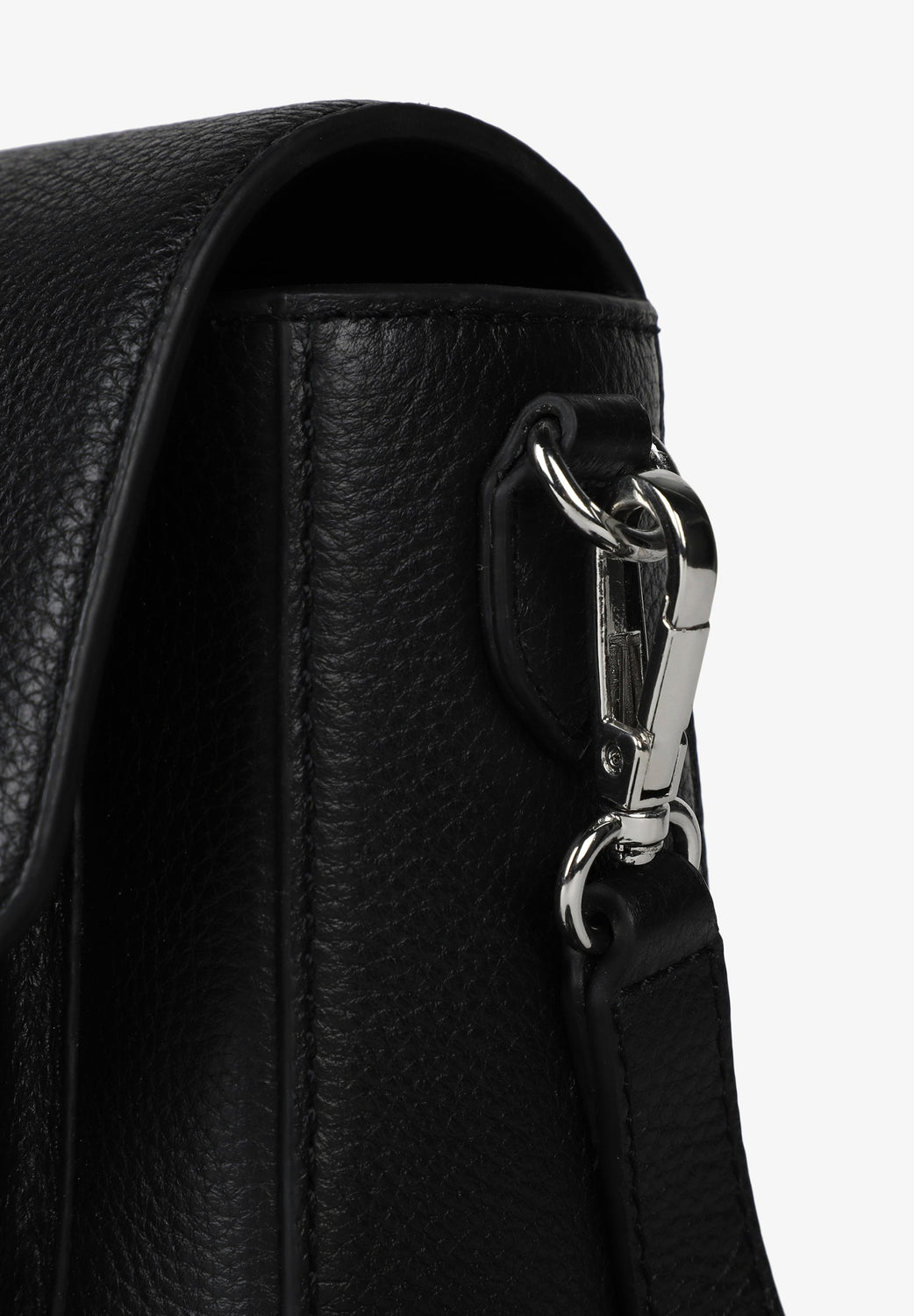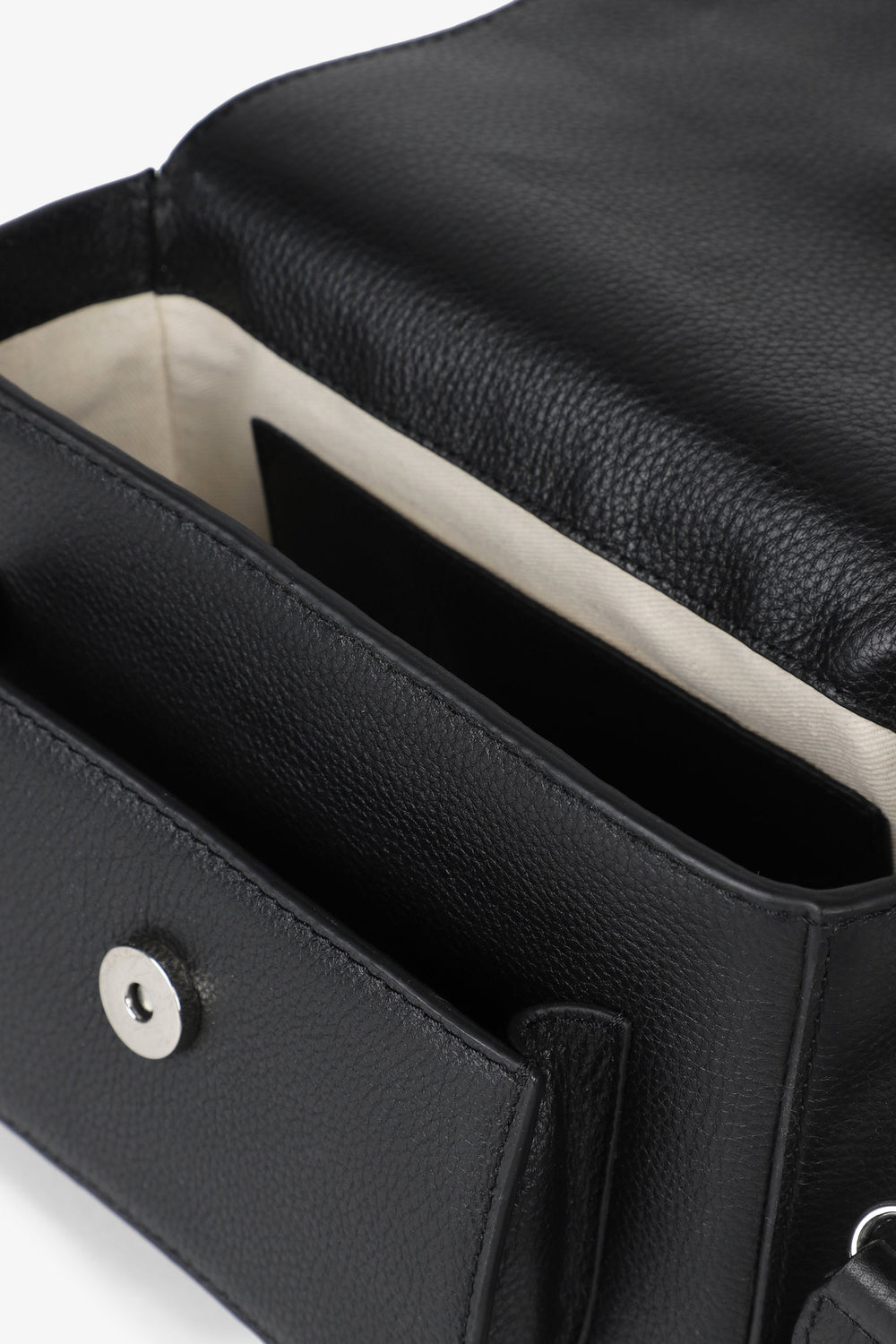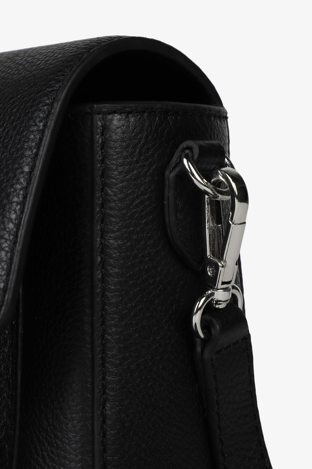 Leather bag with metal skull made from 100% leather. Snap clasp, front pocket striker and long adjustable strap.