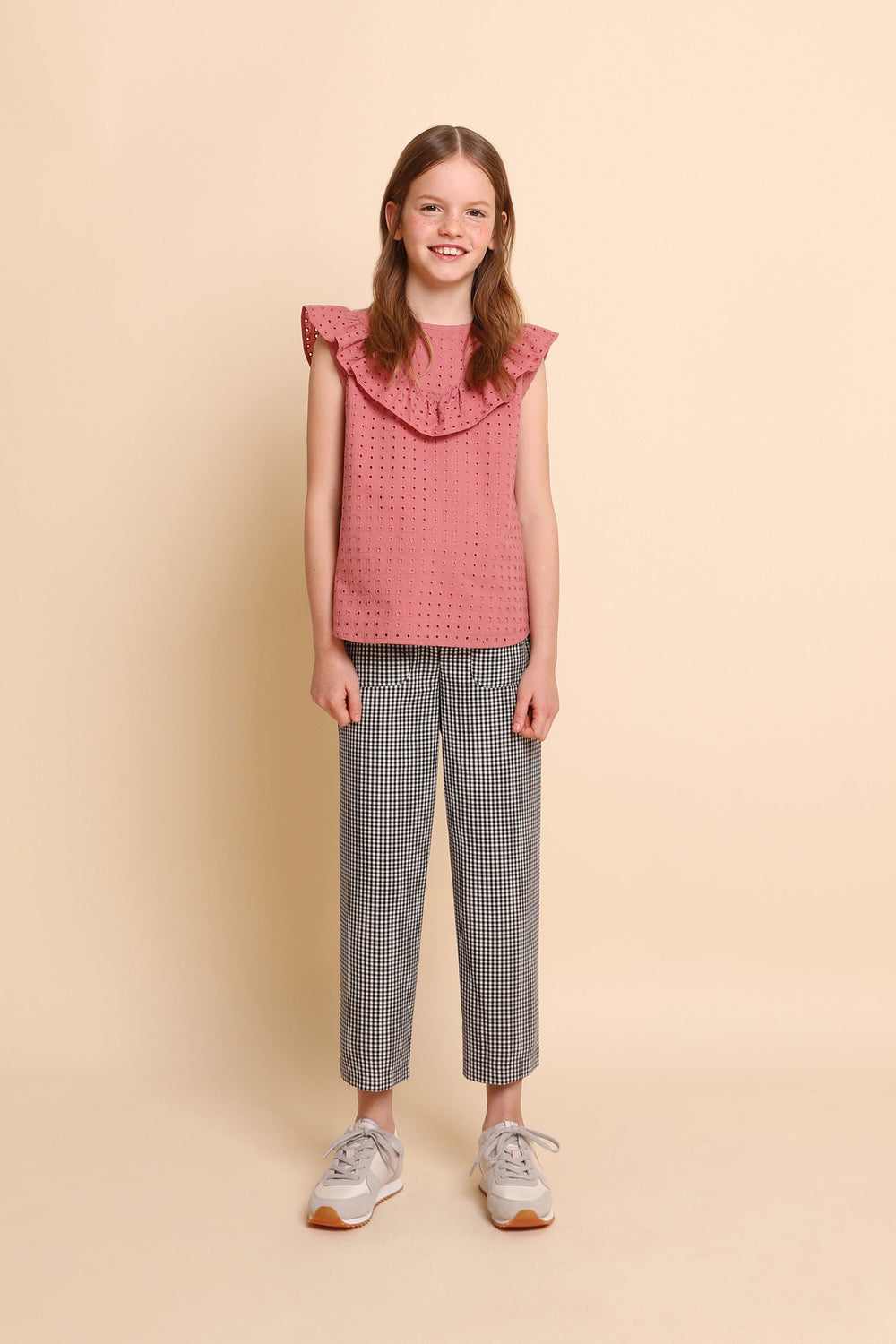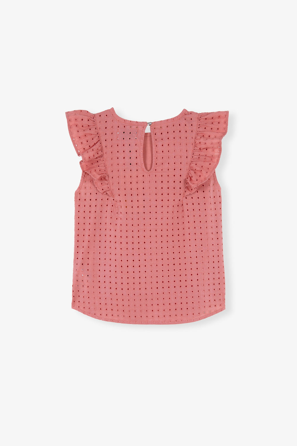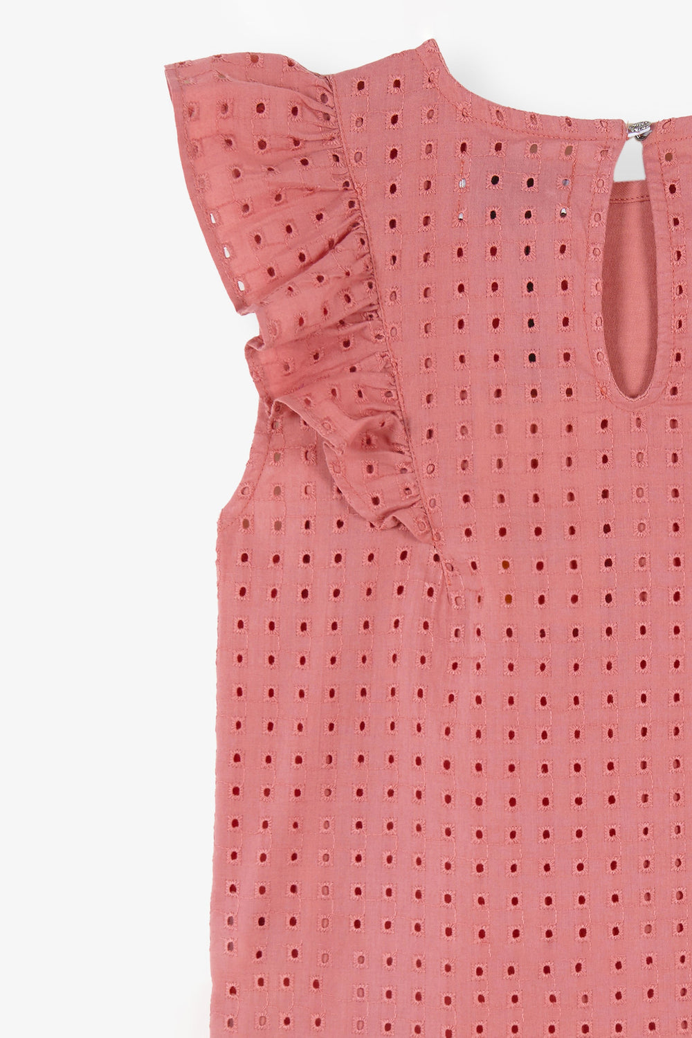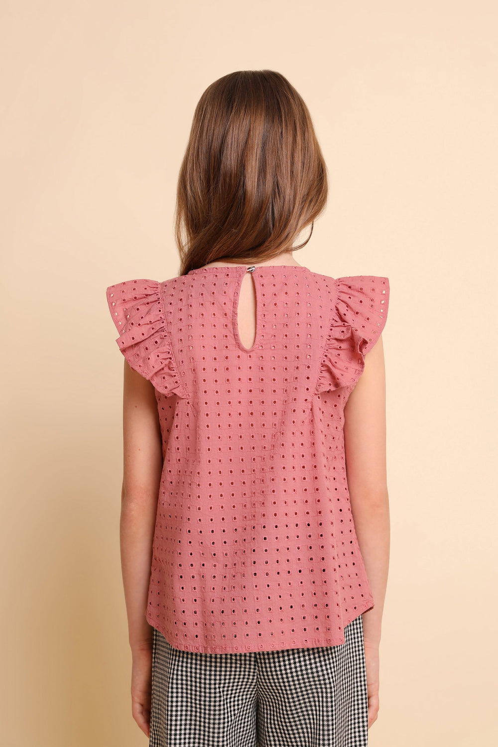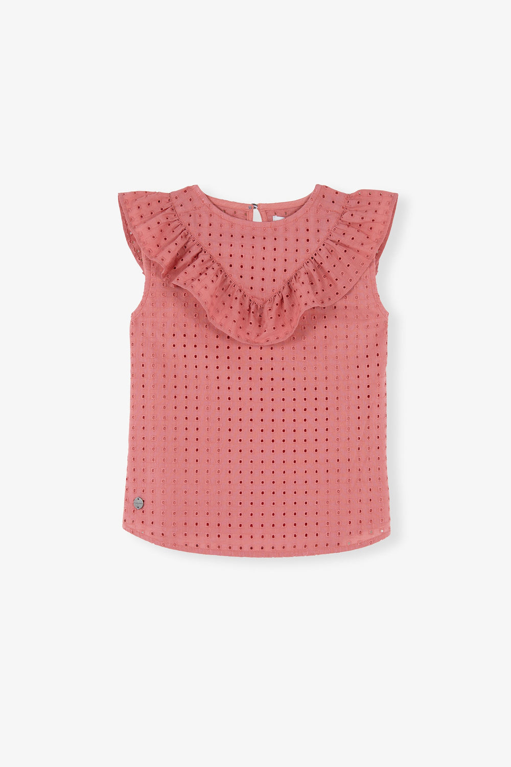 Perforated fabric shirt made of 100% organic cotton. Regular fit, round neck and sleeveless. Ruffle detail.