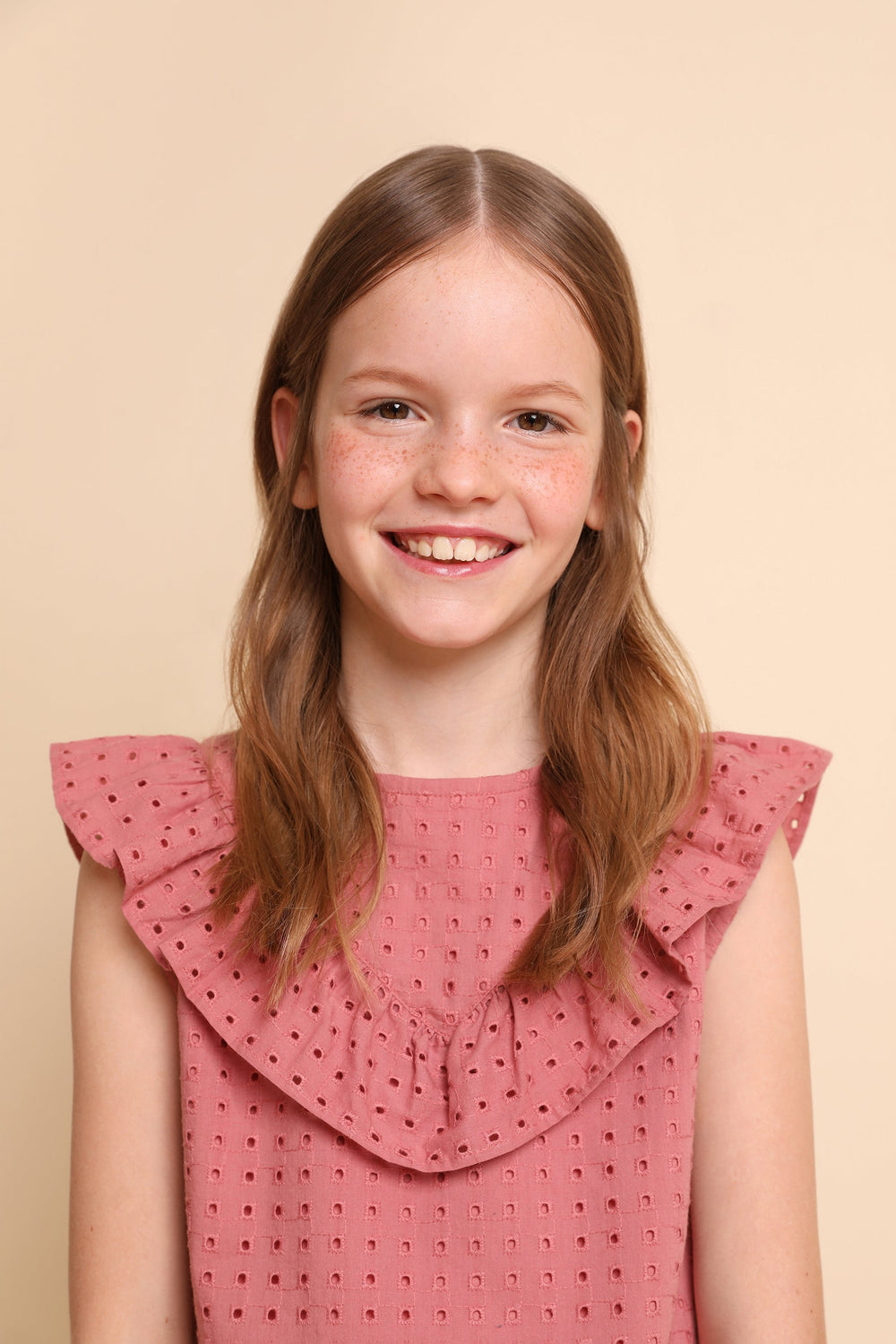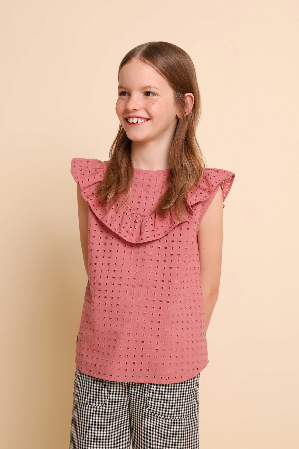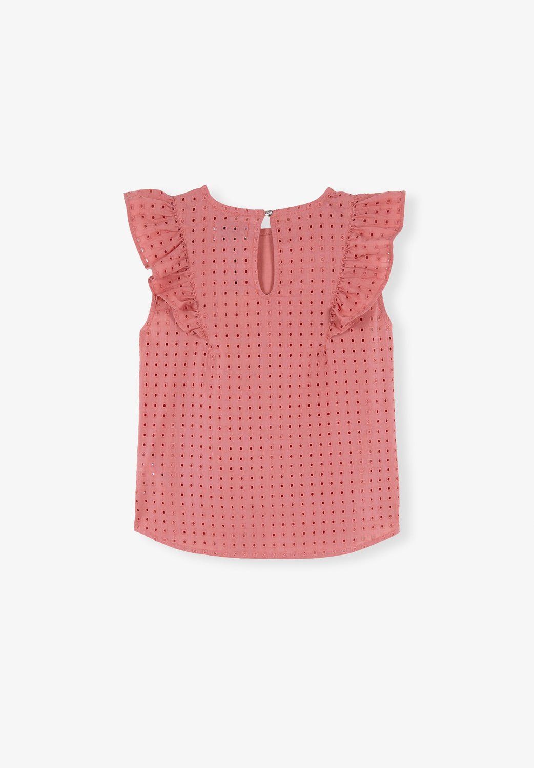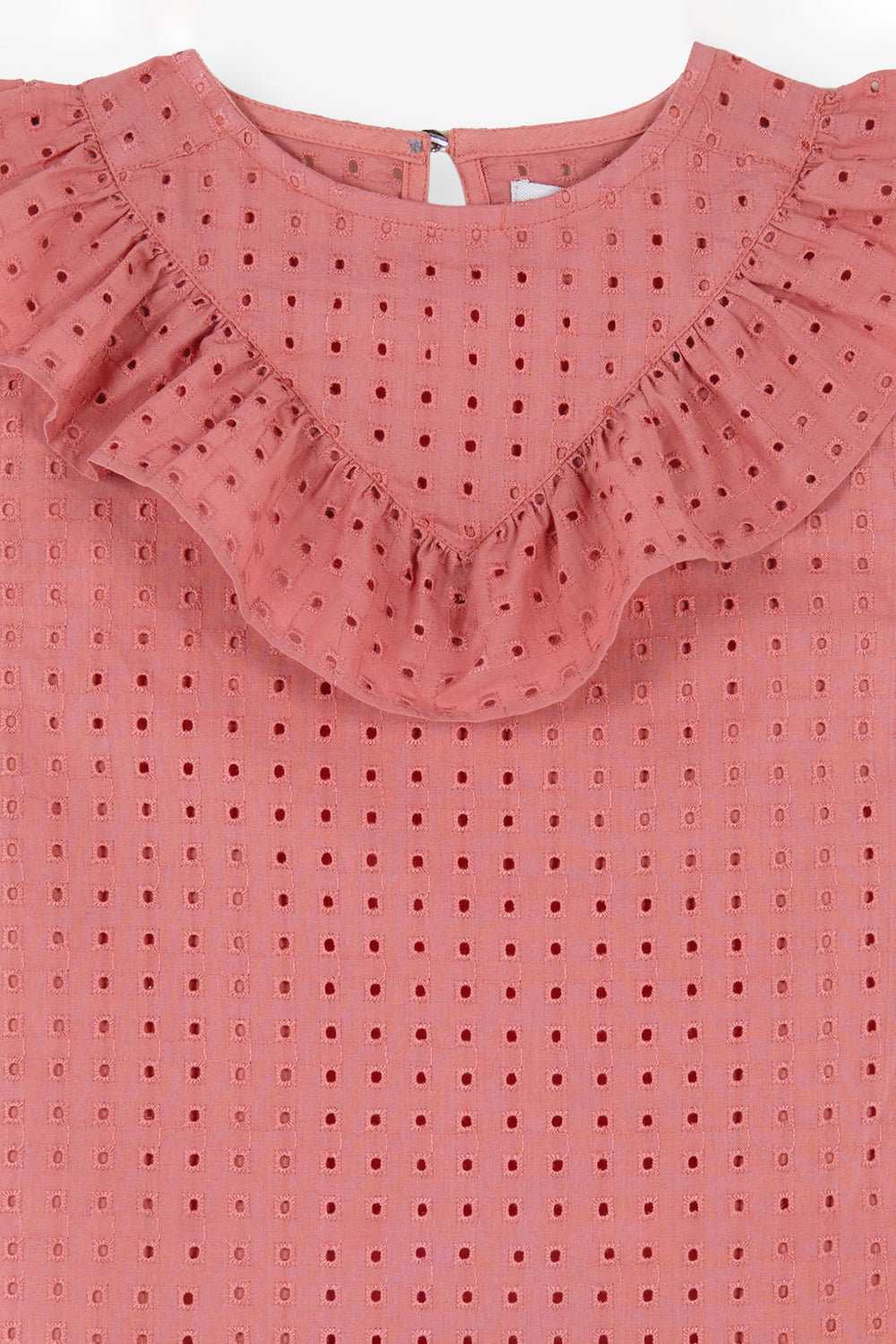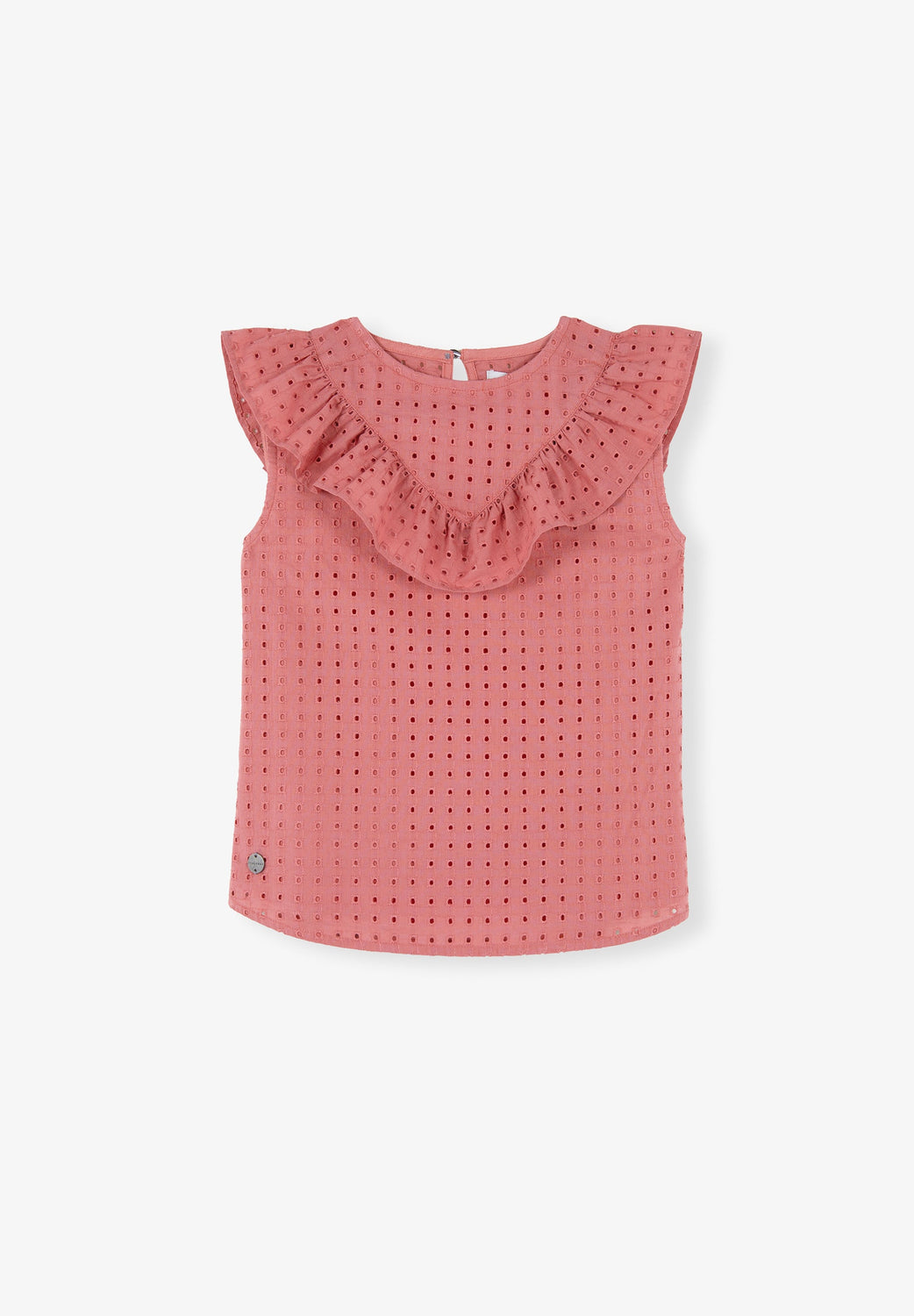 Perforated fabric shirt made of 100% organic cotton. Regular fit, round neck and sleeveless. Ruffle detail.