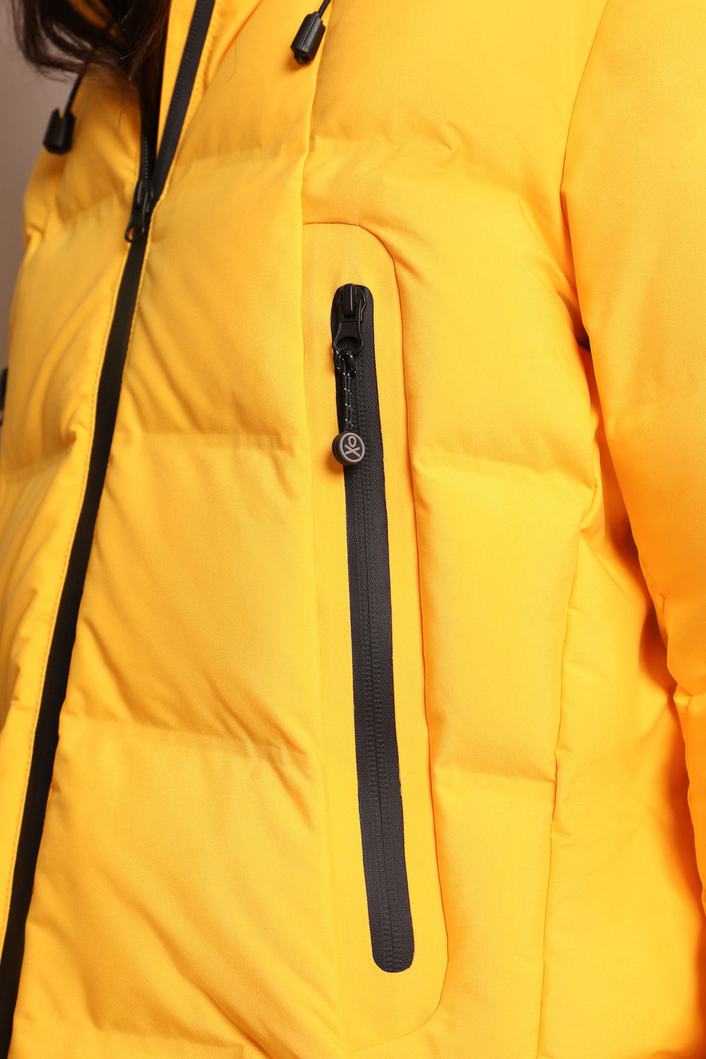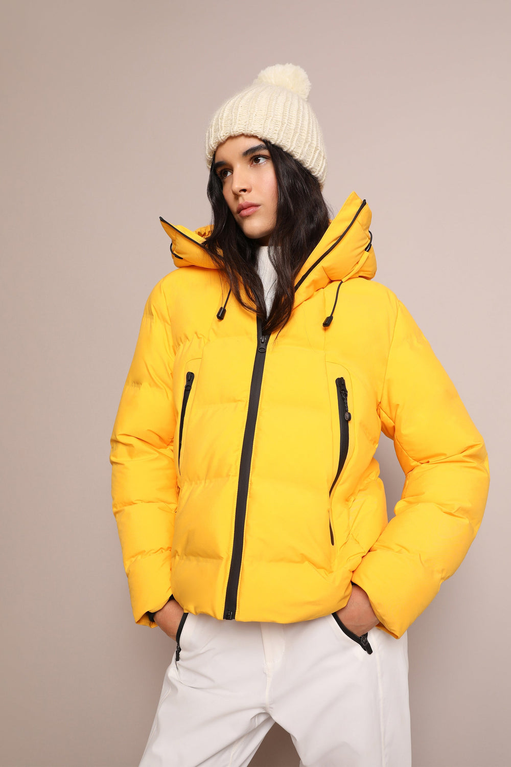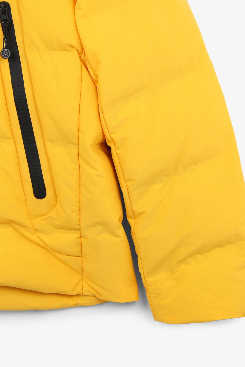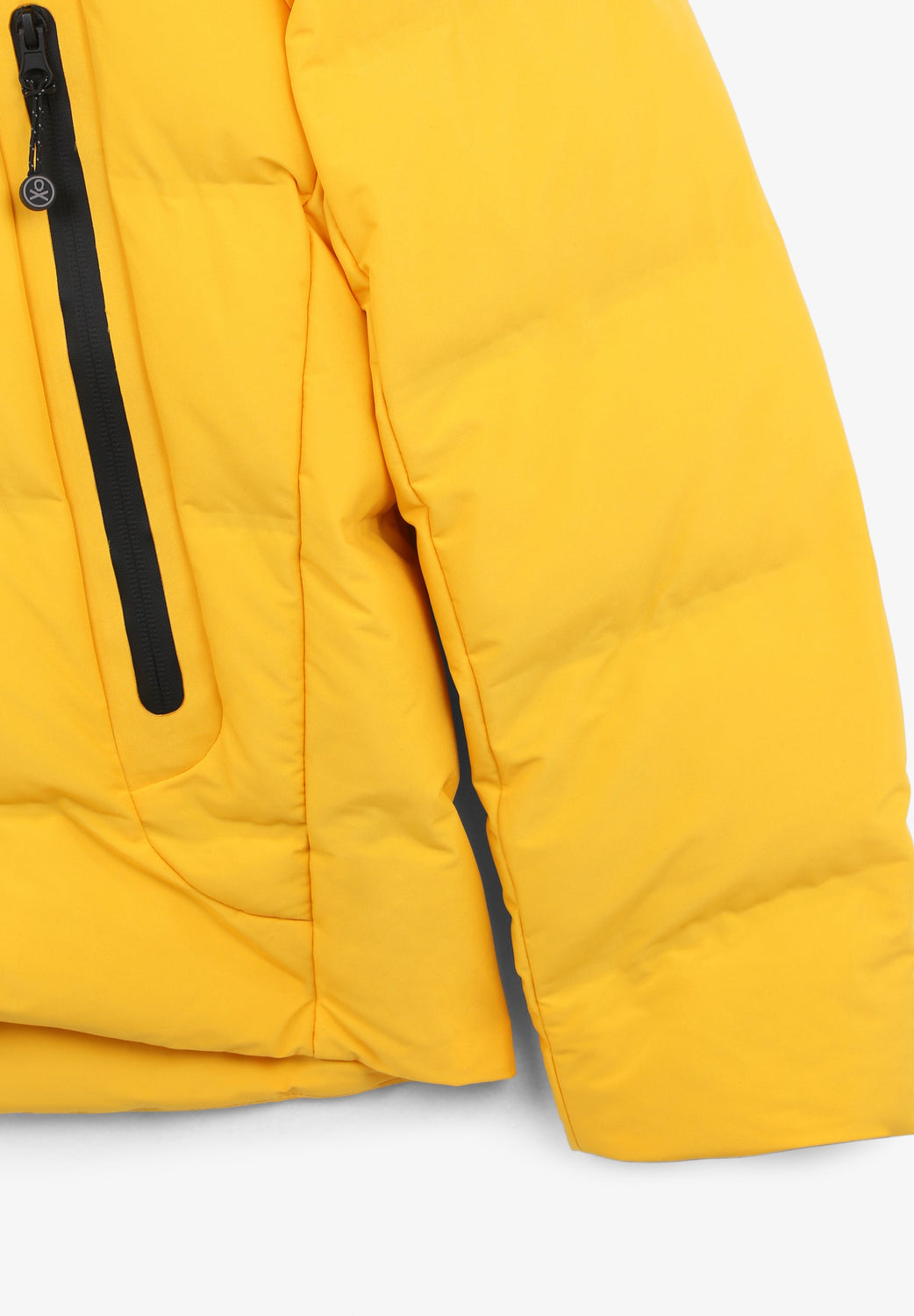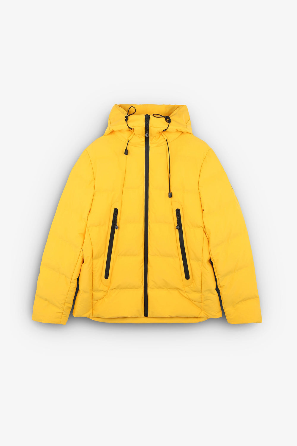 Padded technical ski jacket made of special technical fabric with windproof and waterproof properties. Regular fit cut, hooded collar with zip-fastening hood. Zip fastening. Thermo-sealed waterproof. Panel construction and heat sealed bands. Interior zipped security pocket, interior side mesh pockets, and oversized front pockets. Rubberised sleeve patch detail.