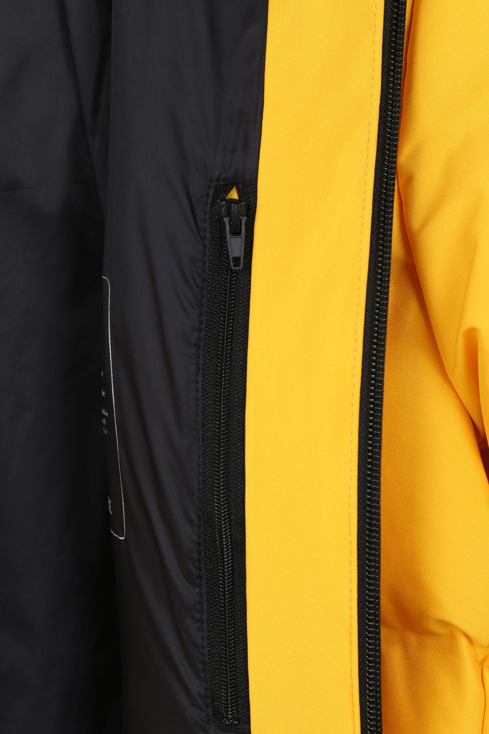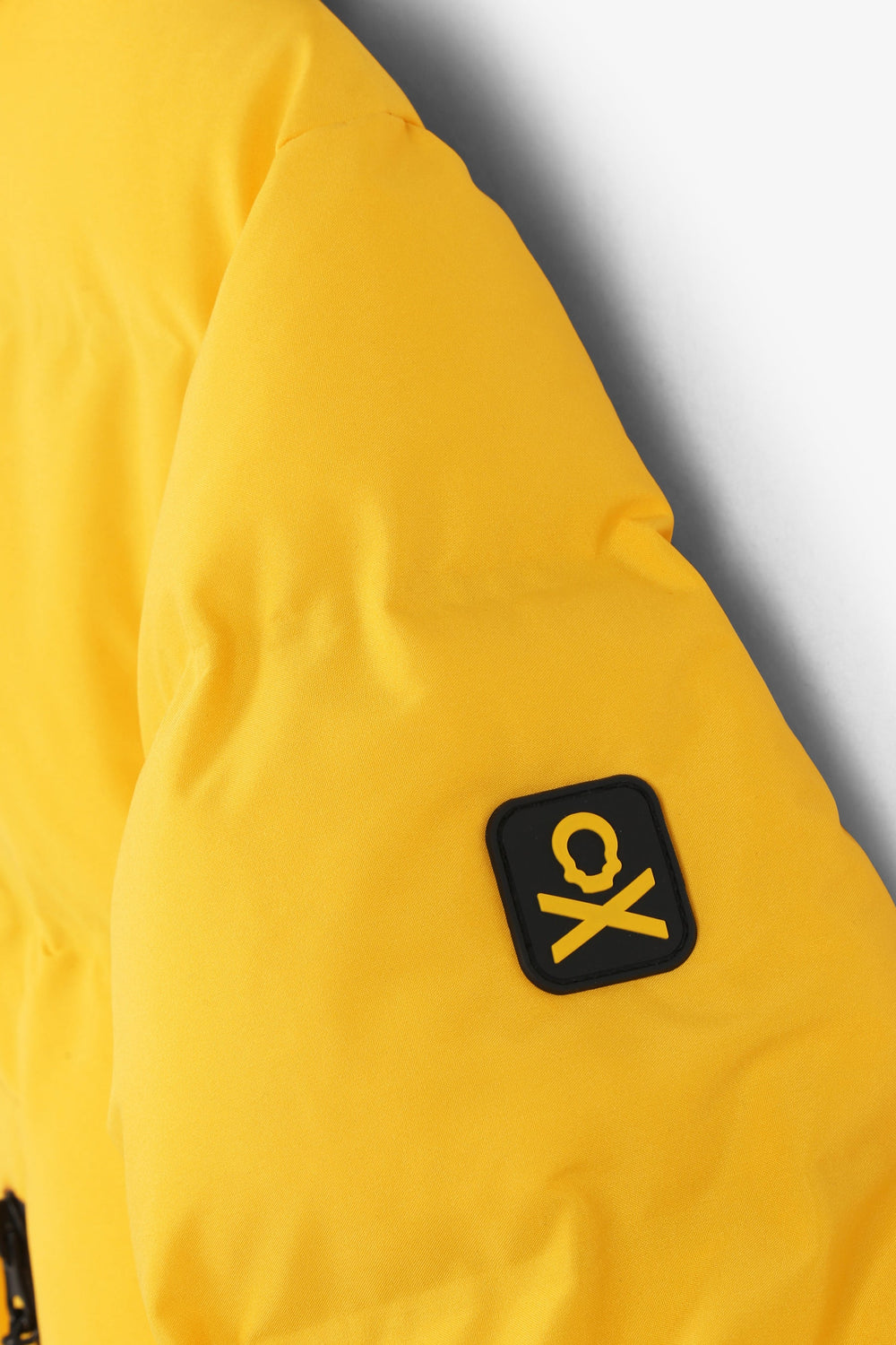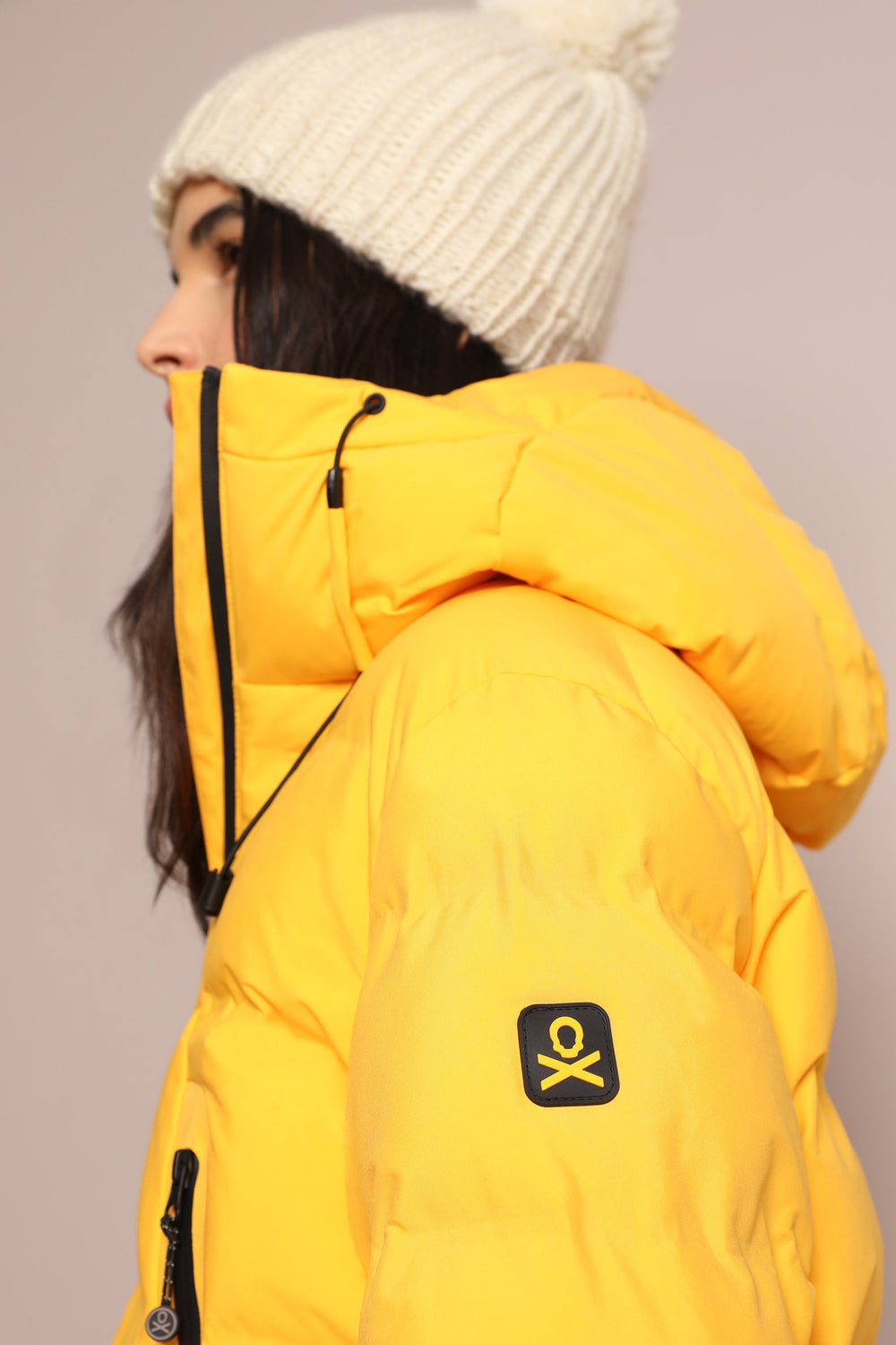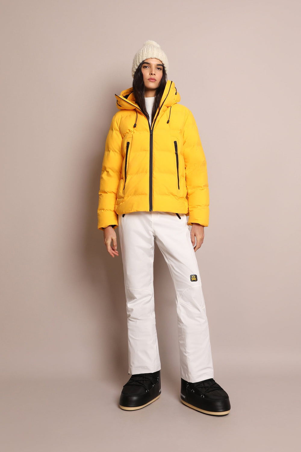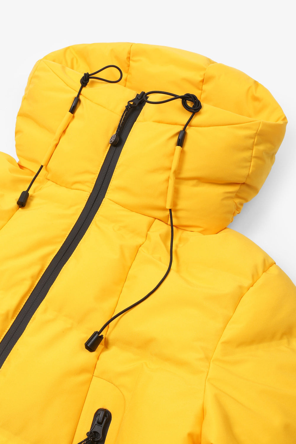 Padded technical ski jacket made of special technical fabric with windproof and waterproof properties. Regular fit cut, hooded collar with zip-fastening hood. Zip fastening. Thermo-sealed waterproof. Panel construction and heat sealed bands. Interior zipped security pocket, interior side mesh pockets, and oversized front pockets. Rubberised sleeve patch detail.