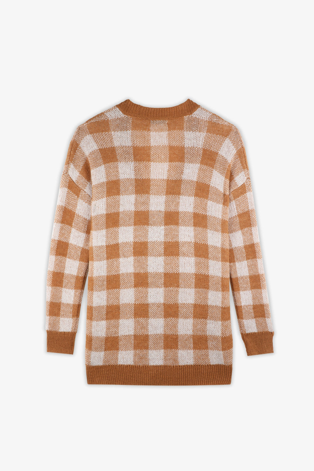 Long check cardigan in a wool and mohair blend. Regular fit, V-neck and button fastening. Long sleeves and side slits.