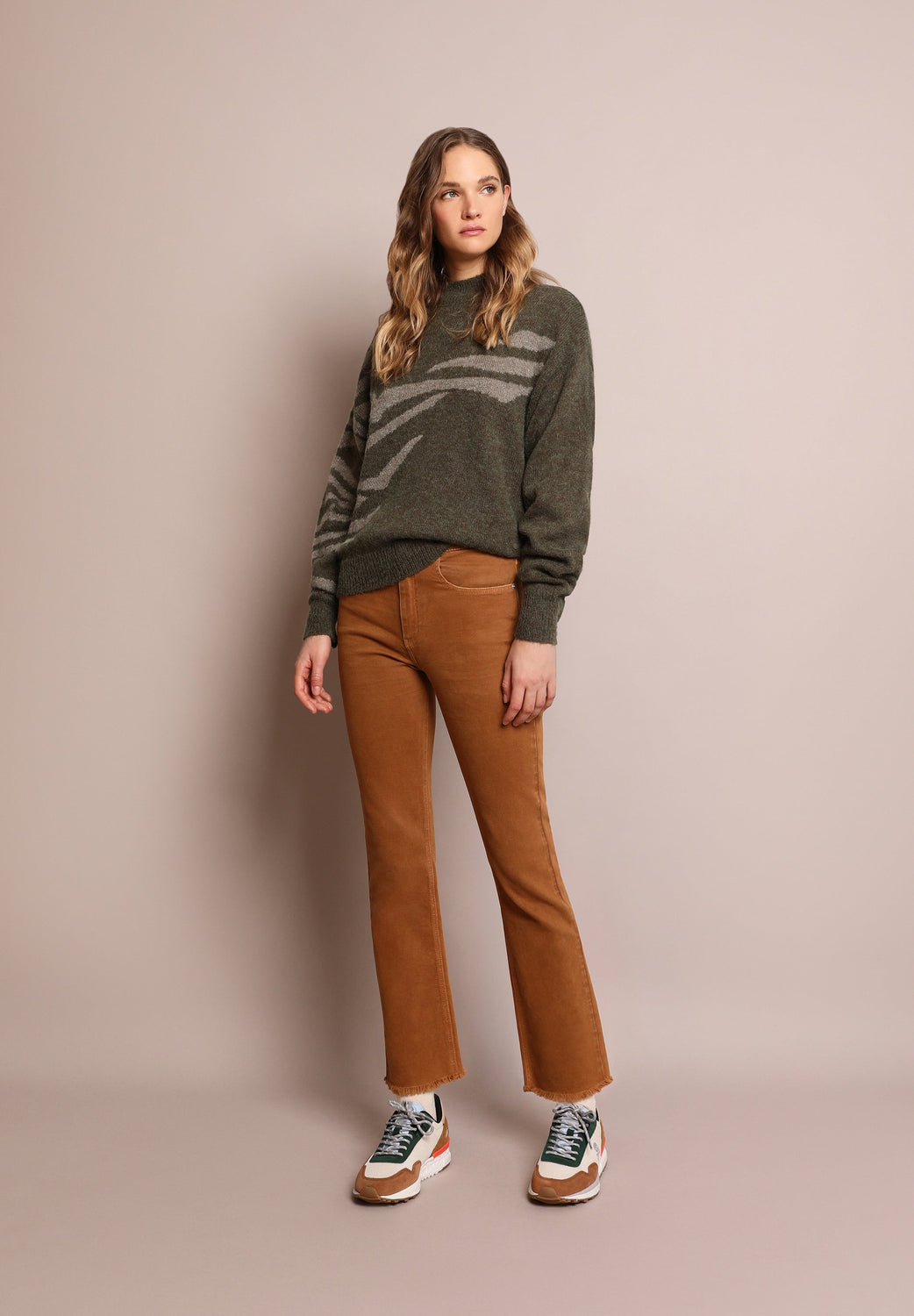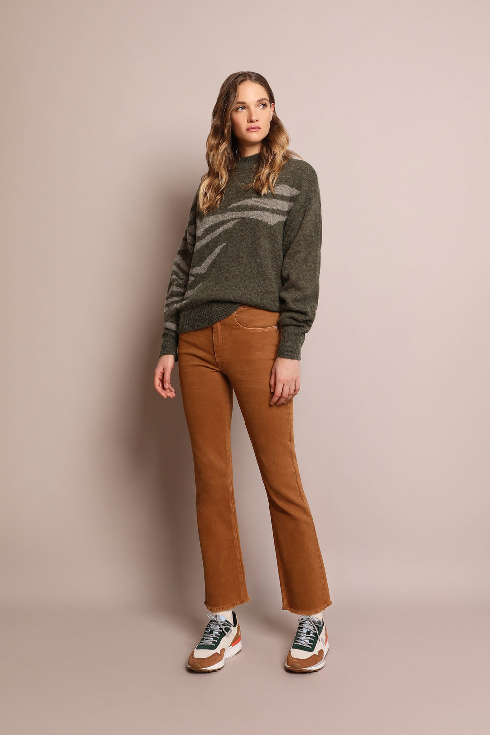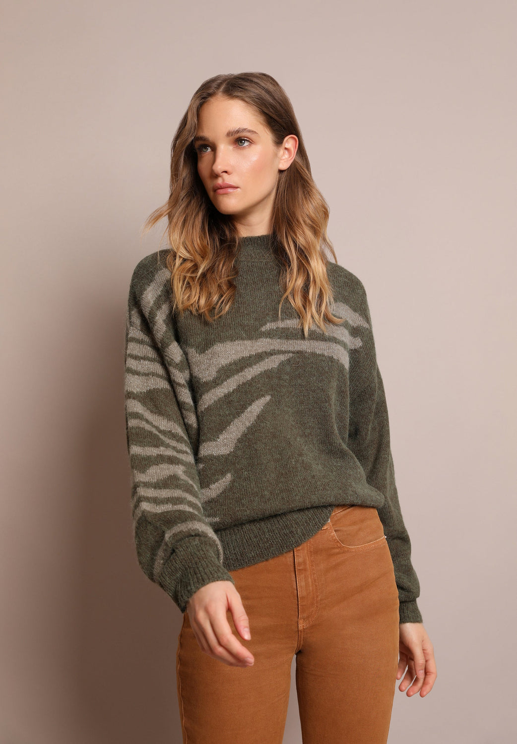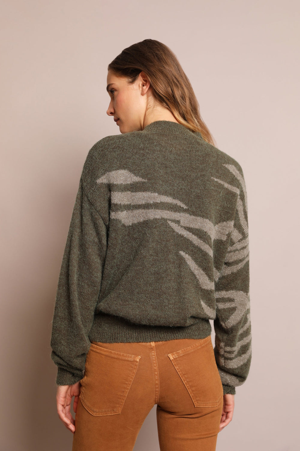 Knit sweater with animal print embellishment made from an alpaca blend. Regular fit, slightly high collar and long sleeves.