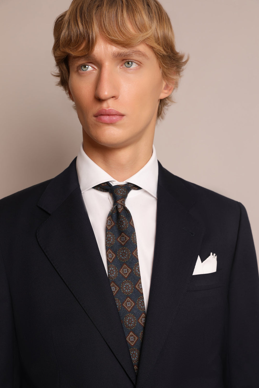 Plain suit made of 100% wool. Regular fit blazer with notched lapel collar, button fastening and flap pockets. Straight trousers with button with expandable waistband and button and zip fastening.