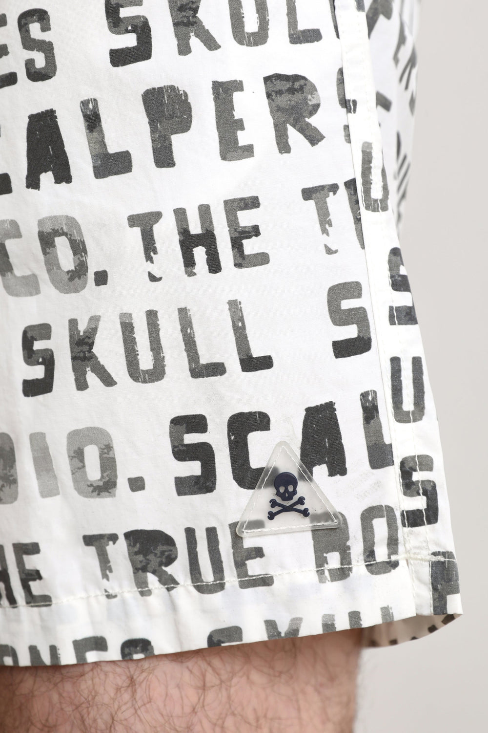 Swimming trunks with text print.