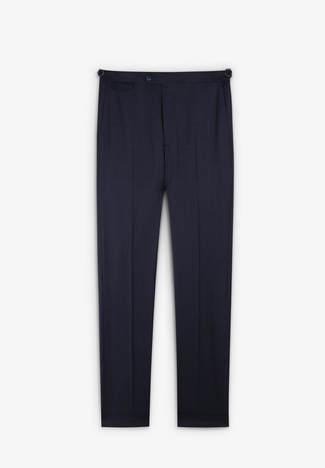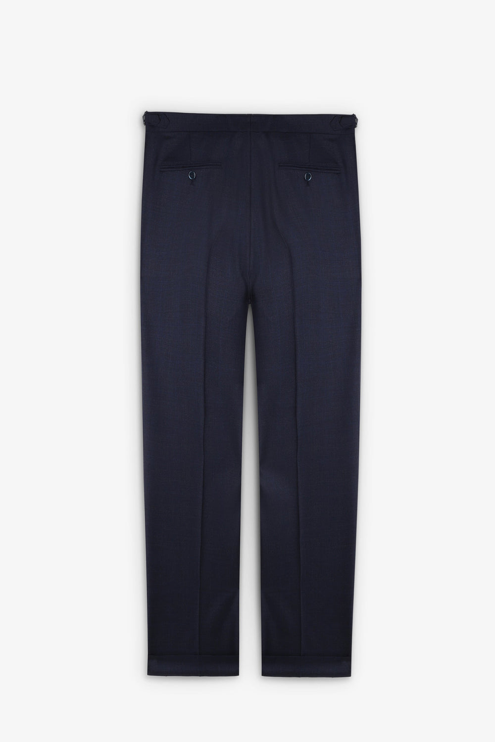 • Straight trousers with an extended button-up fastening at the waist and buttons. Side belt and button for braces. Turn-up hem.