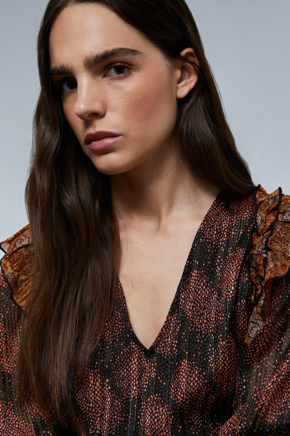 - Made of flowing fabric with metallic yarn detailing