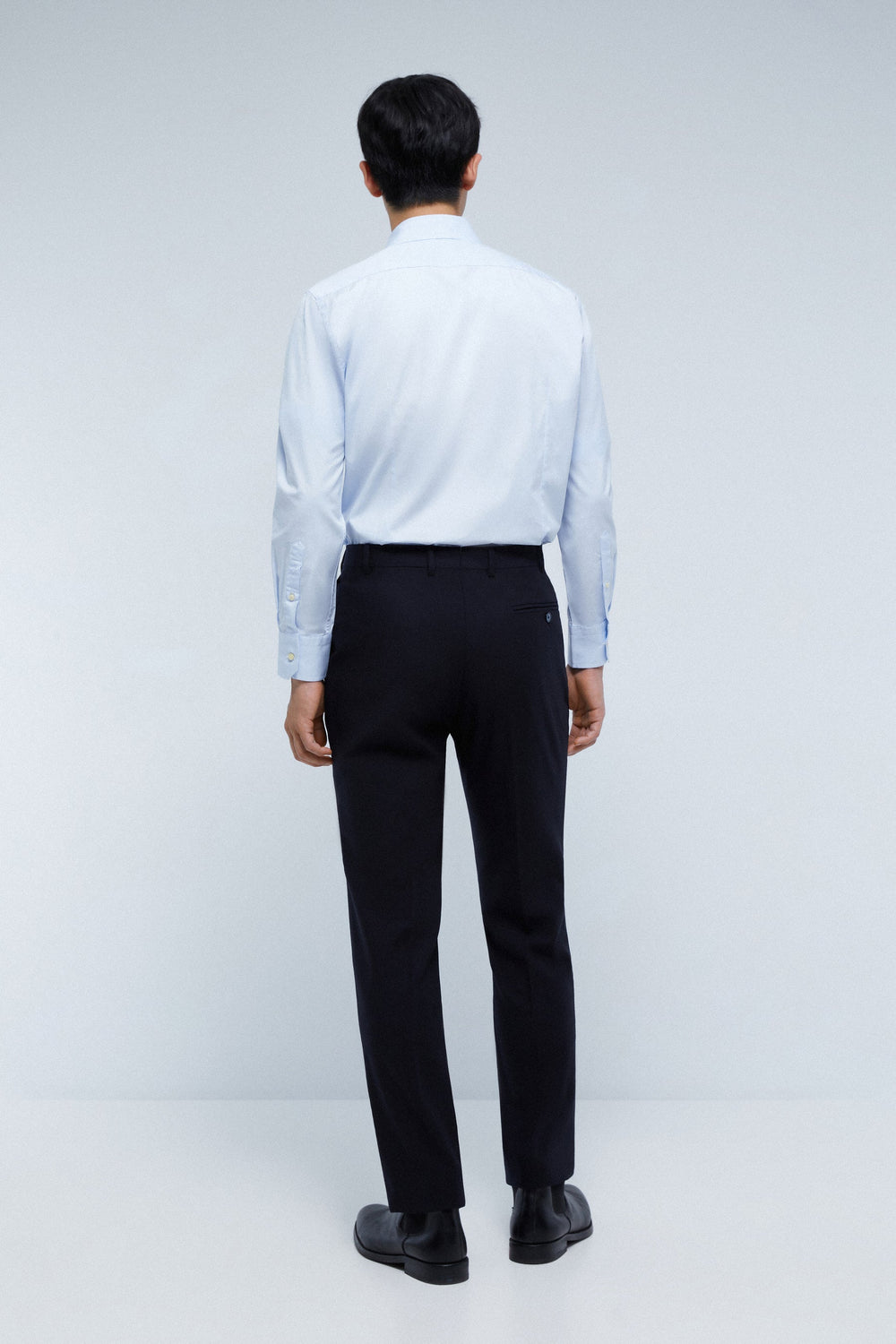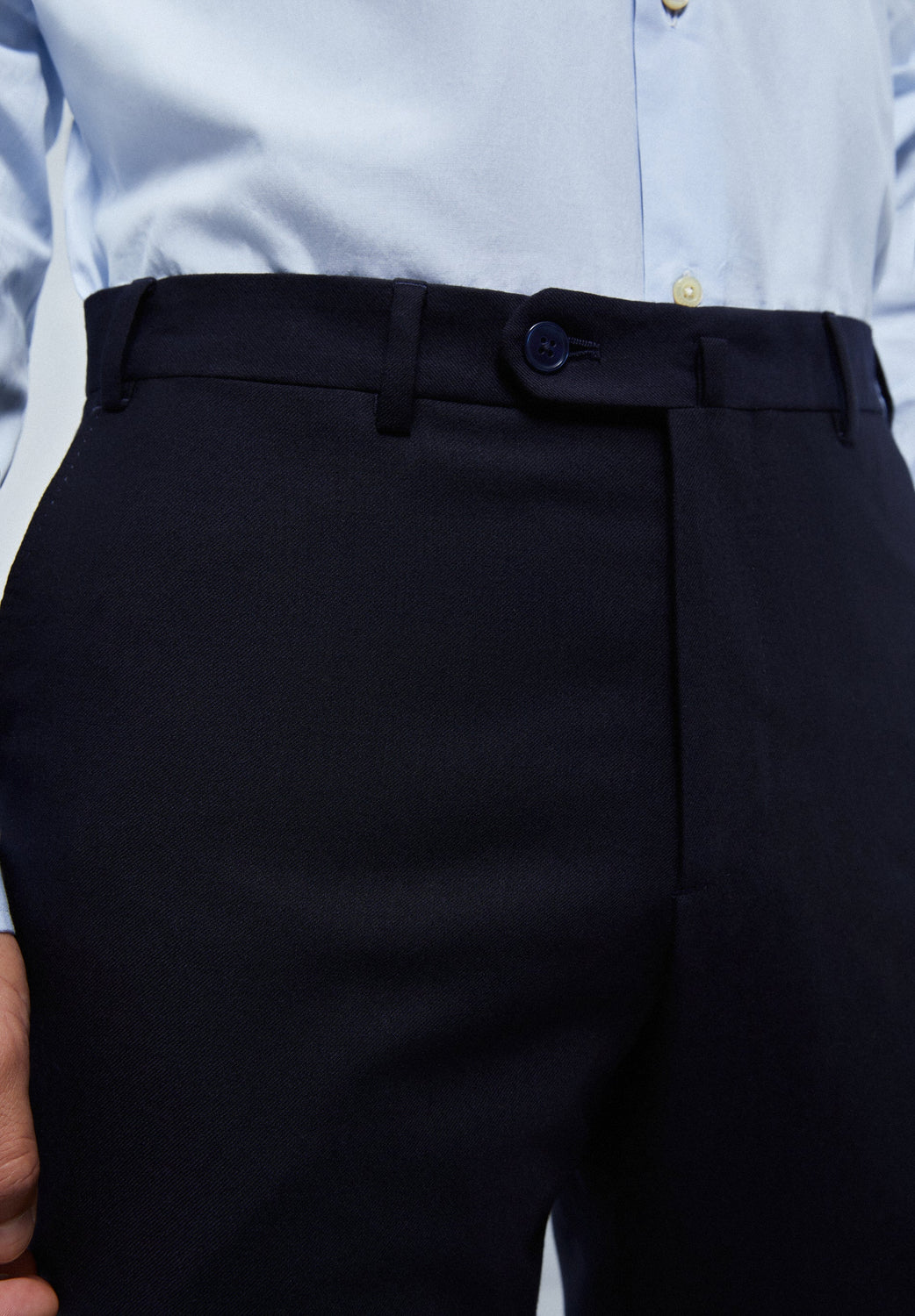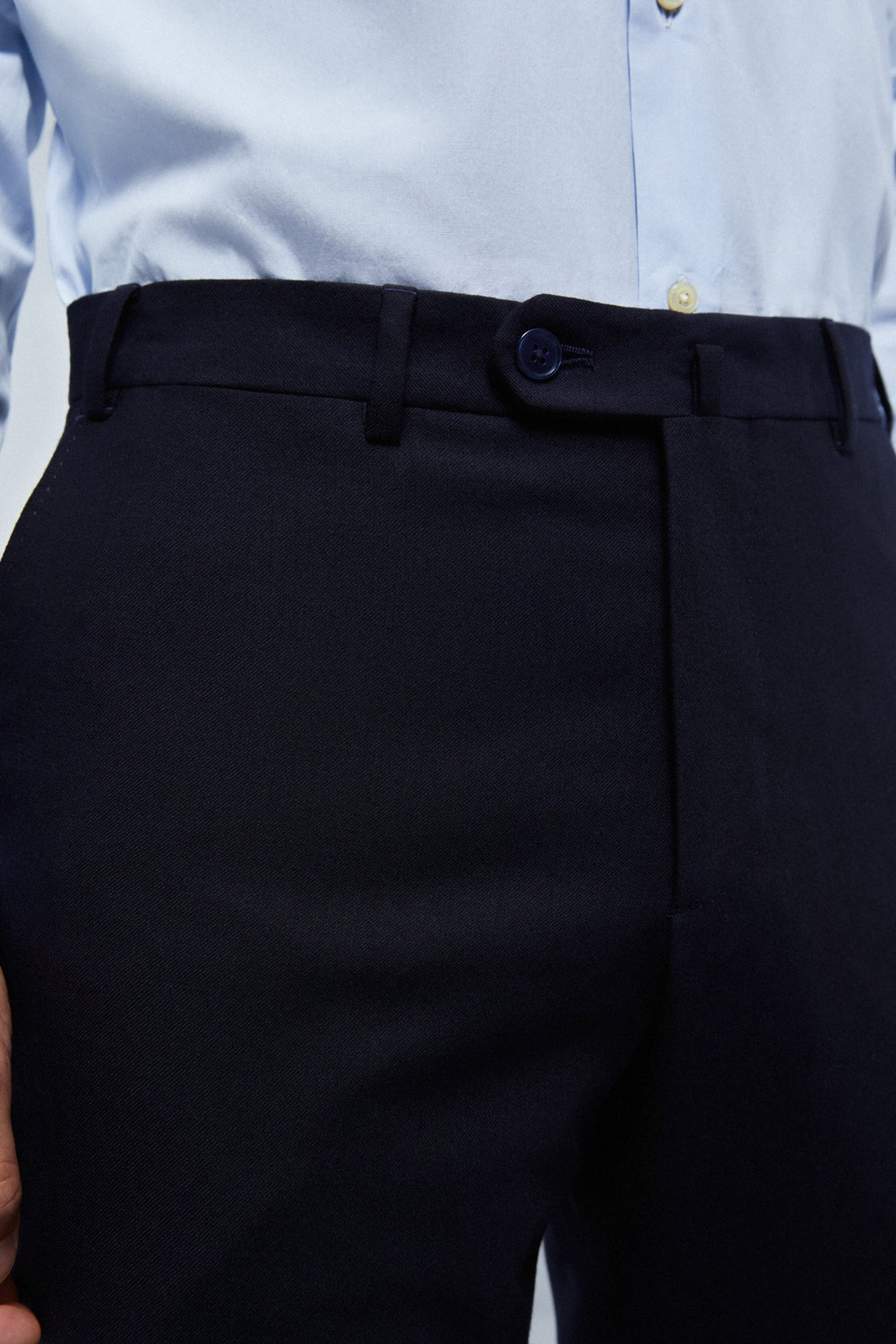 • Straight trousers with an extended button-up fastening at the waist and a zip. Simple hem without turn-up