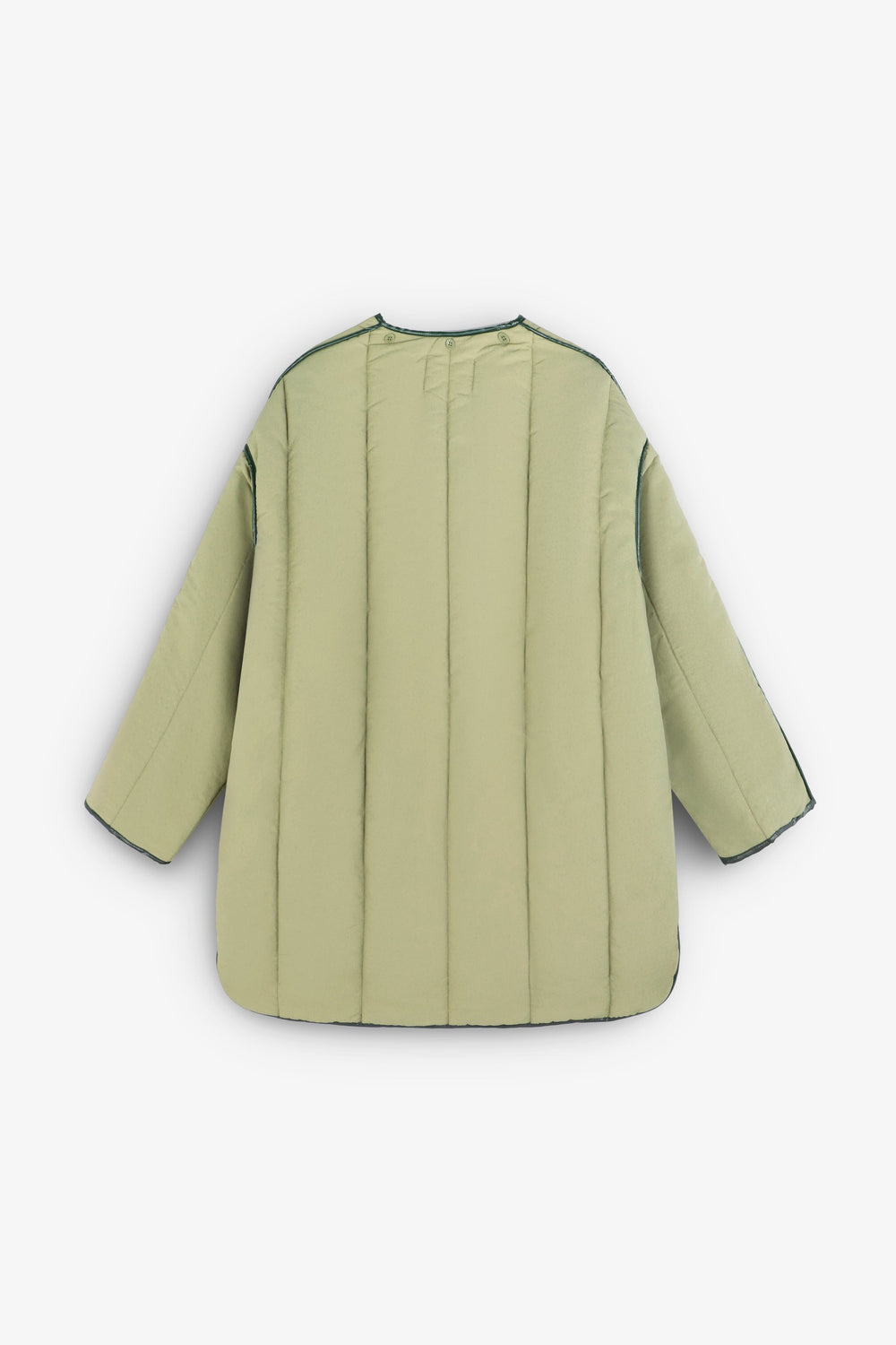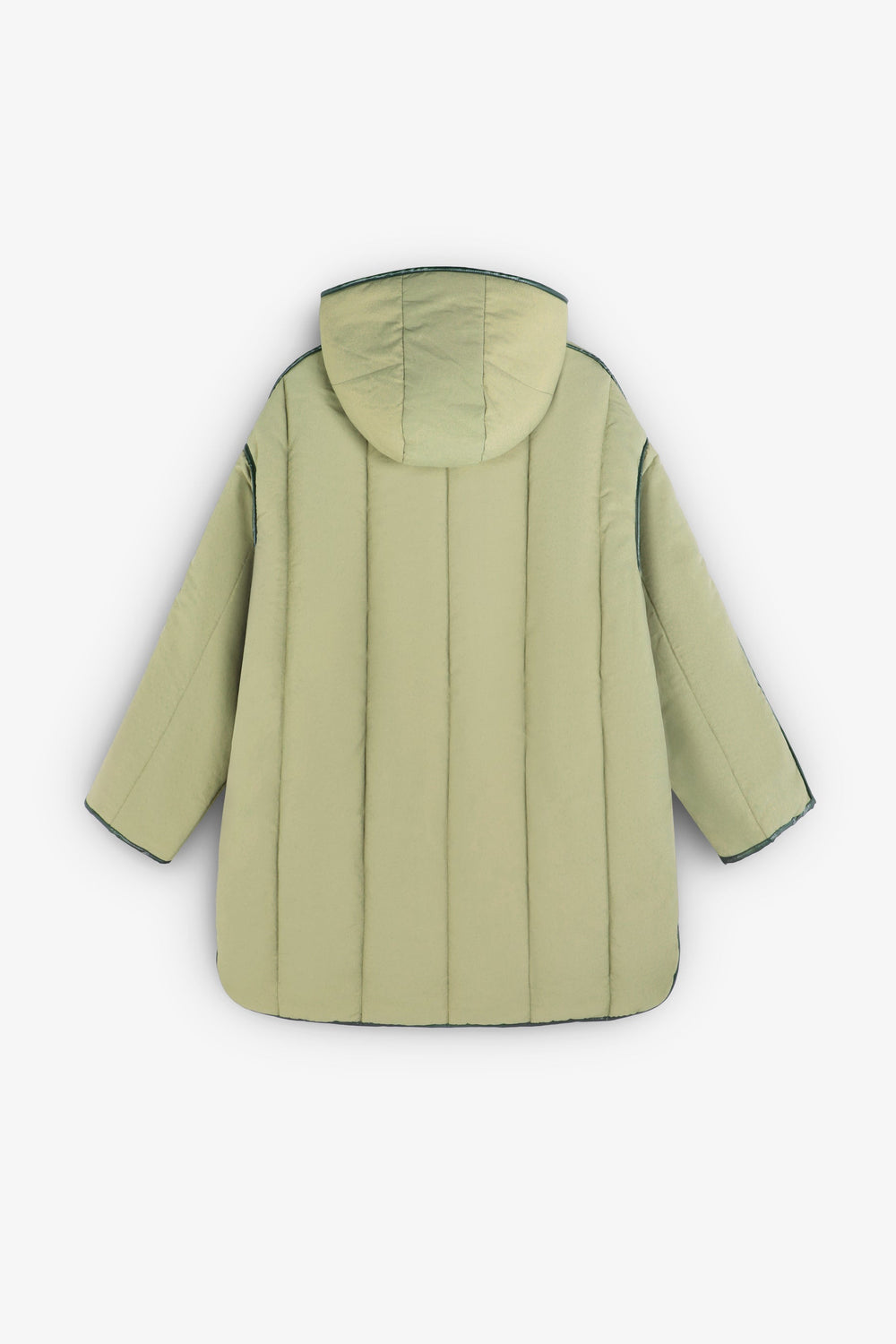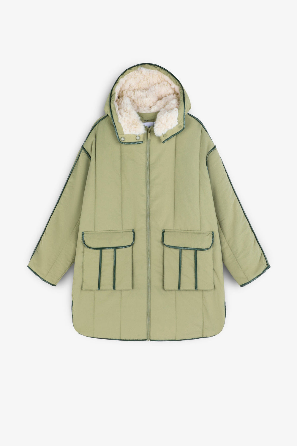 Puffer coat made of technical fabric. Regular fit, collar with detachable hood and with detachable fur and zip fastening. Long sleeves and shearling interior. Rounded hem and side vents, and piping detail at the seams.
