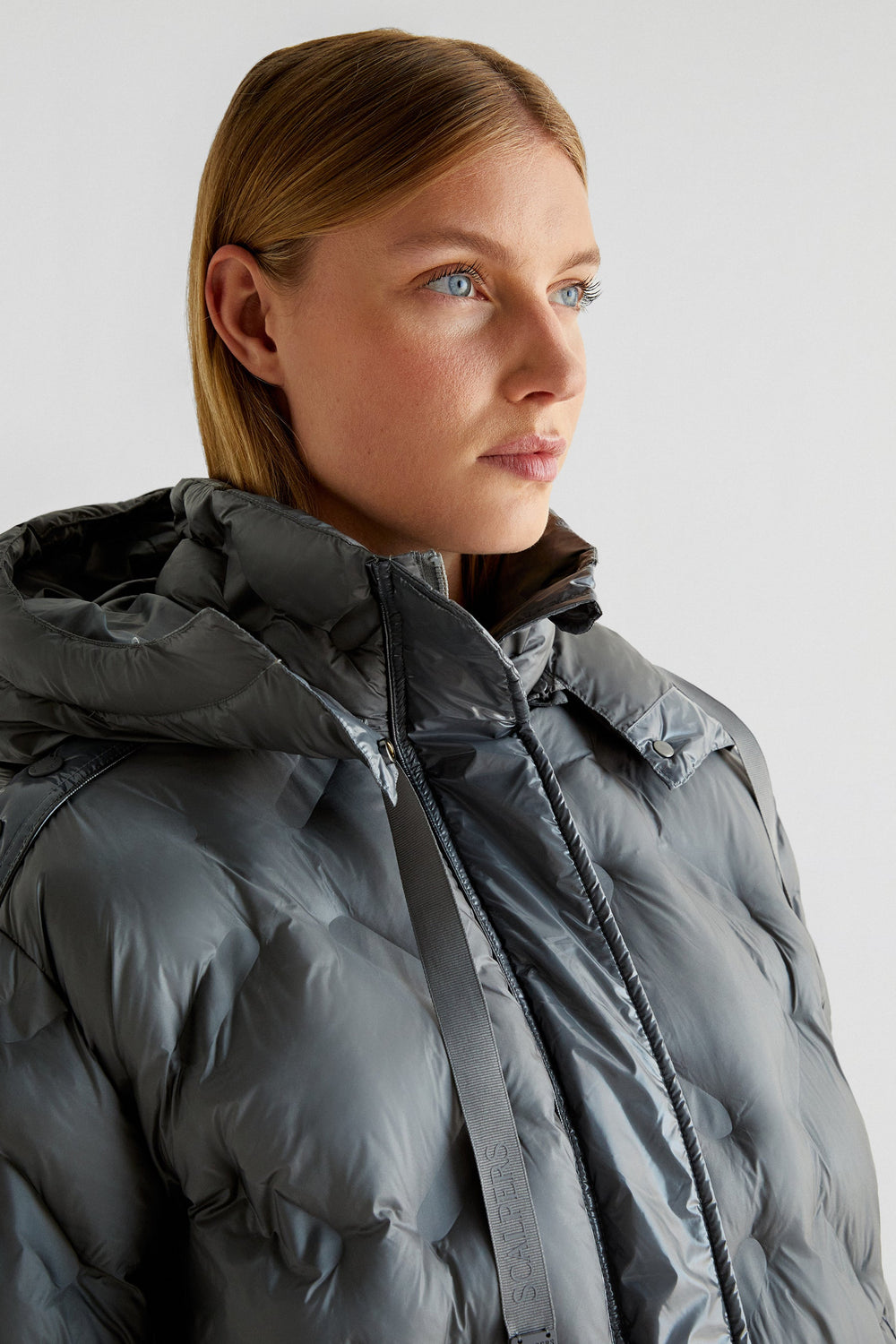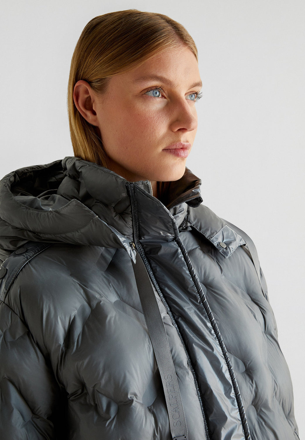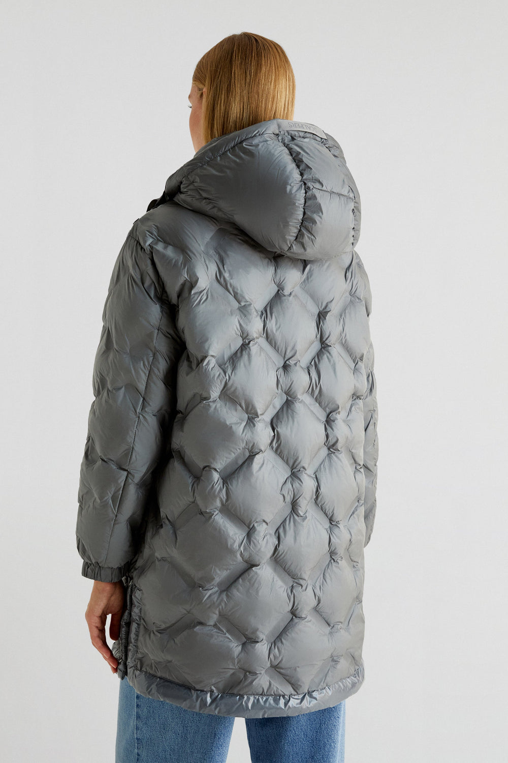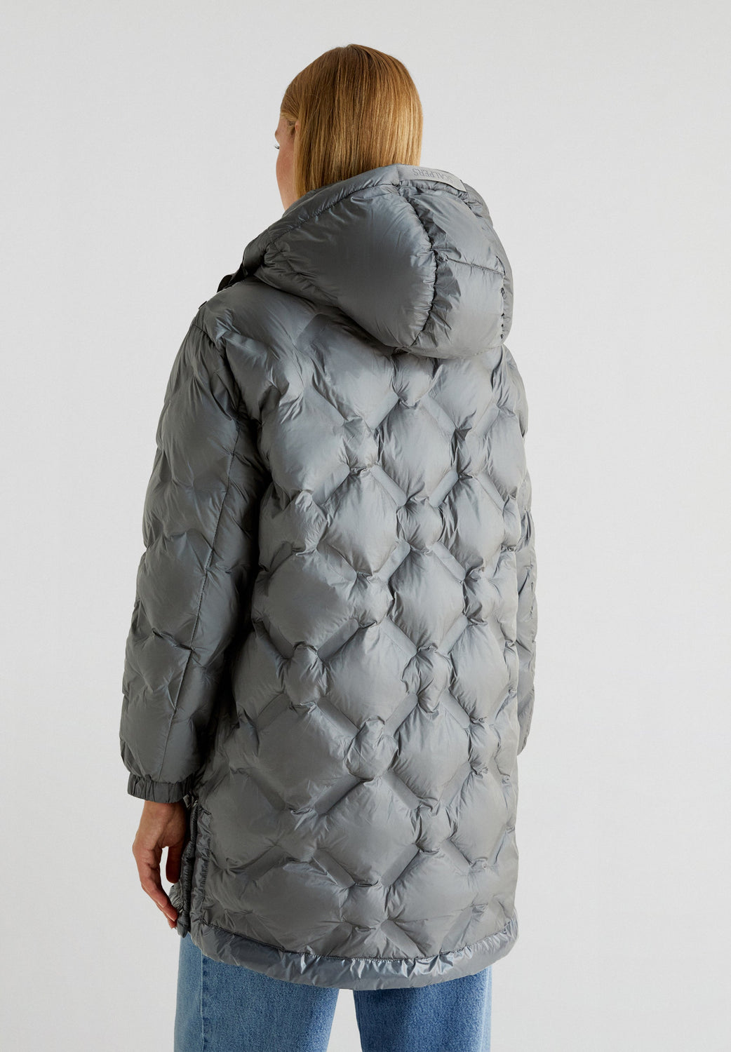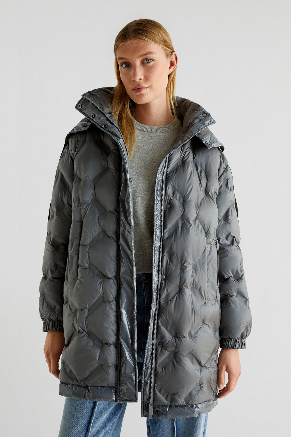 Quilted coat made of recycled fabric. Regular fit, high collar with an adjustable hood and button and snap button fastenings. Long sleeves with elasticated trims, side pockets and side openings.