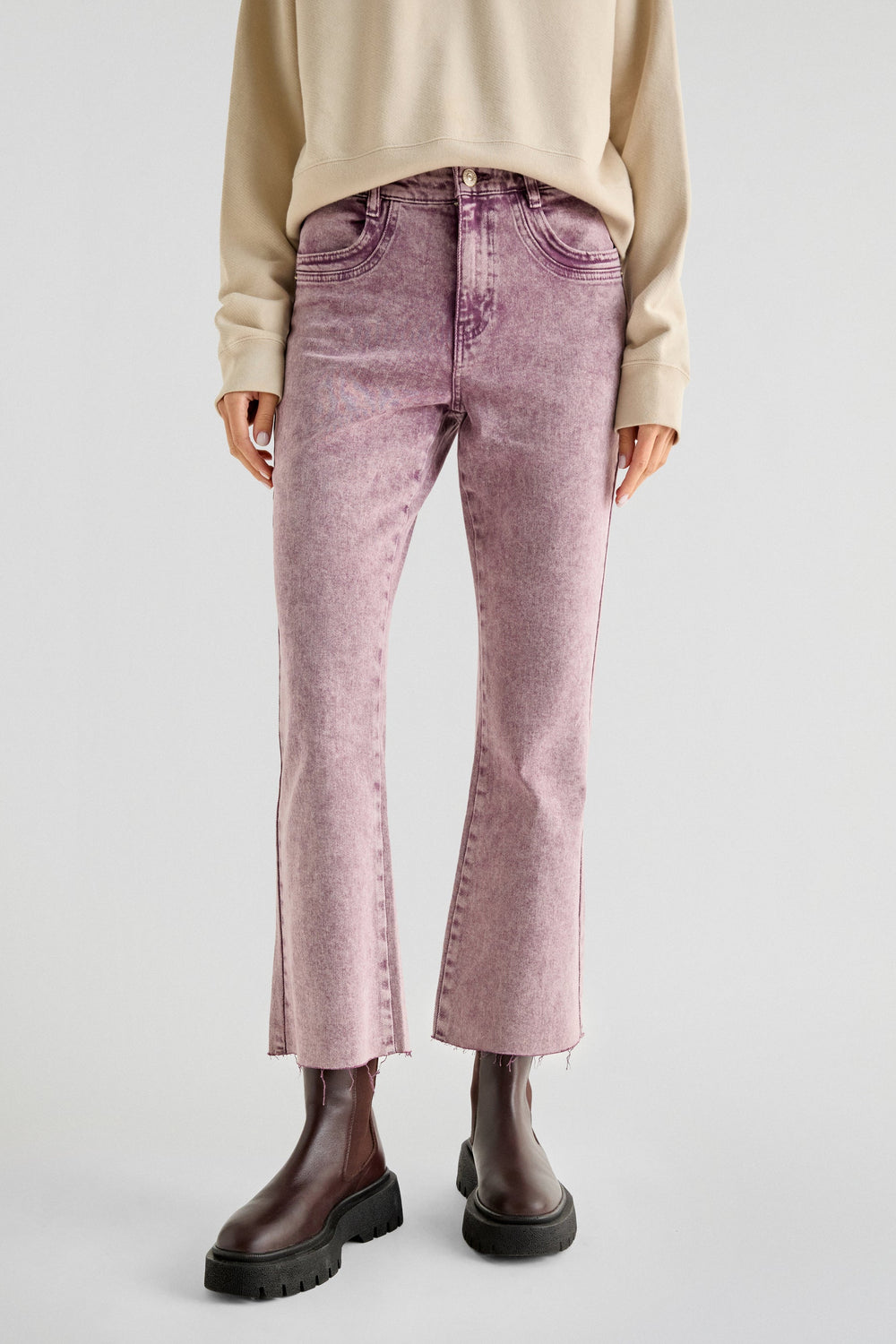 Faded jeans made from slight stretchy cotton. Flared slim fit, button and zip fly fastening. Back and front pockets, and belt loops. Frayed hems.