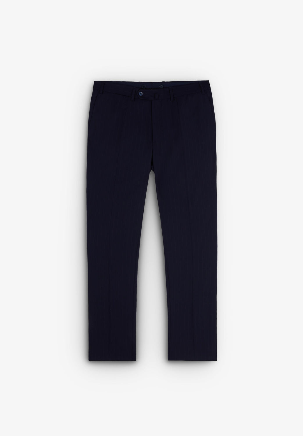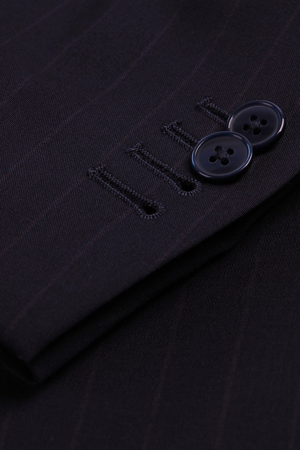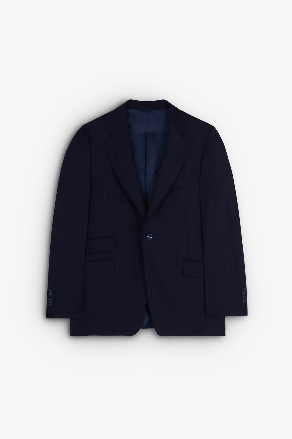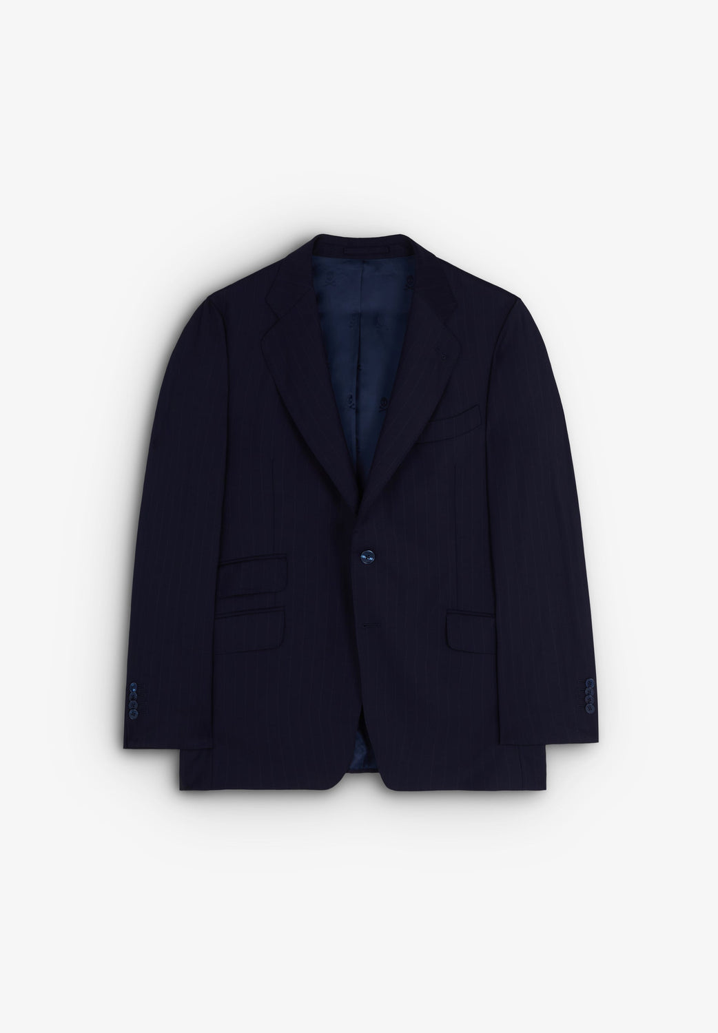 Striped navy blue suit.