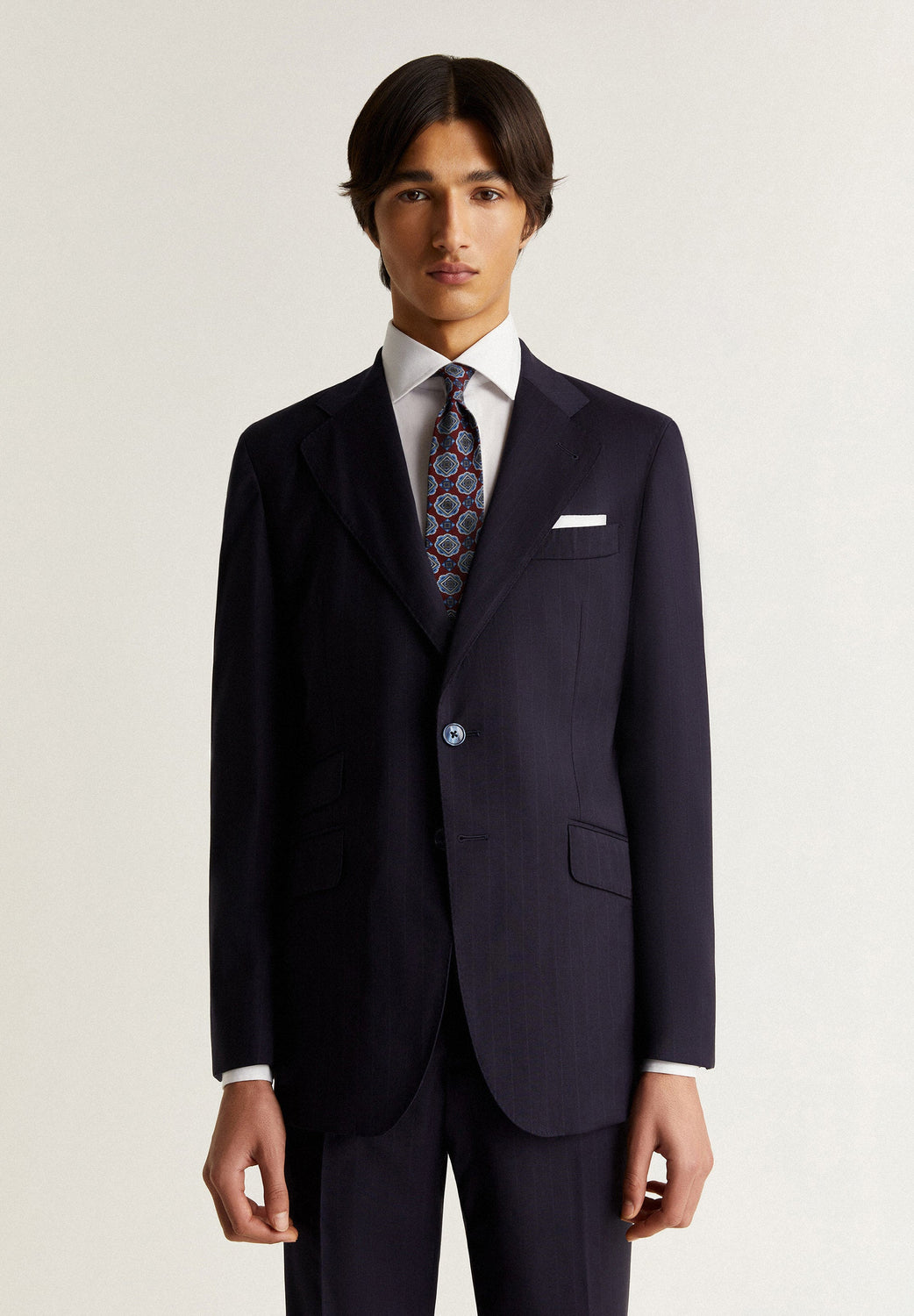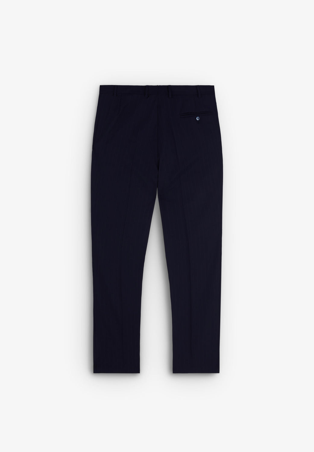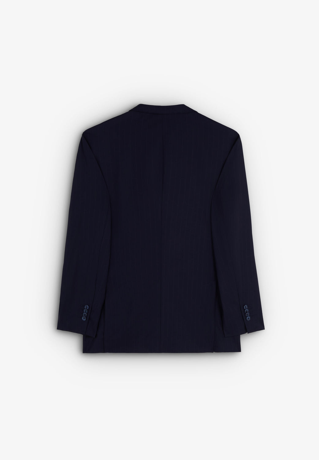 Striped navy blue suit.