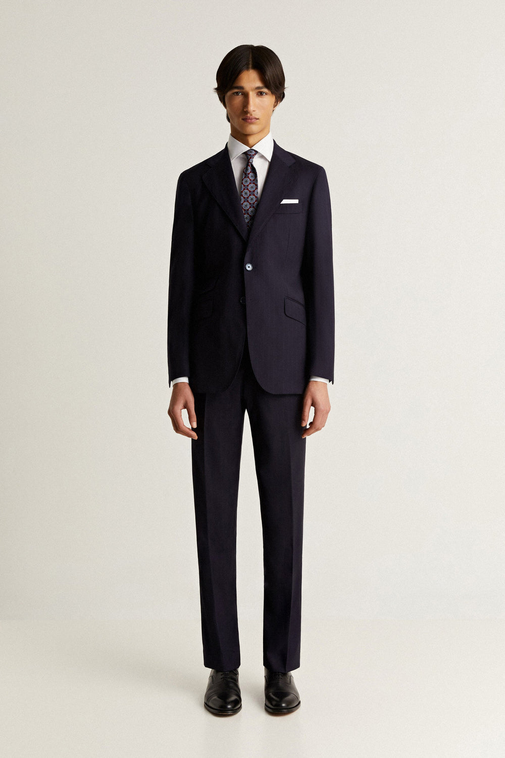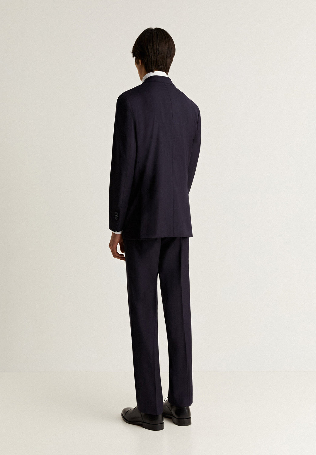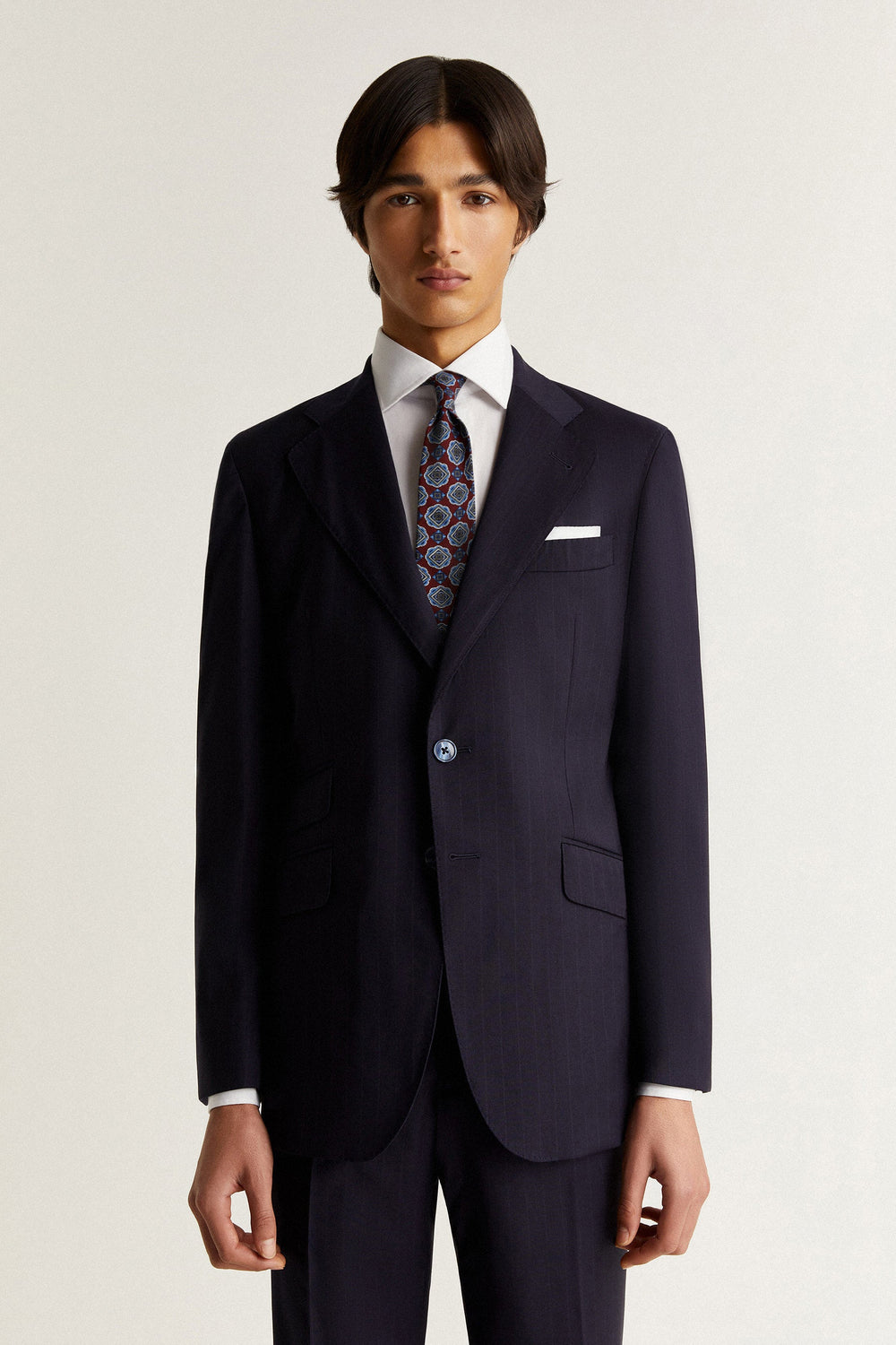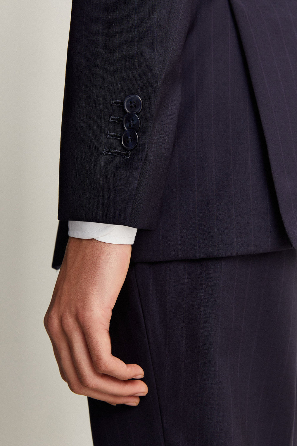 Striped navy blue suit.