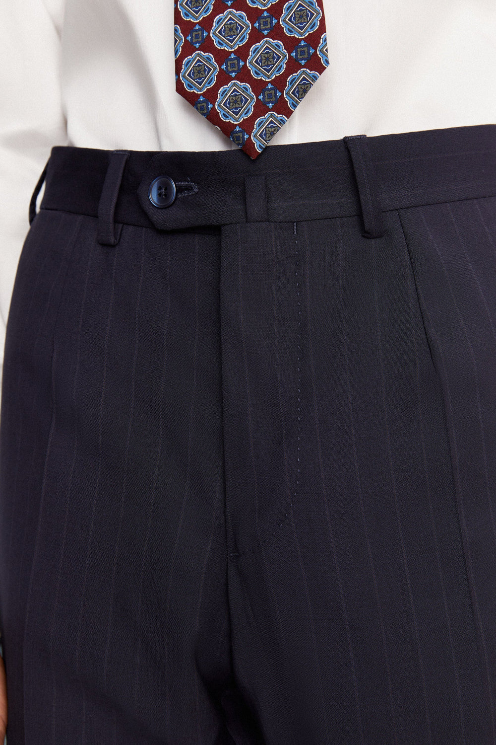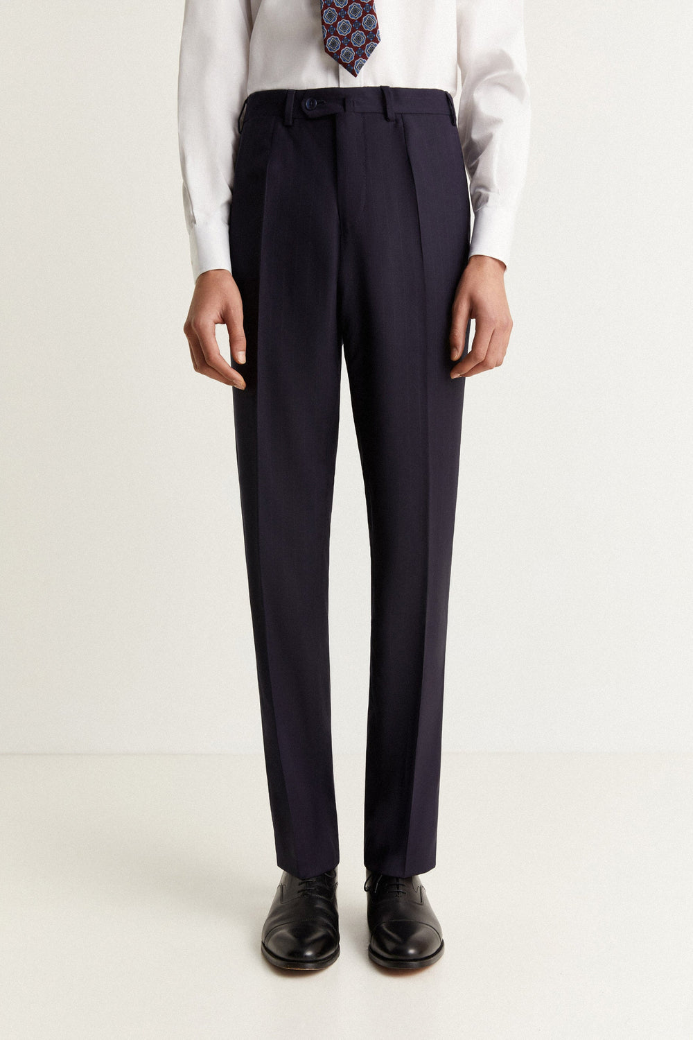 • Trousers with hook and eye fastening, buttoned placket and zip. Inner button for braces. Side pockets