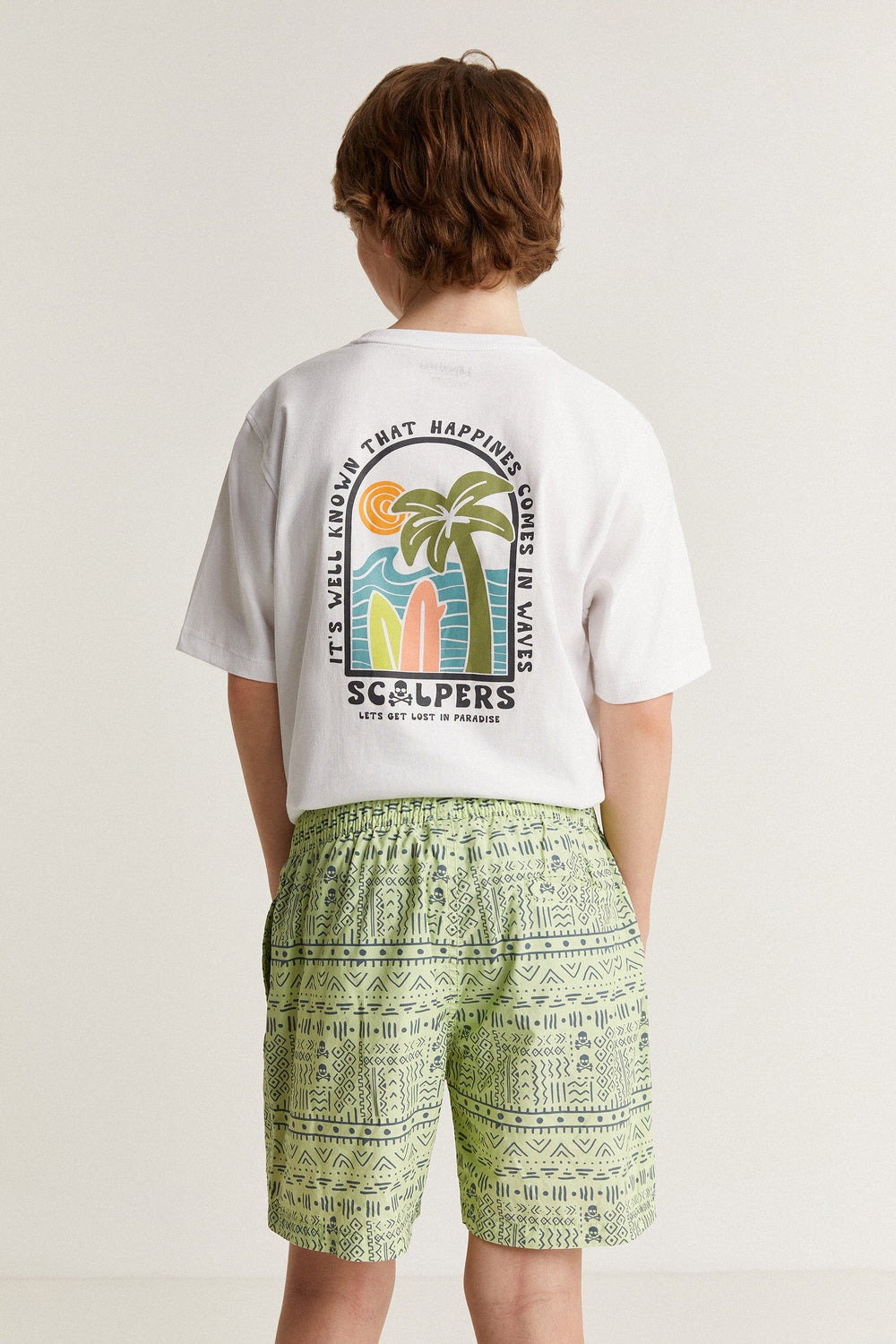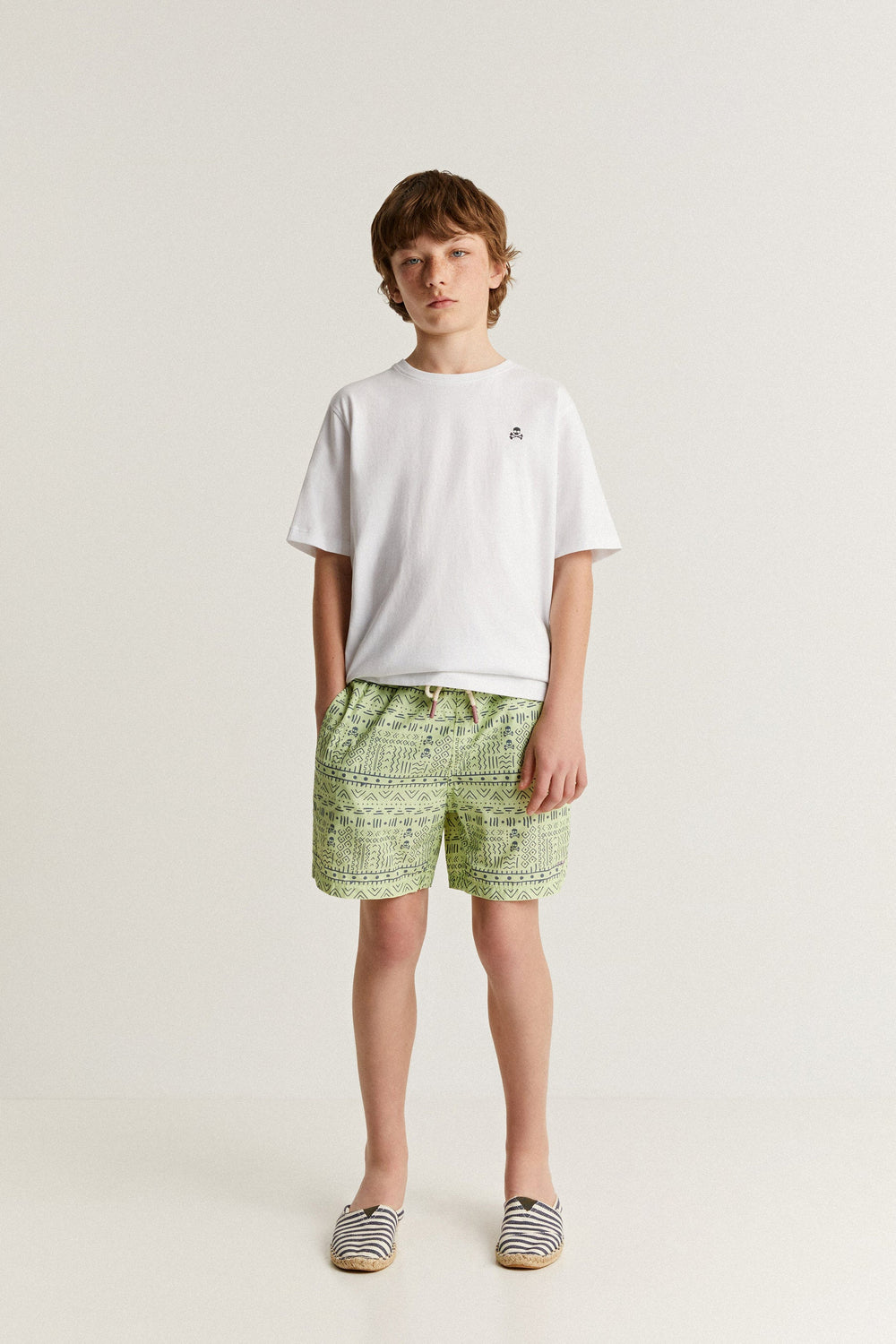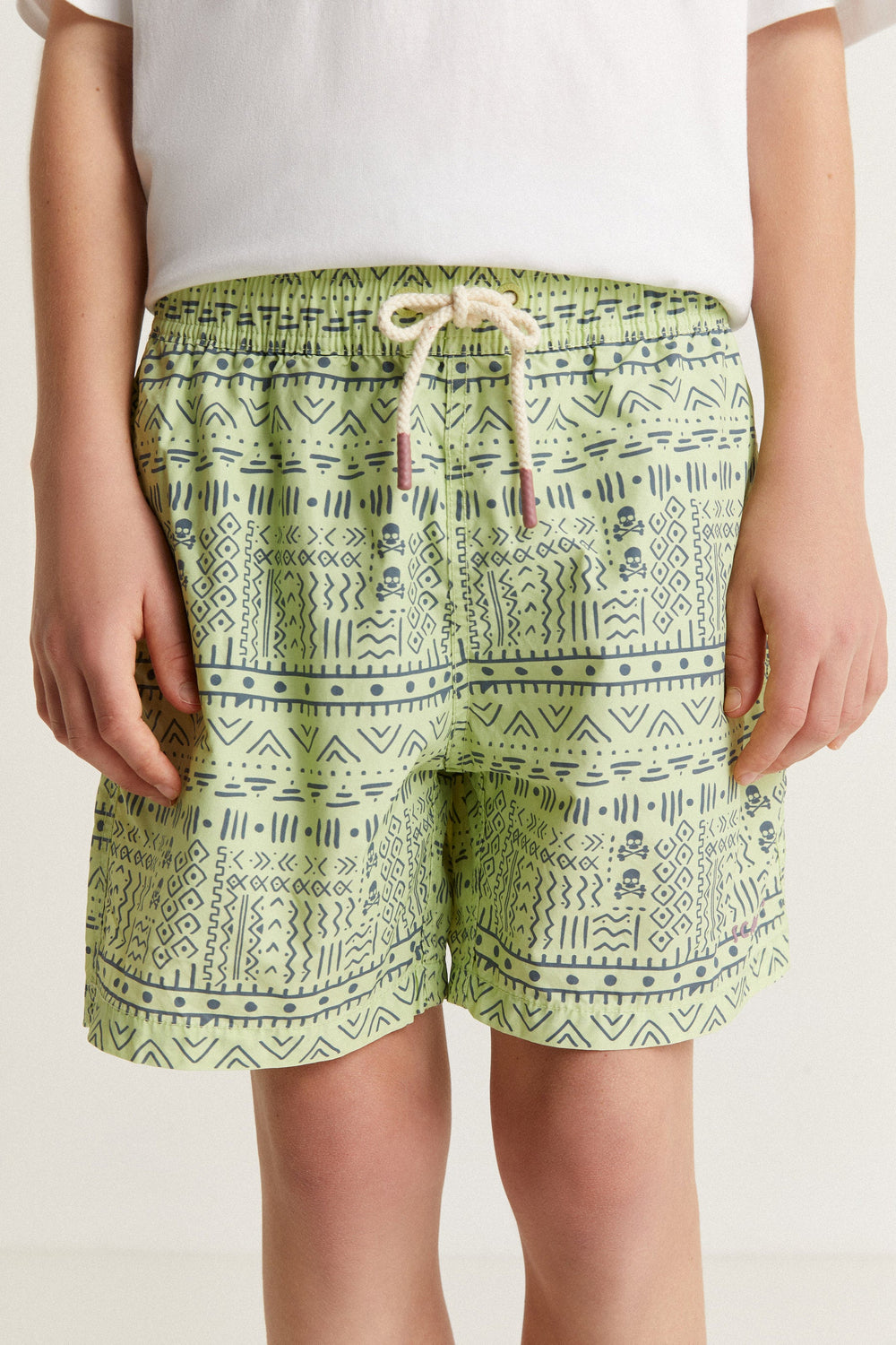 Swimming trunks with an ethnic print and all over skulls detail.