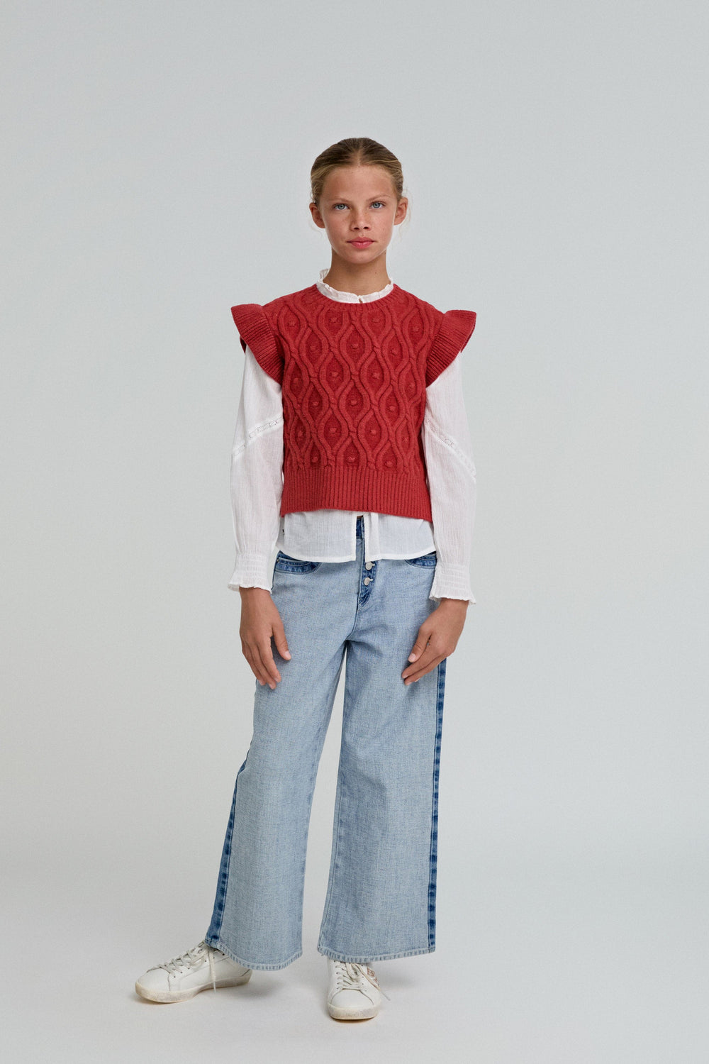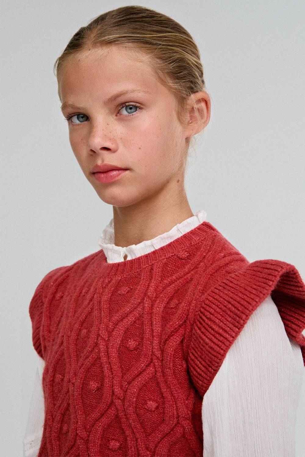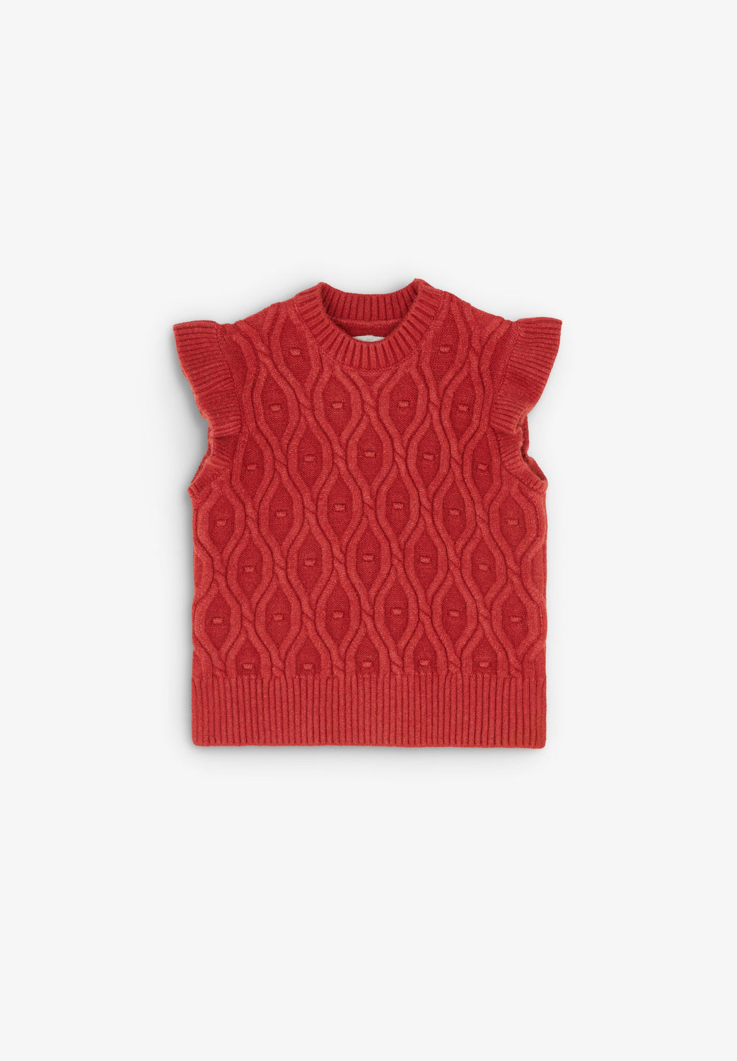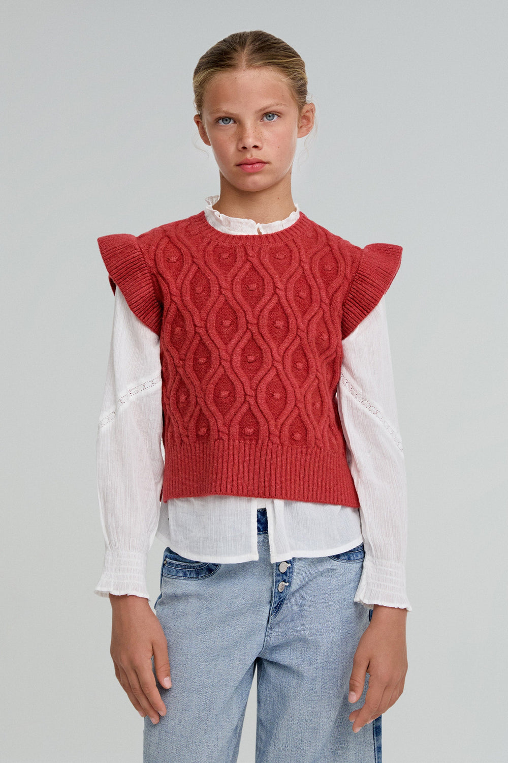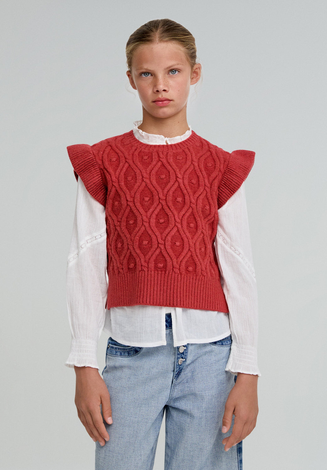 Veste sans manches en maille avec manches à volants. Coupe droite. Col rond. Bords de côte