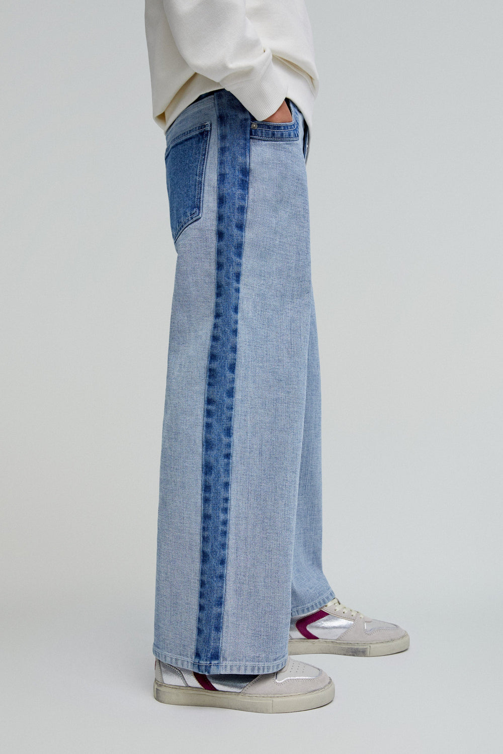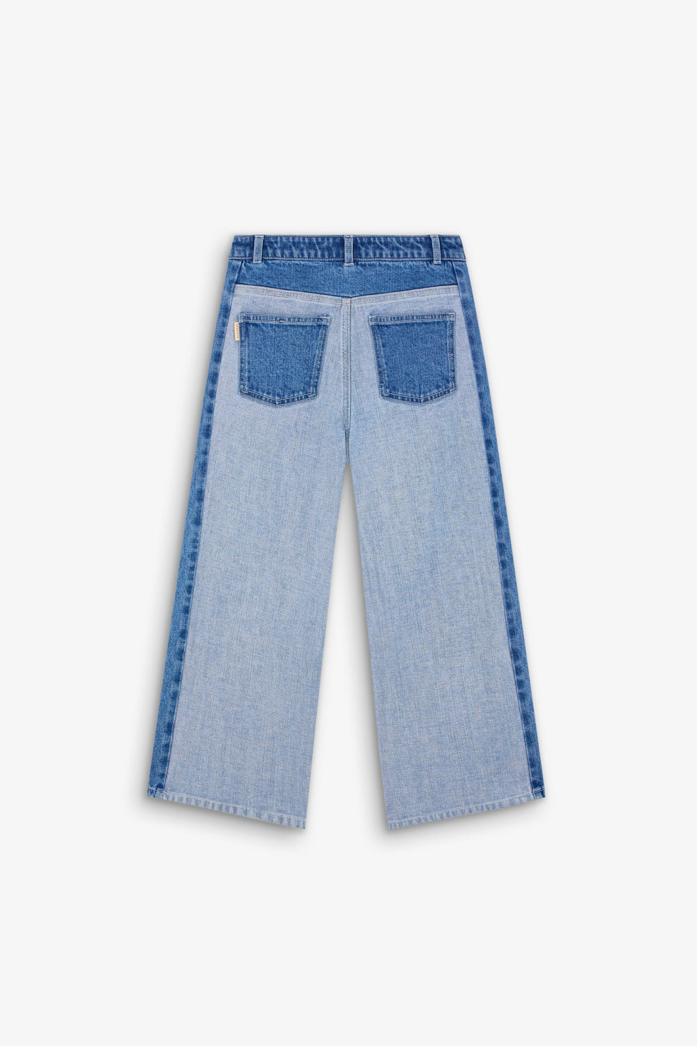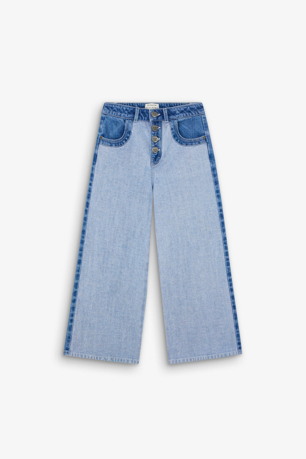 Two-tone jeans made of slightly stretchy BCI cotton. Culottes with zip and button fastening. Side and back pockets.