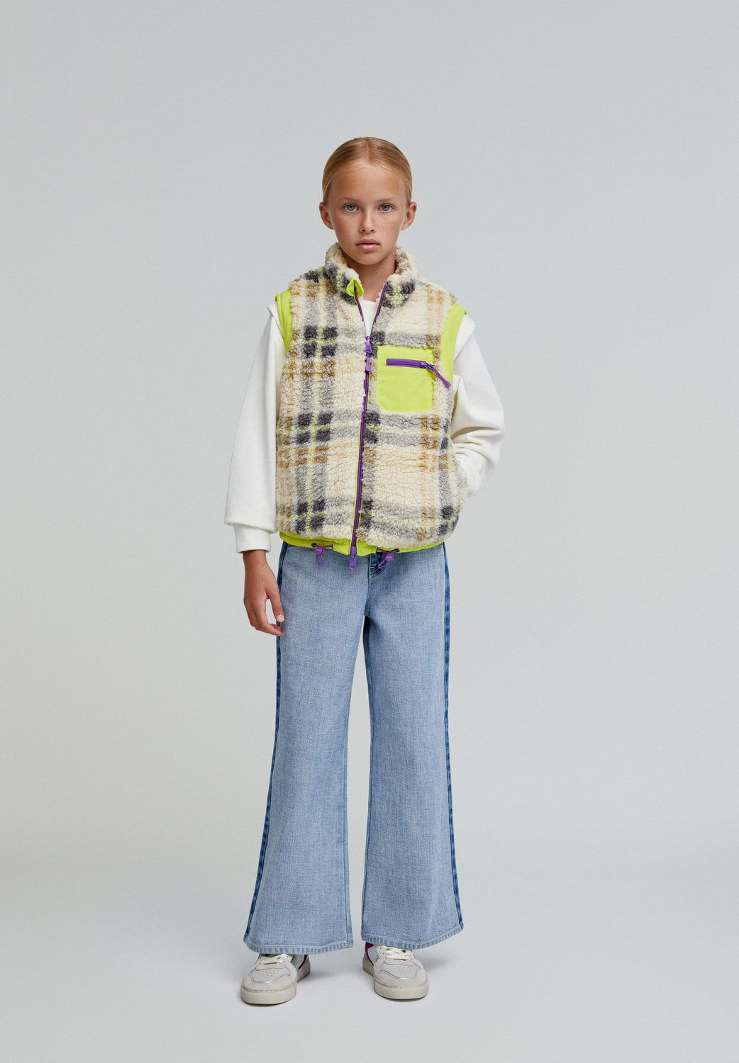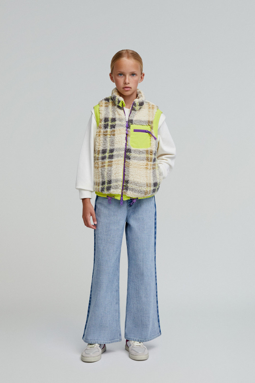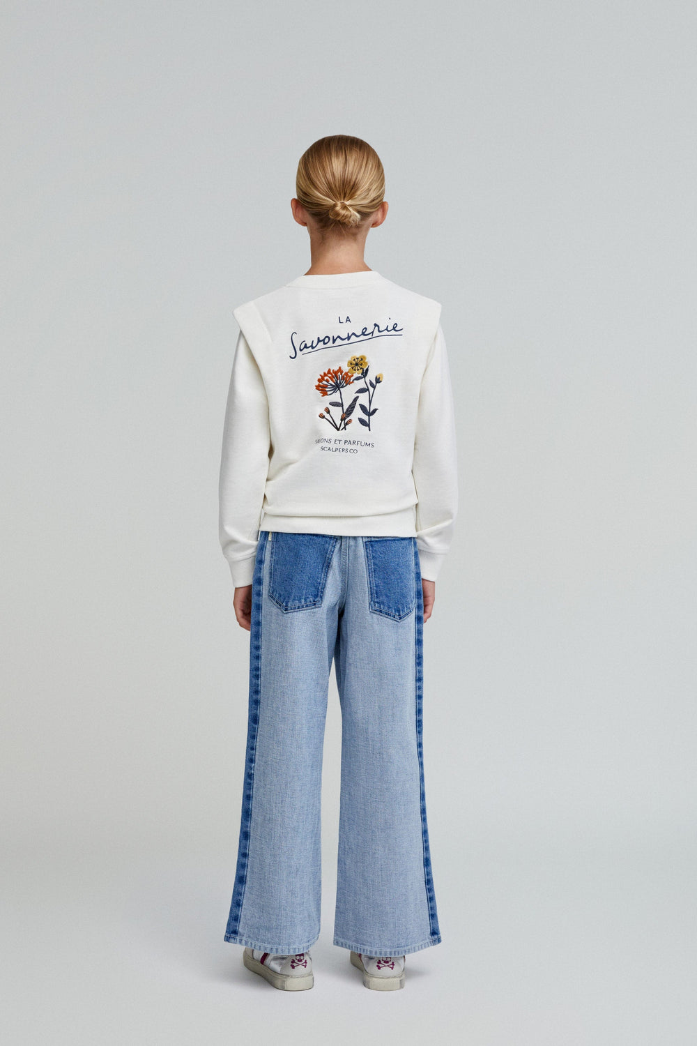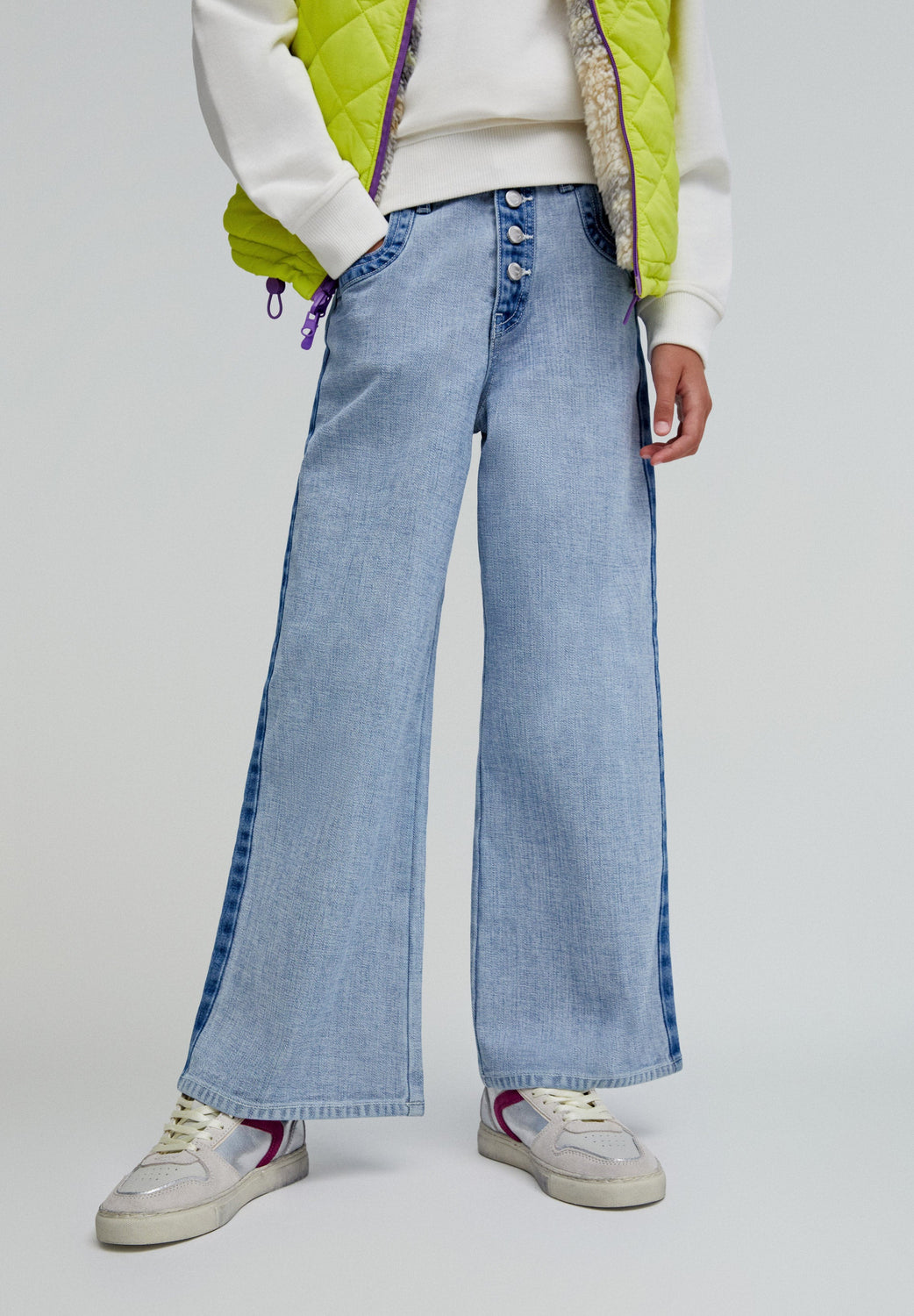 Two-tone jeans made of slightly stretchy BCI cotton. Culottes with zip and button fastening. Side and back pockets.