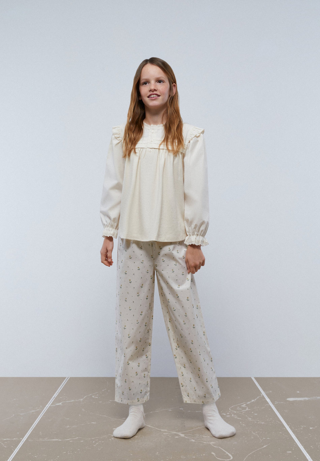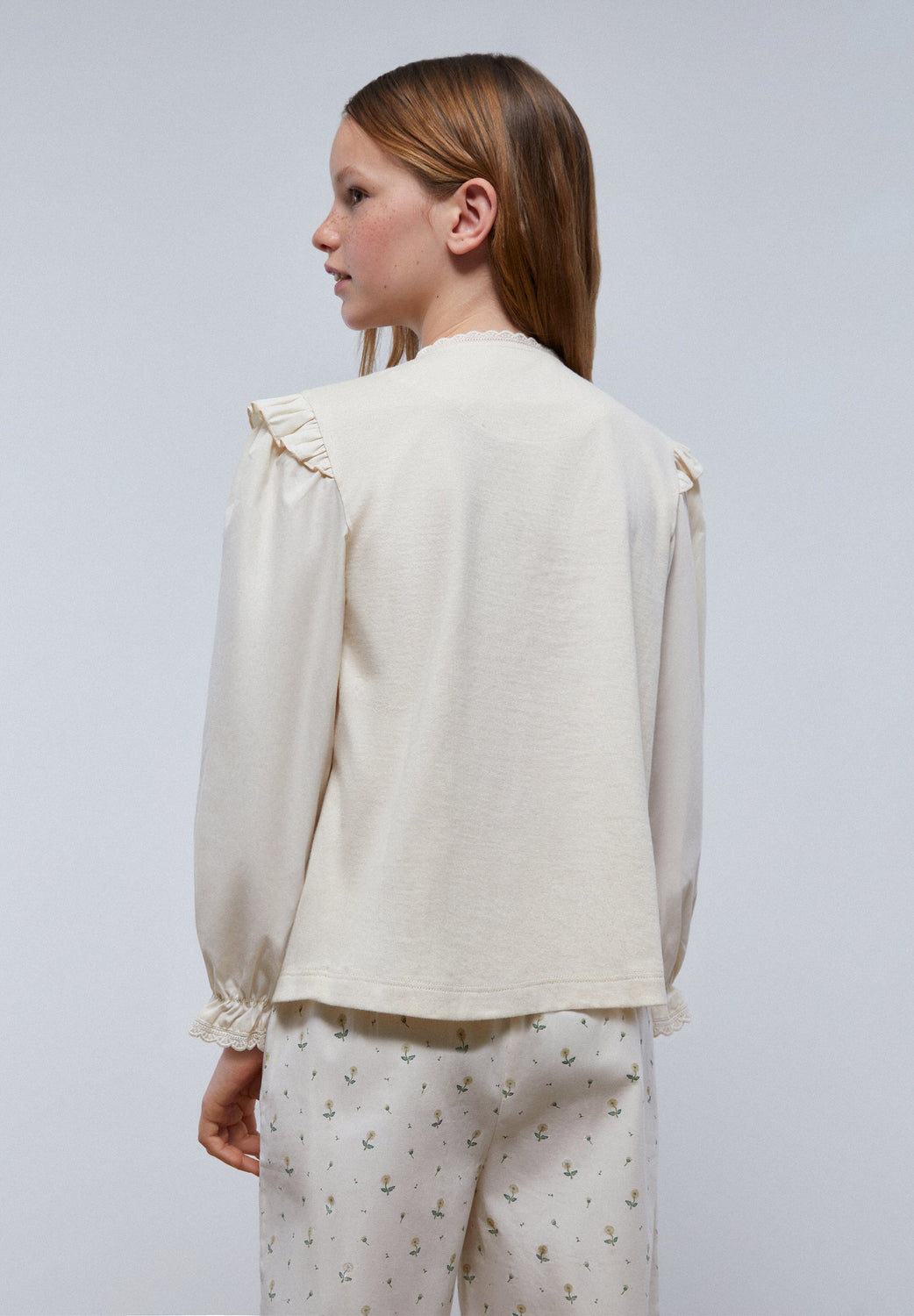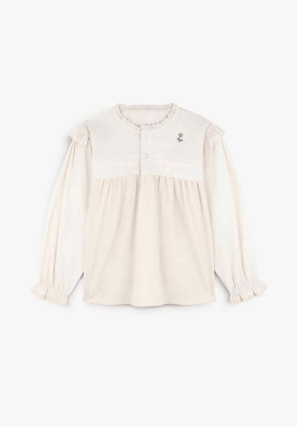 - Top: rounded collar with front button fastening. Long sleeves with ruffled cuffs. Shoulder ruffle detail. Finished with embroidered trim. Embroidered flower detail on the chest.
