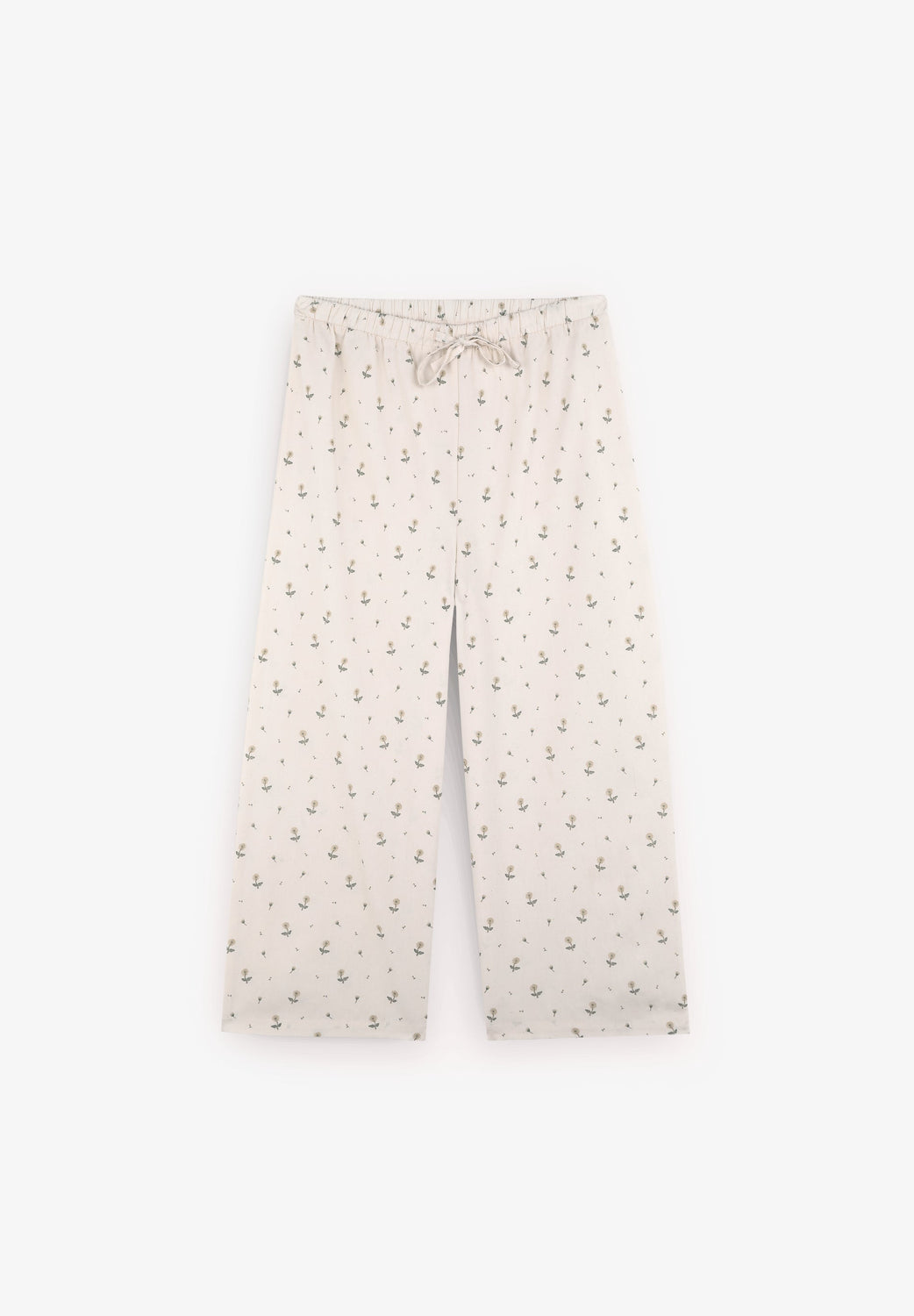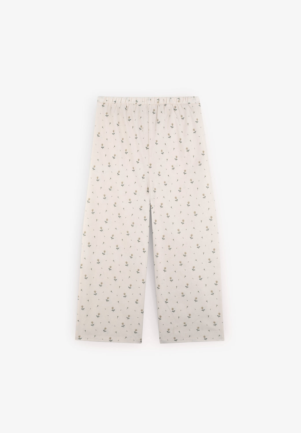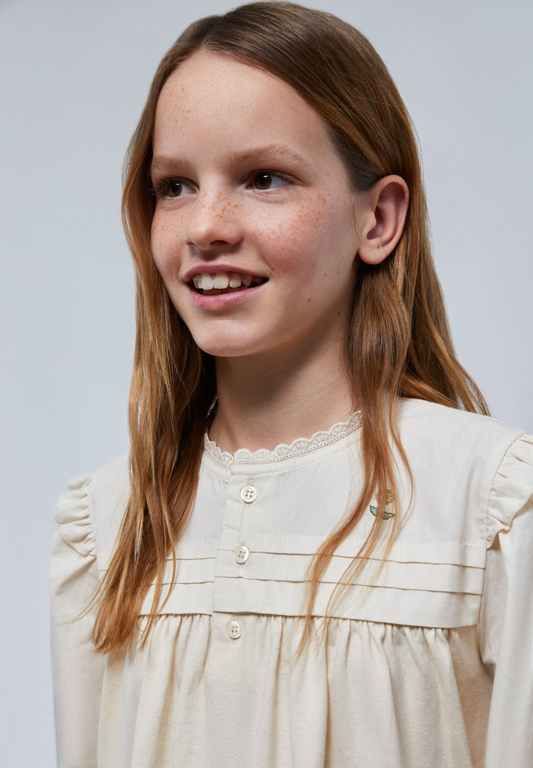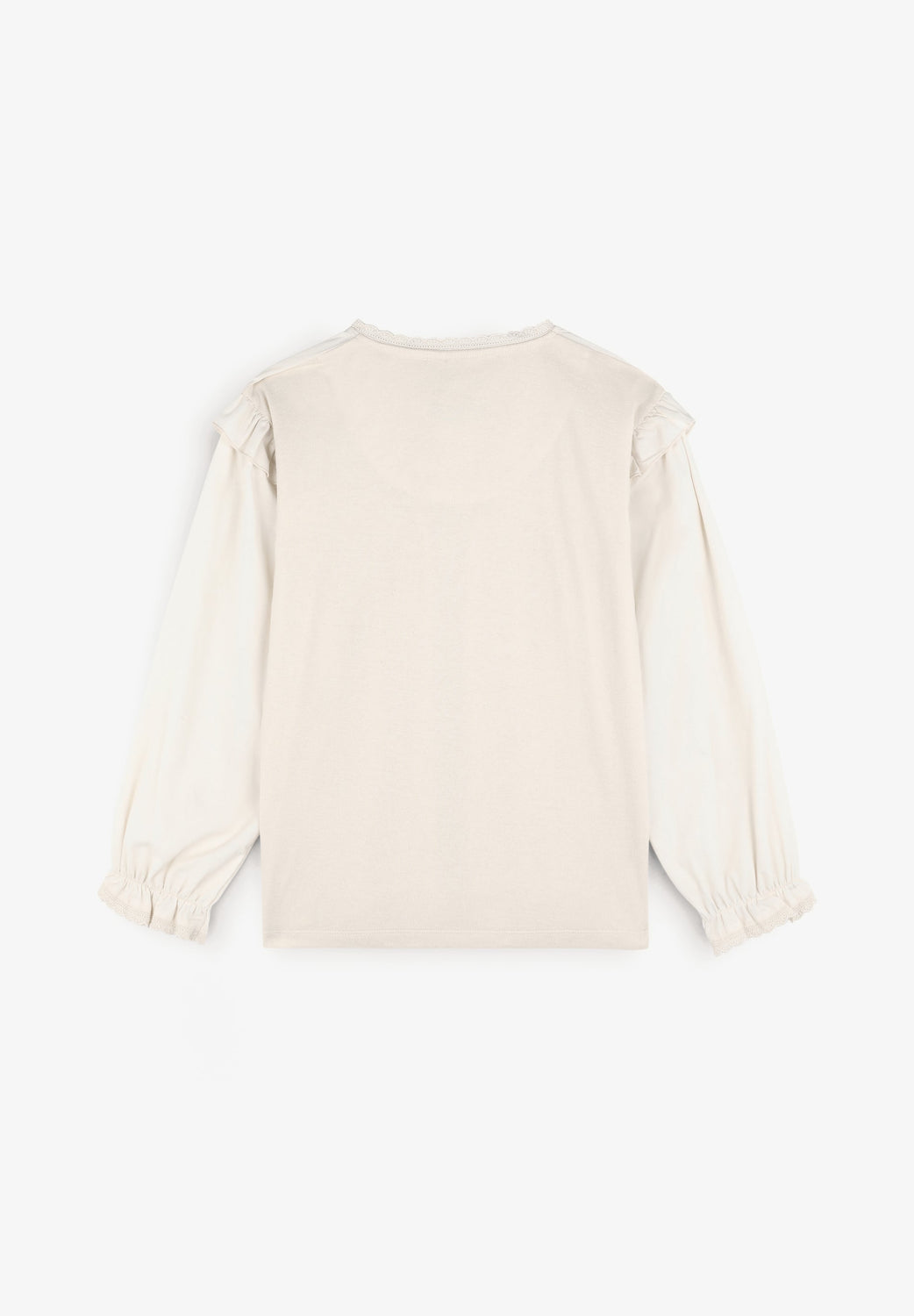 - Top: rounded collar with front button fastening. Long sleeves with ruffled cuffs. Shoulder ruffle detail. Finished with embroidered trim. Embroidered flower detail on the chest.