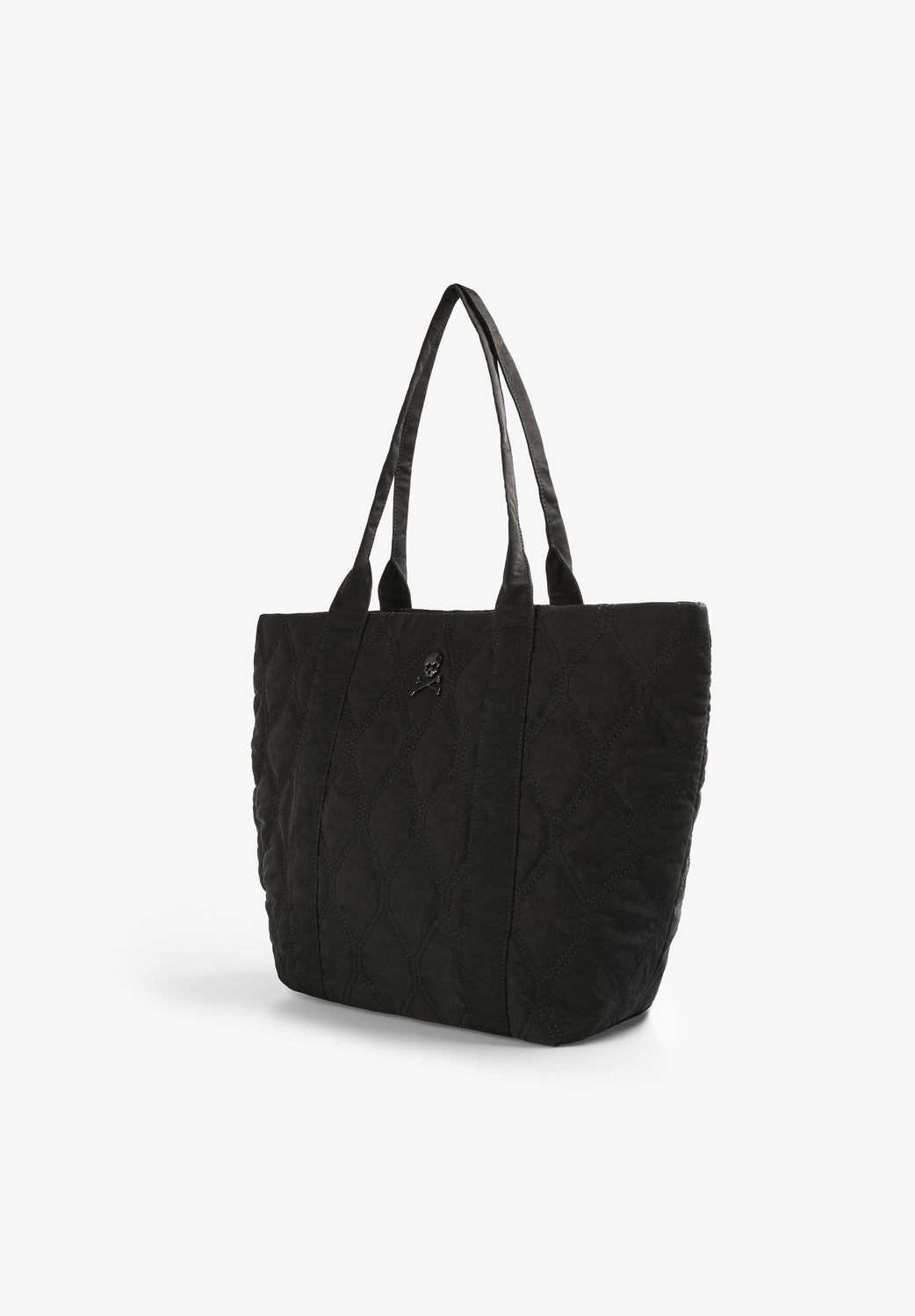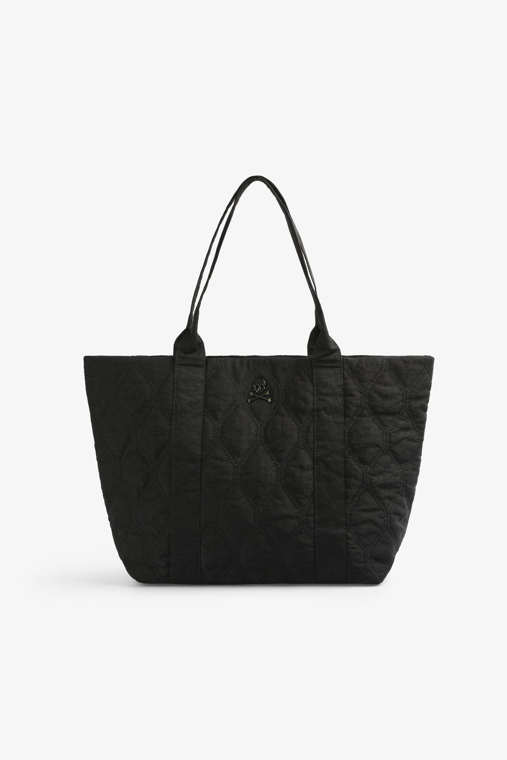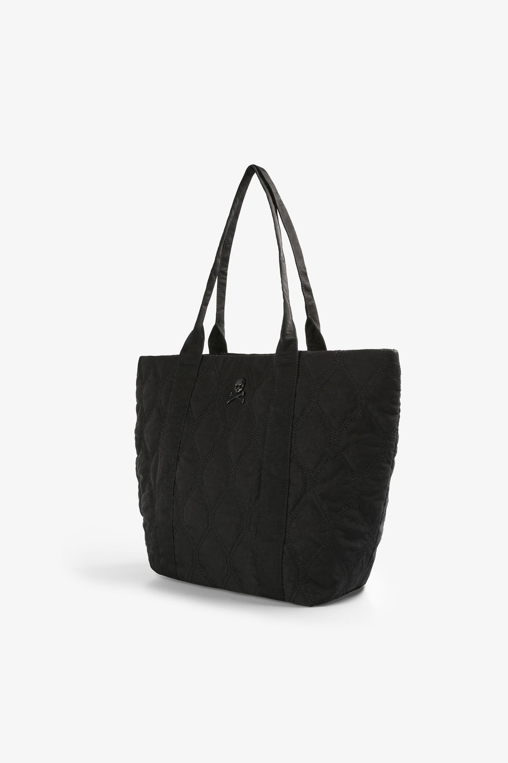 Quilted nylon tote bag. Double straps and snap button fastening. Inner pocket and a metallic skull.