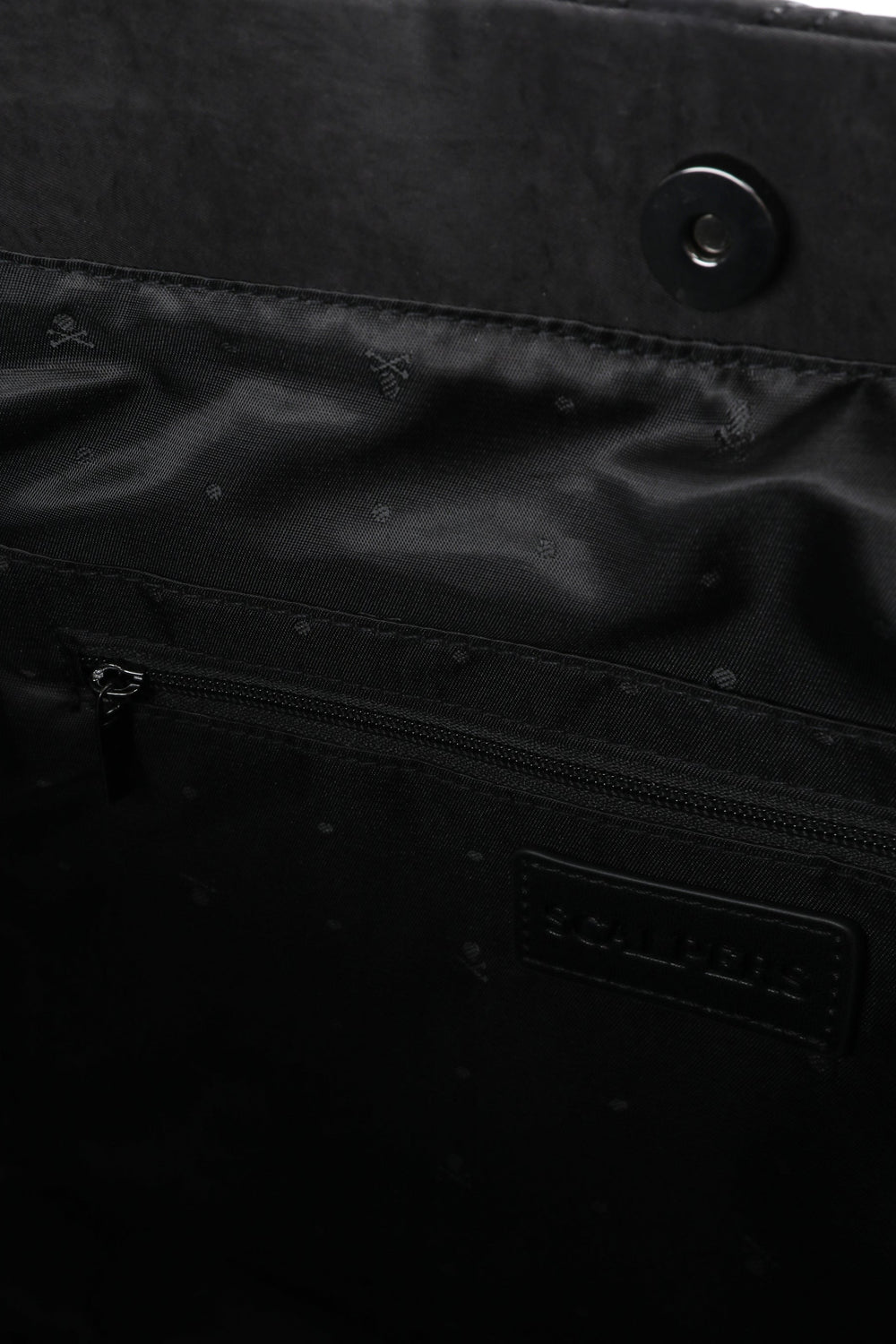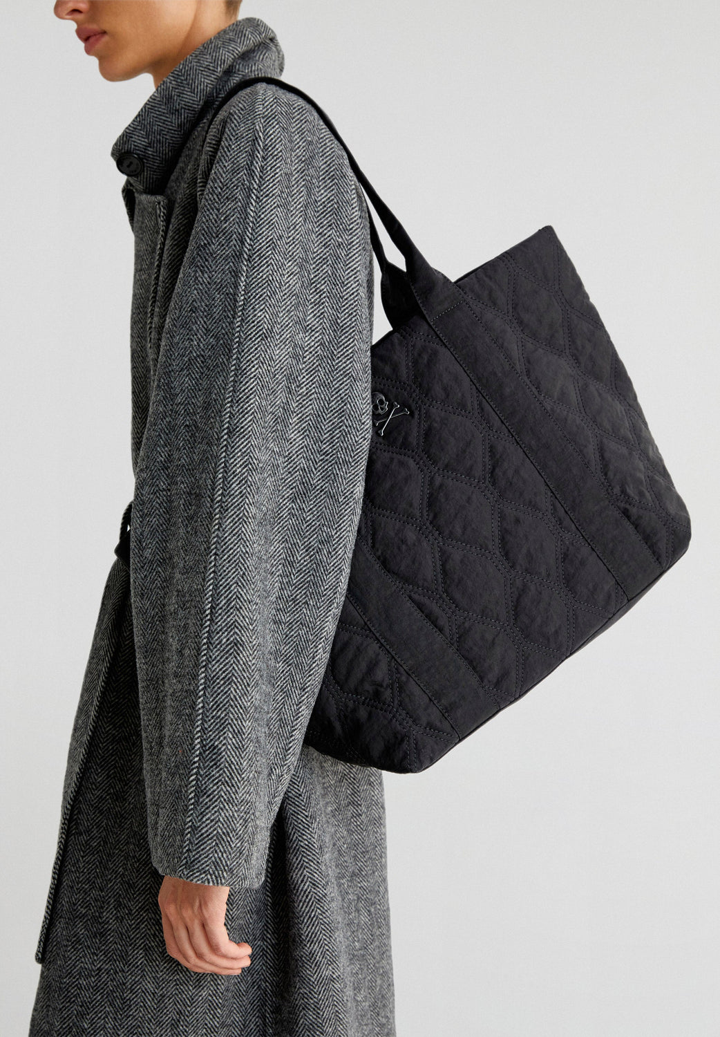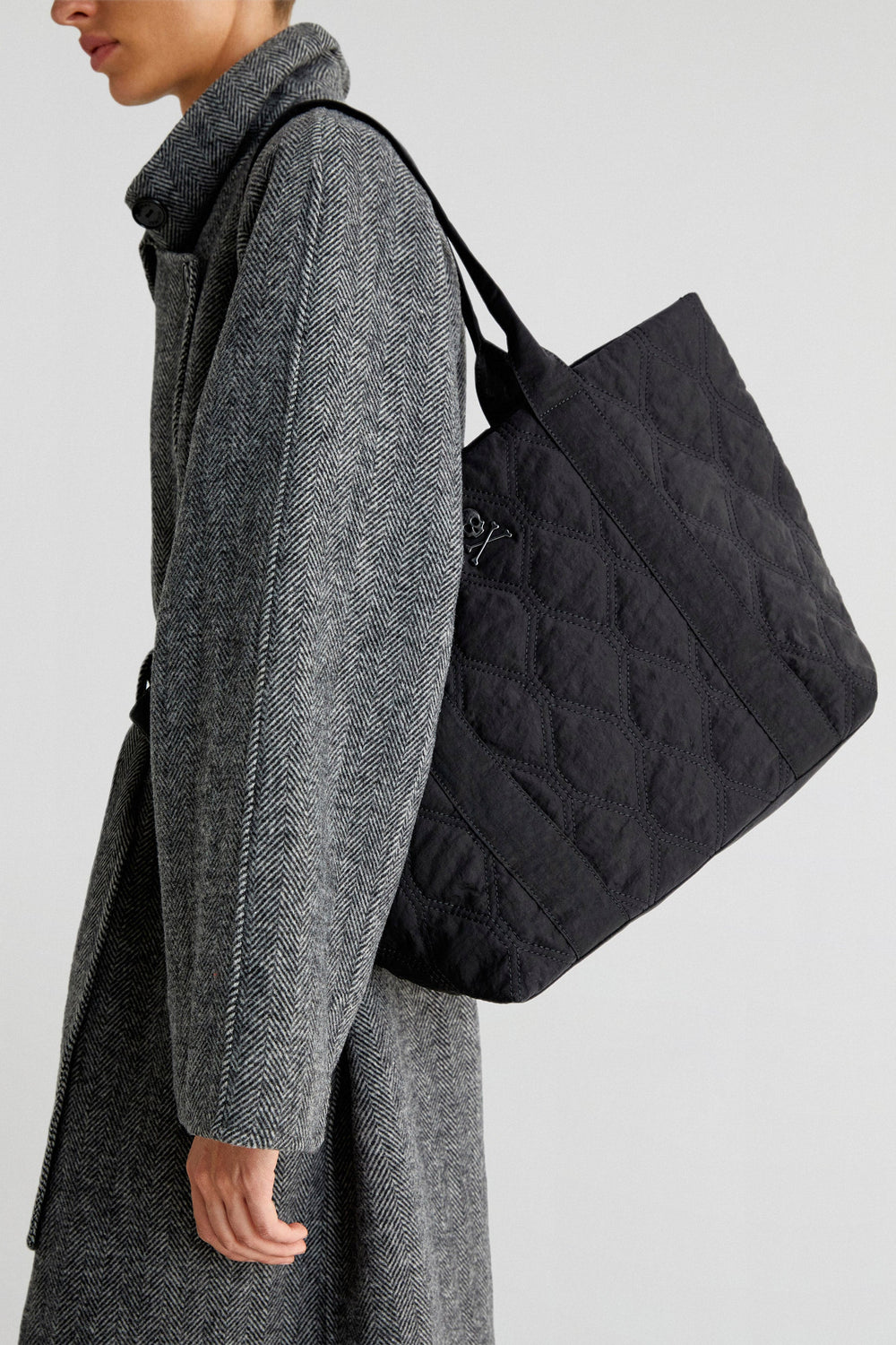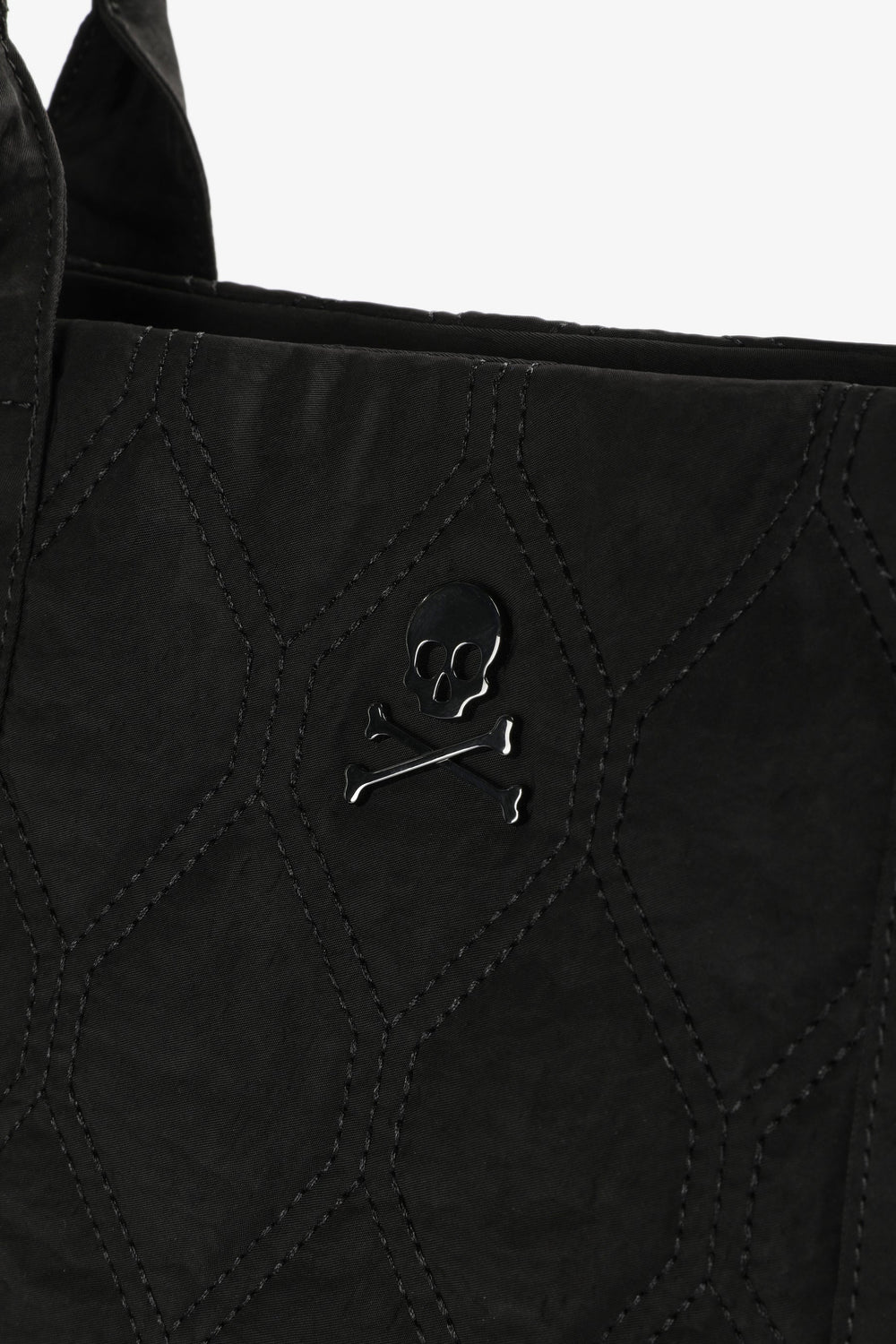 Quilted nylon tote bag. Double straps and snap button fastening. Inner pocket and a metallic skull.