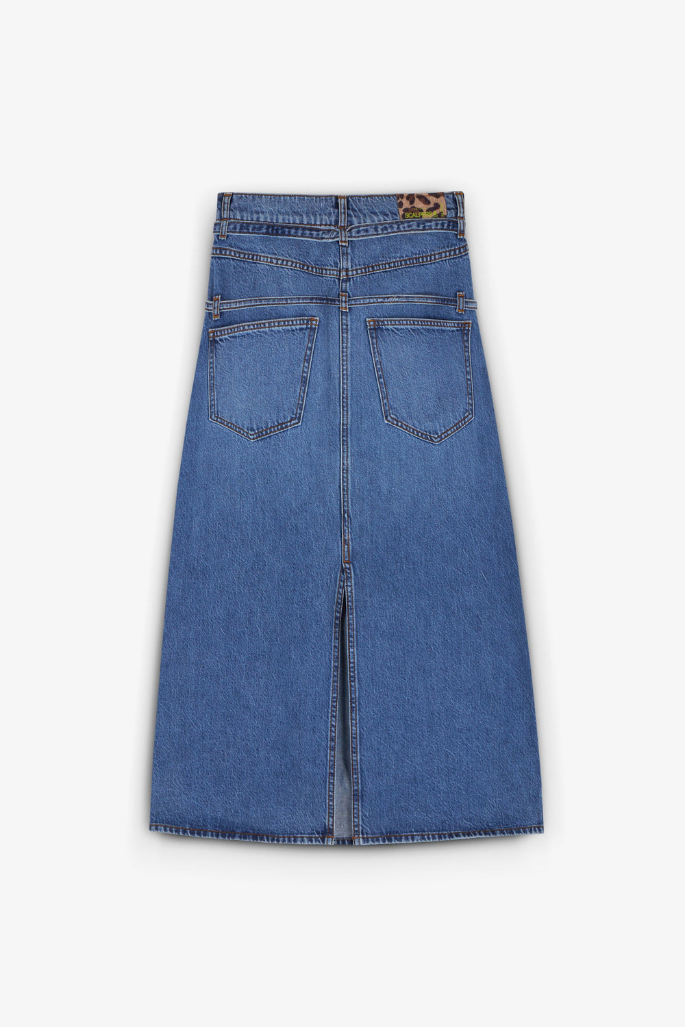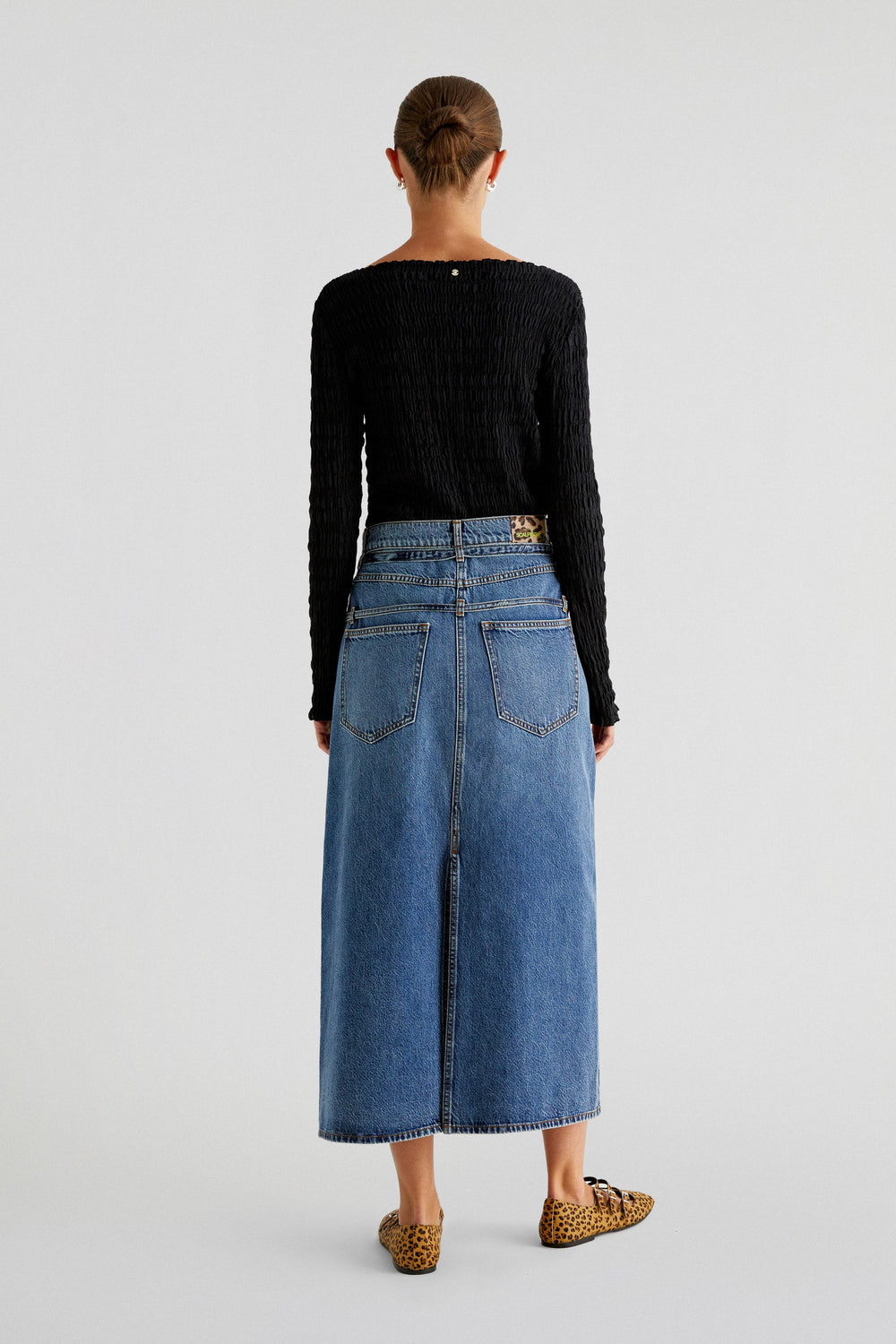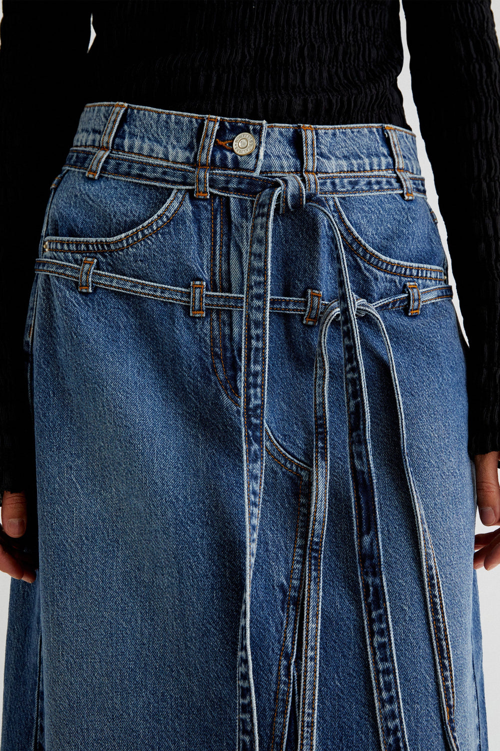 Denim midi skirt. Regular fit, button and zip fastening and belt loops at waist. Back and front pockets. Back vent and bow details.