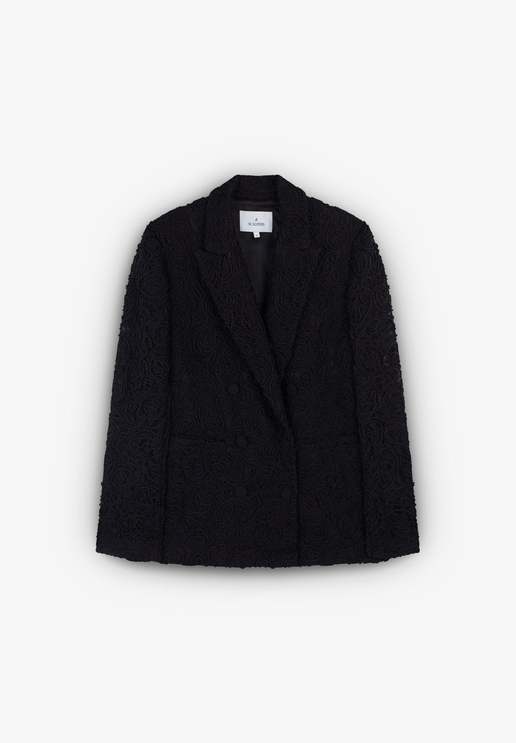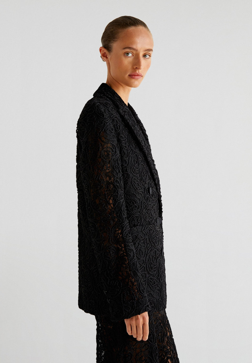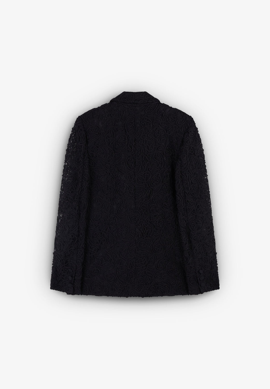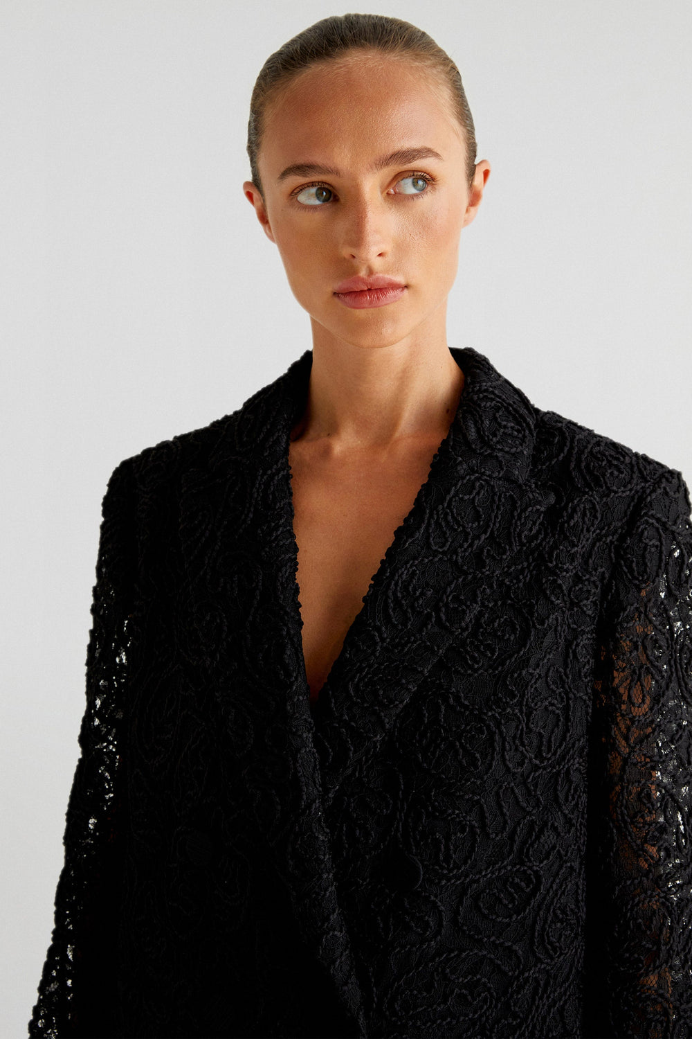 Veste en dentelle brodée, confectionnée en tissu en nylon et coton. Coupe droite, fermeture croisée boutonnée et manches longues. Poches sur les côtés.