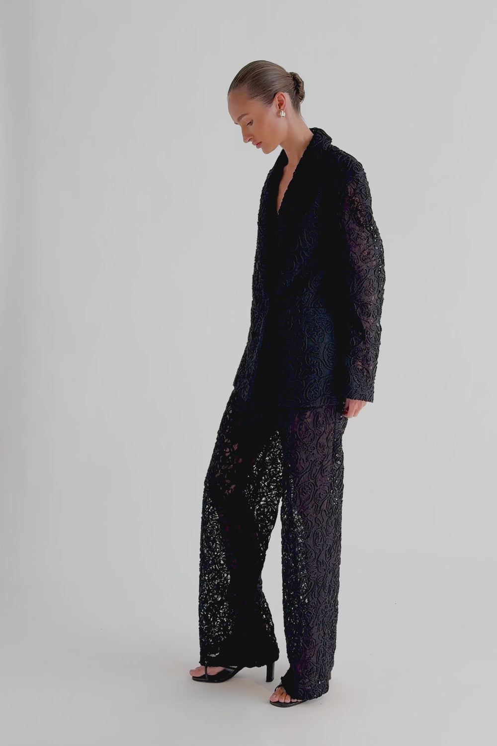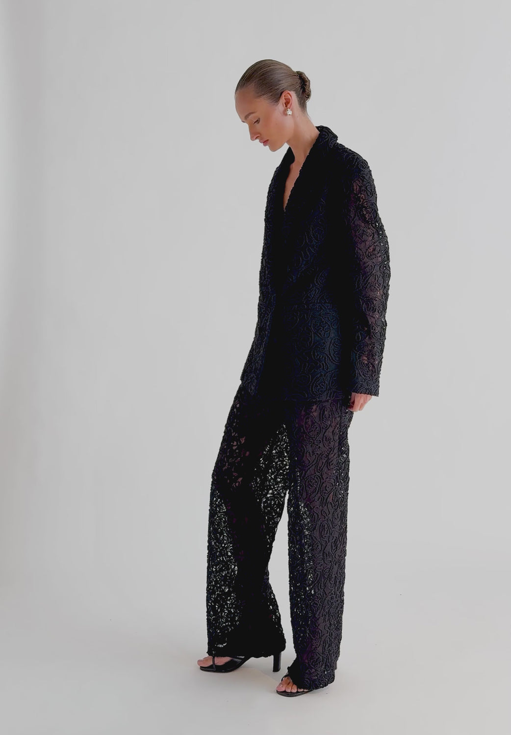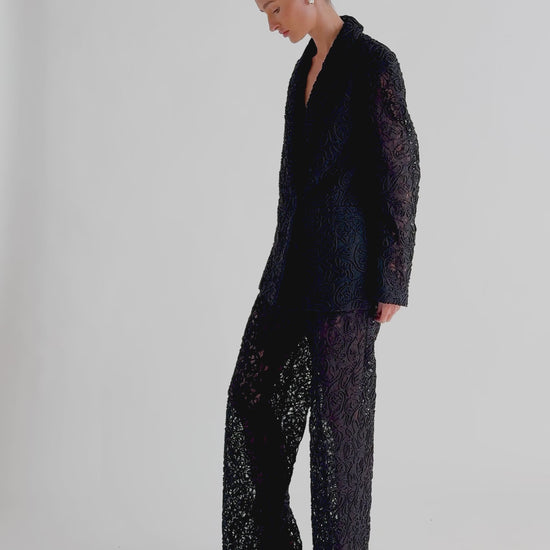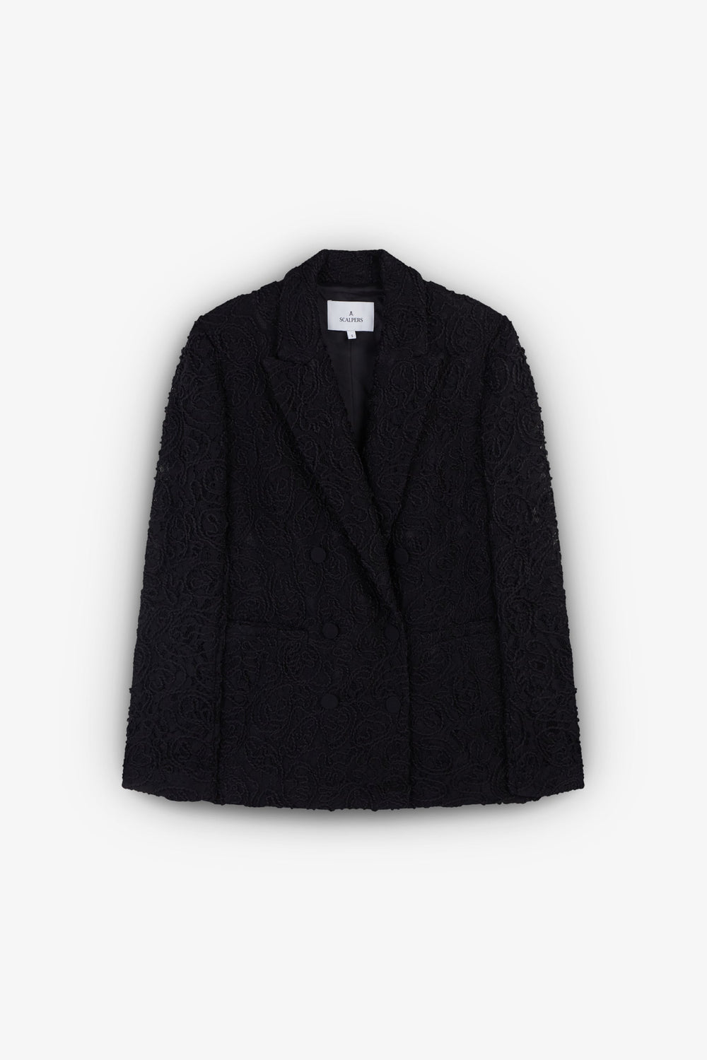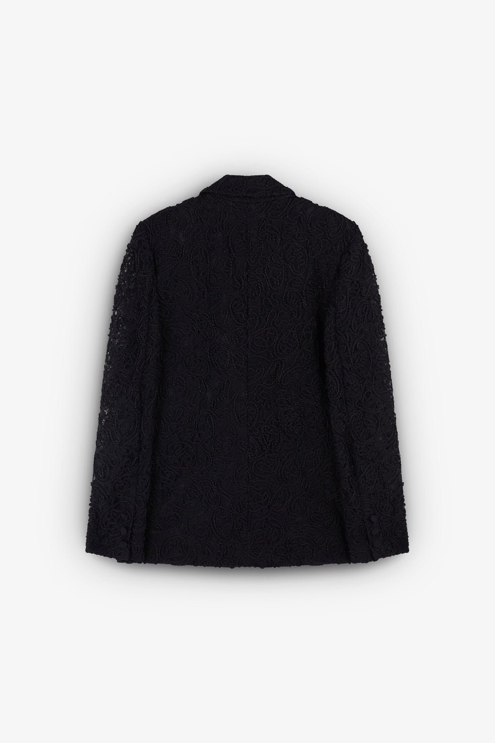 Veste en dentelle brodée, confectionnée en tissu en nylon et coton. Coupe droite, fermeture croisée boutonnée et manches longues. Poches sur les côtés.
