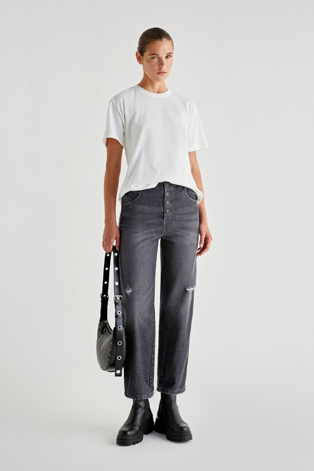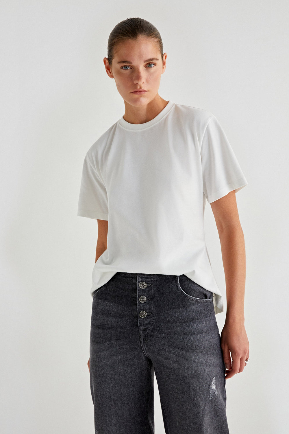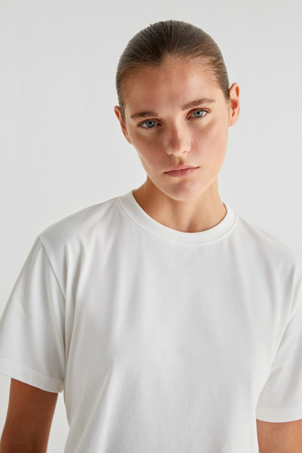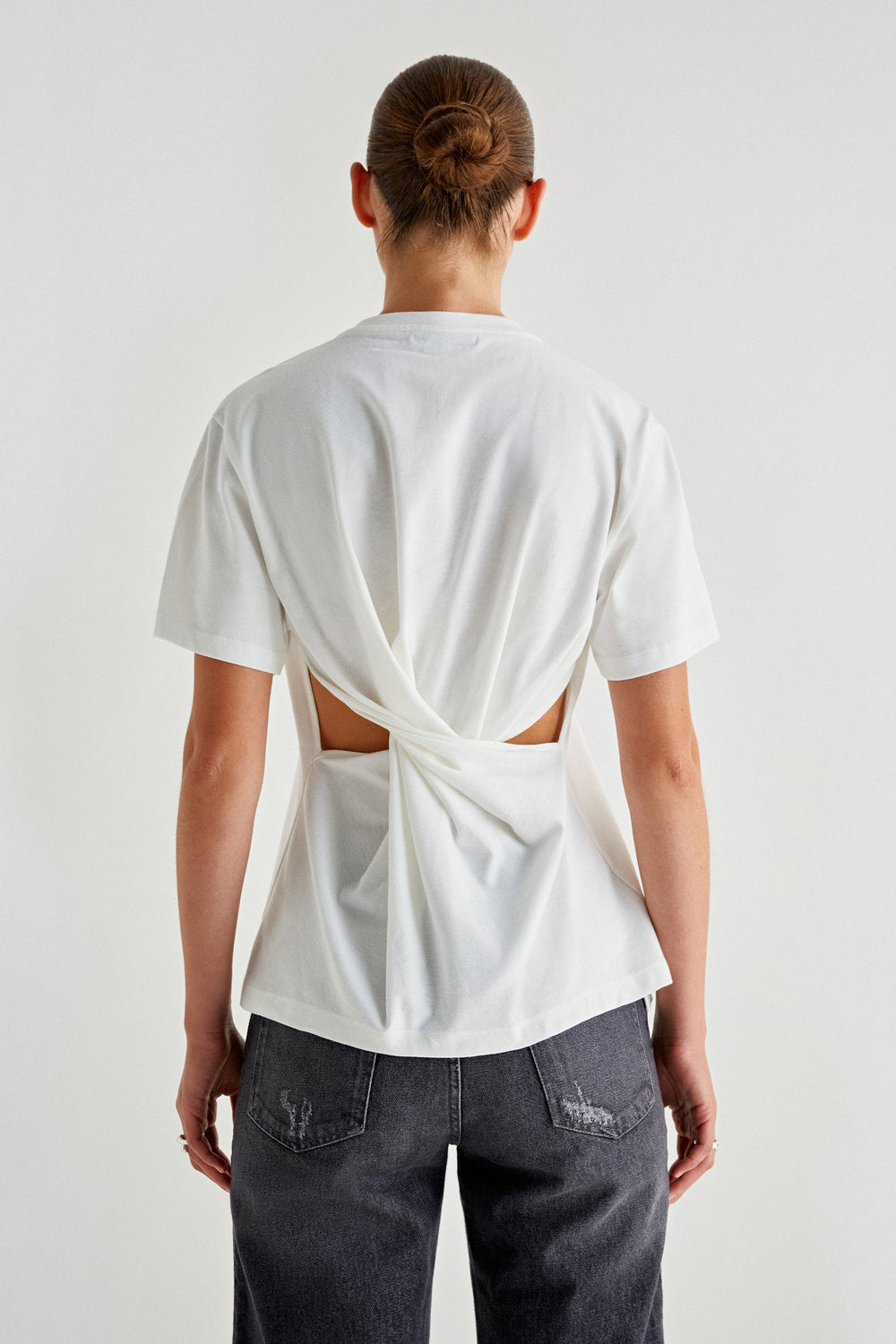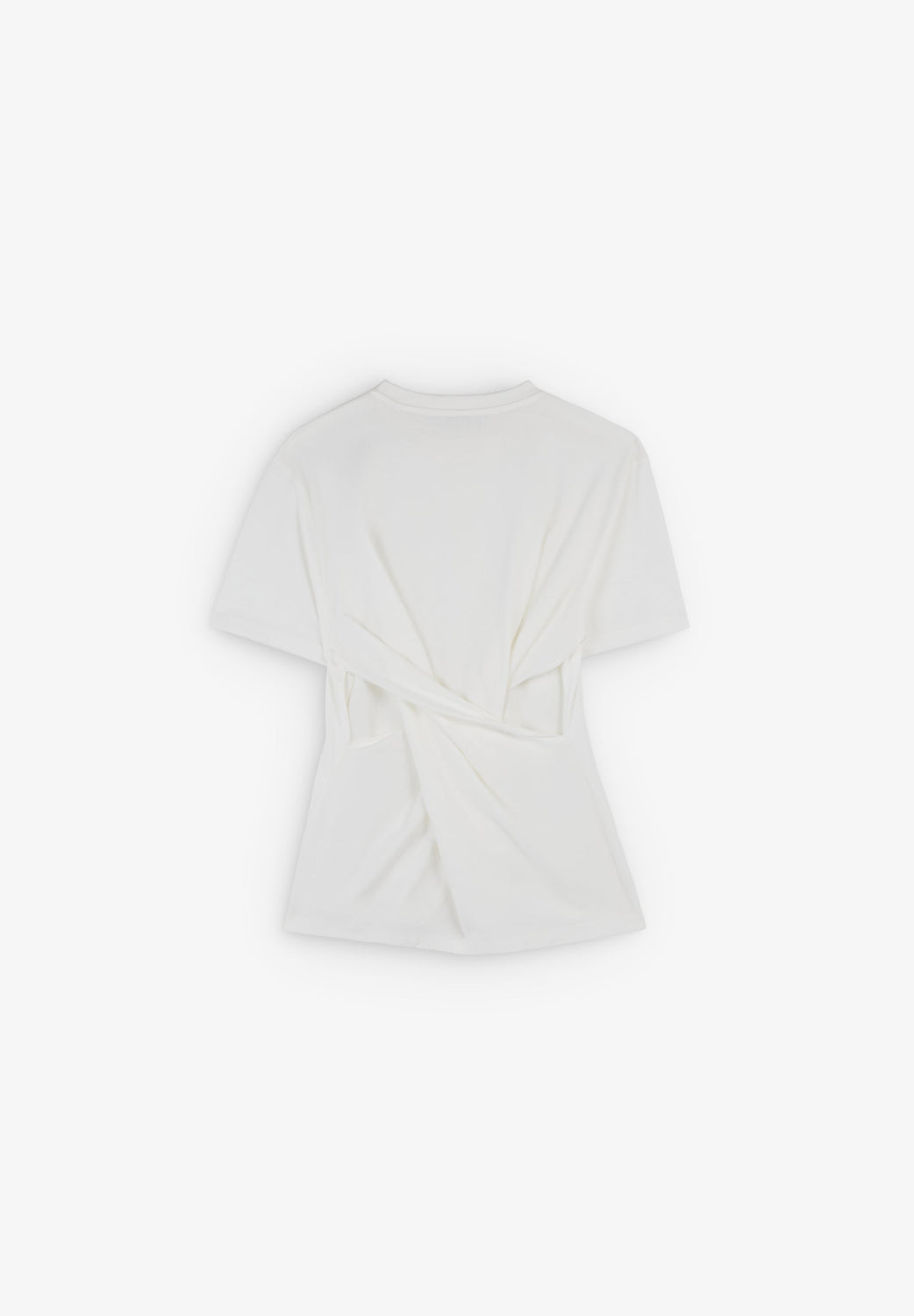 T-shirt confectionné en 100 % coton BCI. Coupe droite, col rond et manches courtes. Nœud et ouvertures dans le dos.