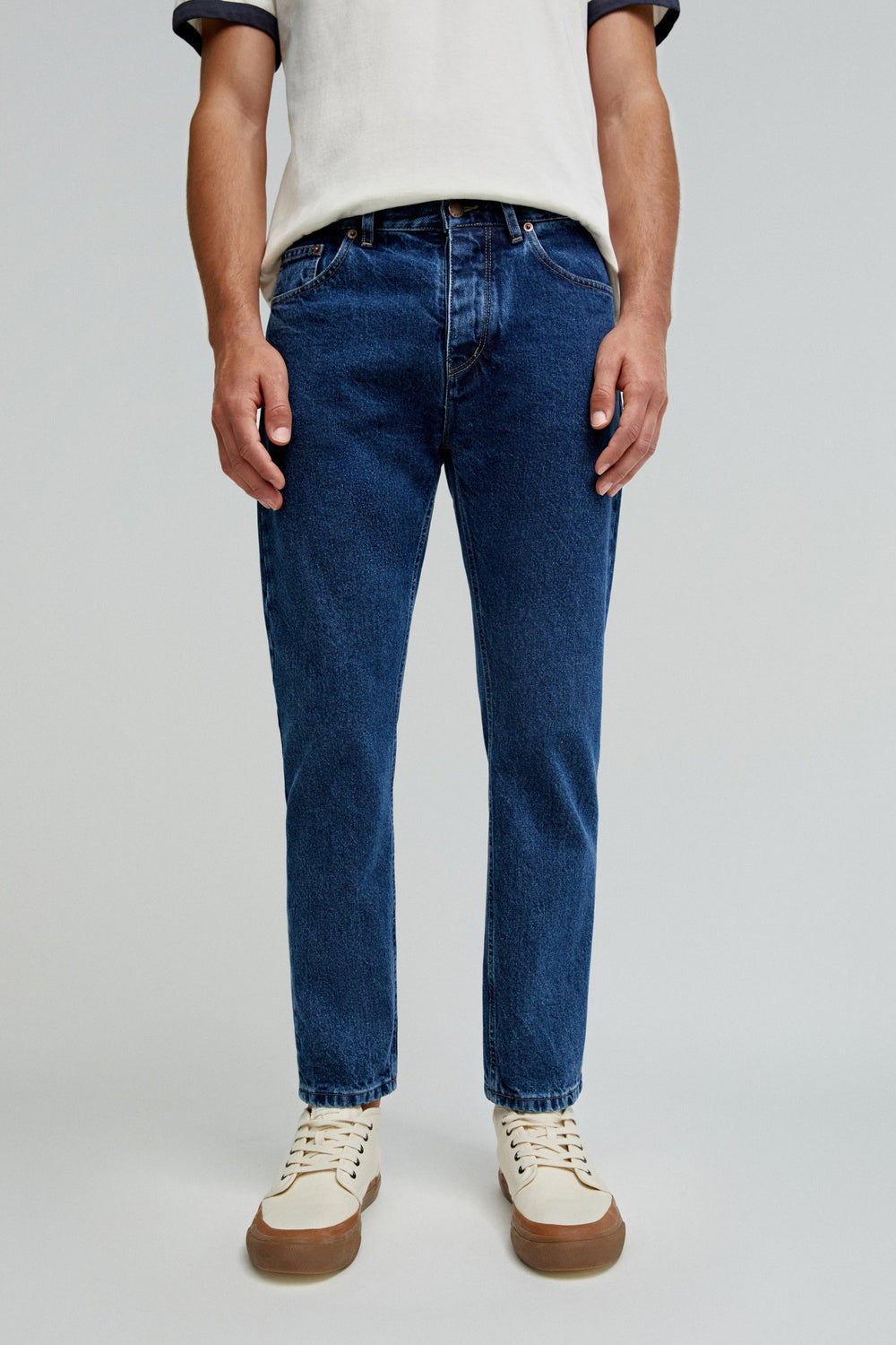 Jeans made of slightly stretch fabric. Cropped fit, top button and zip fly fastening and side and back pockets. Belt loops at the waist.