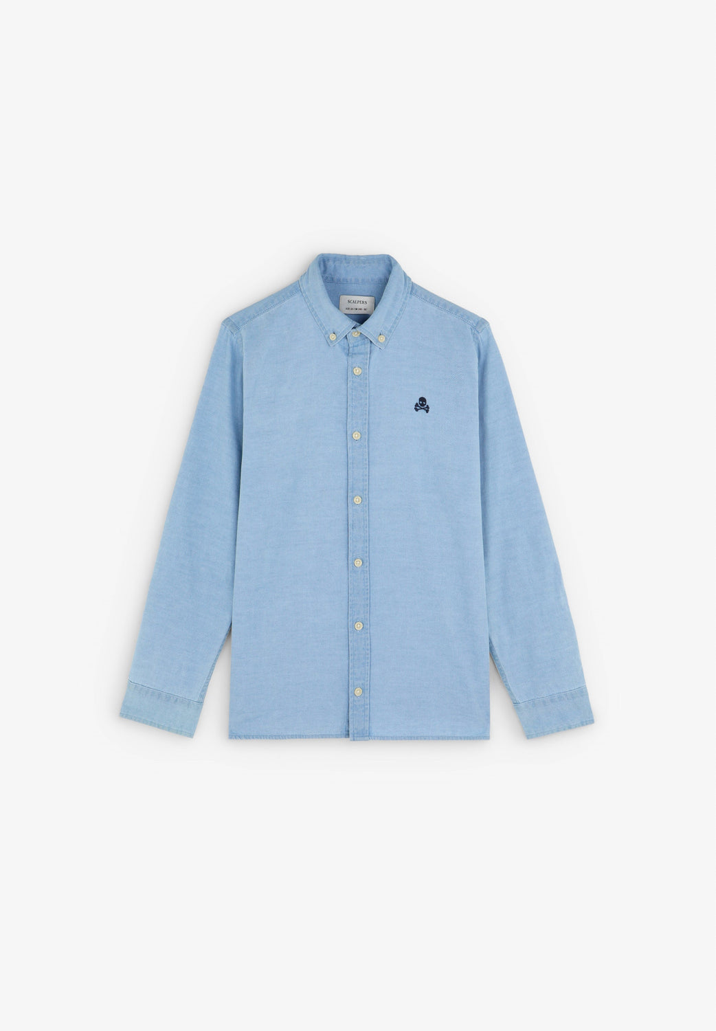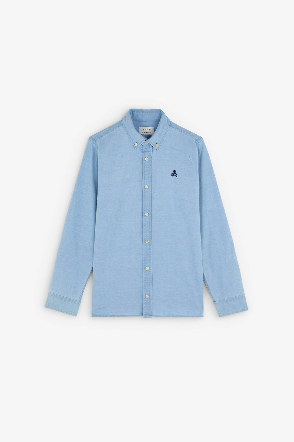 Chemise denim confectionnée en 100 % coton BCI. Coupe droite, col boutonné et fermeture boutonnée. Manches longues avec poignets boutonnés et skull brodé contrastant.