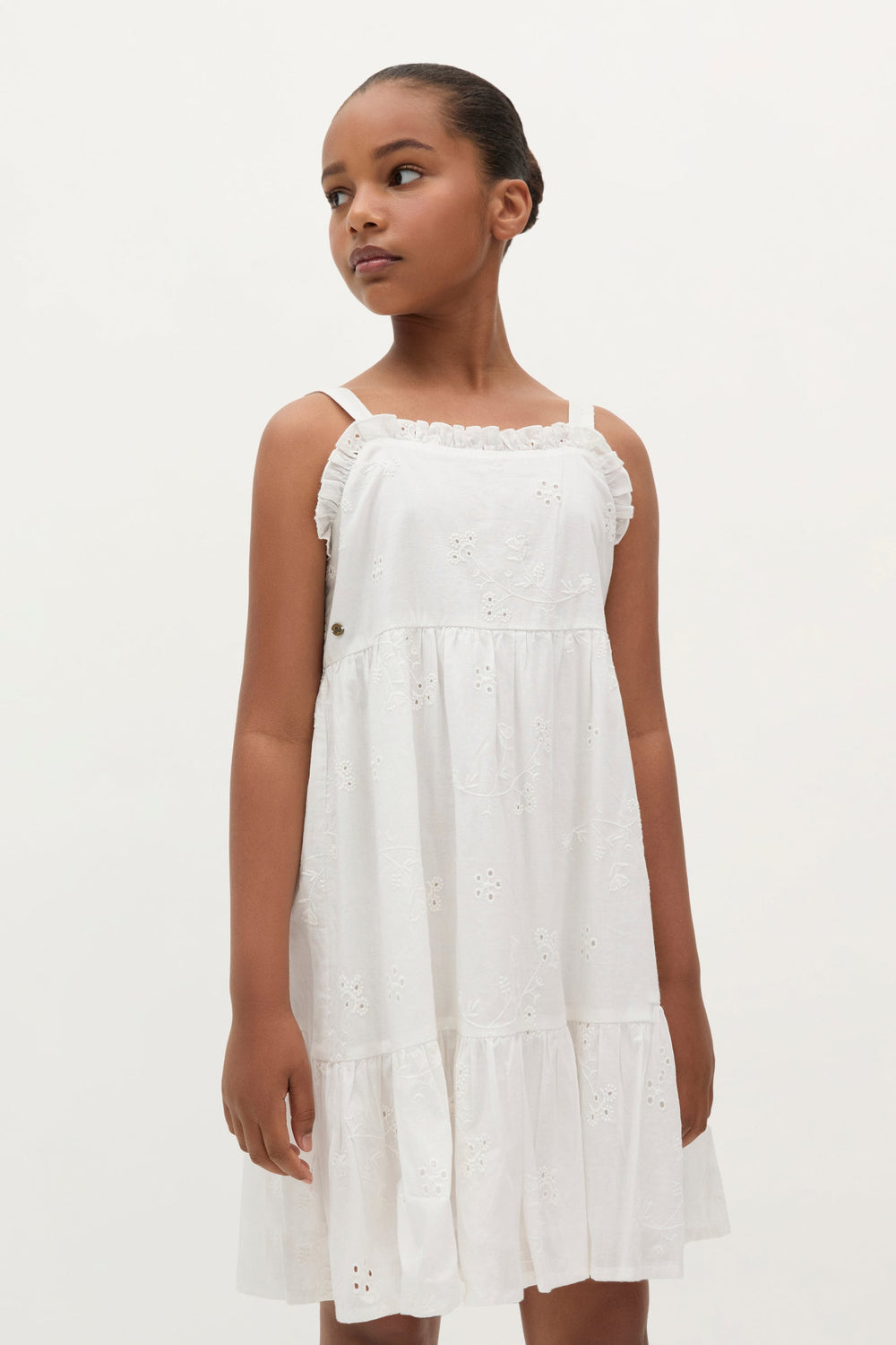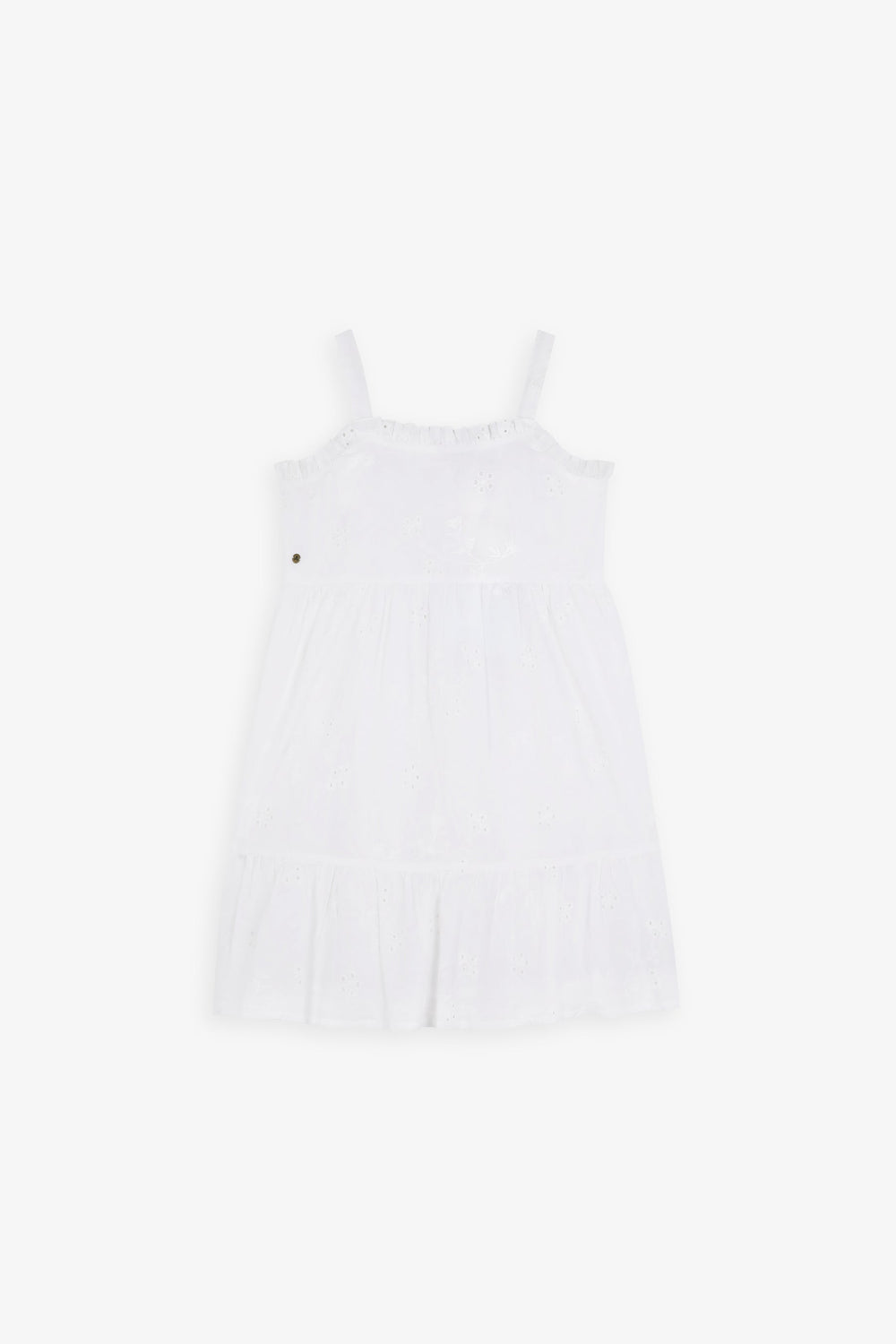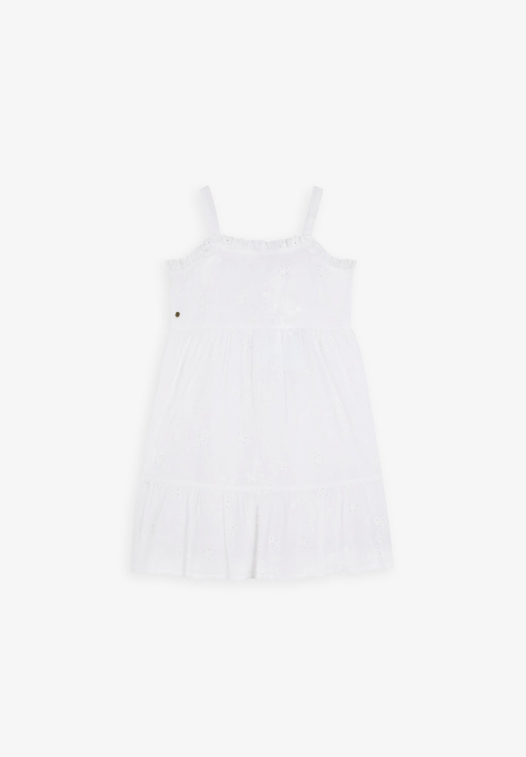 Robe 100 % coton biologique BCI. Col droit orné de volants brodés. Imprimé et bretelles brodées à motif floral.