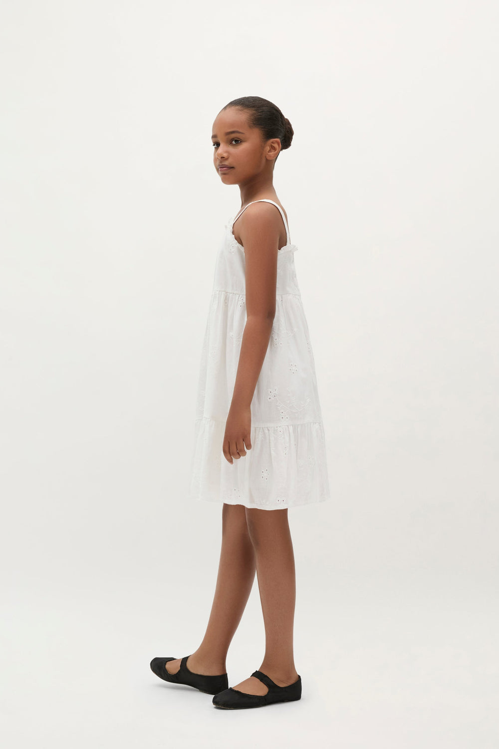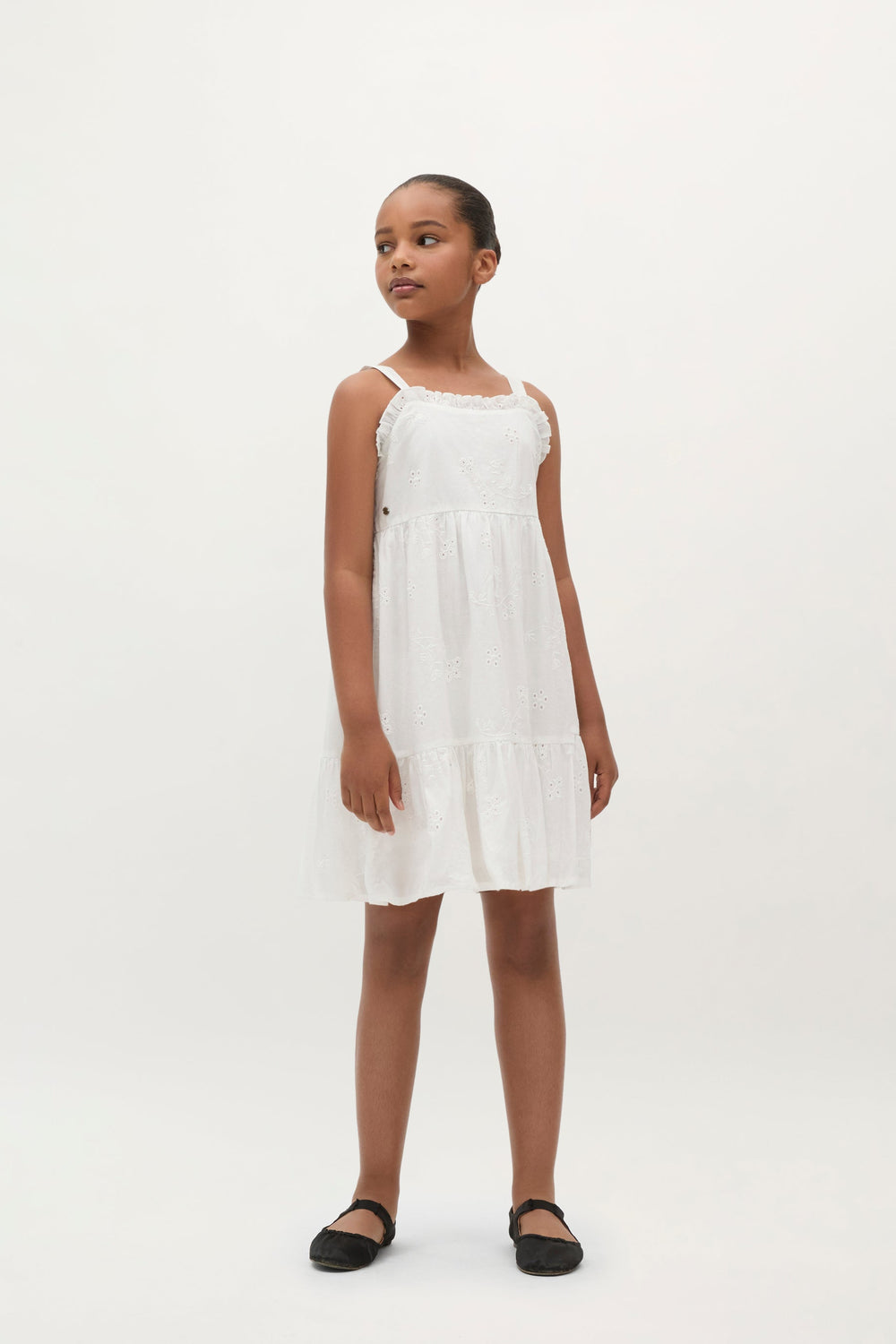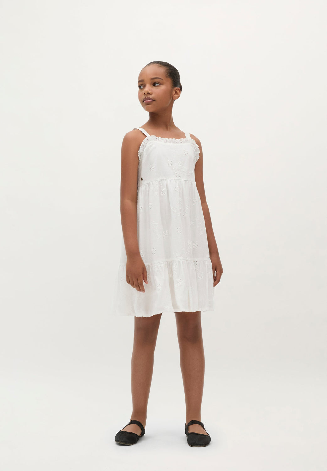 Robe 100 % coton biologique BCI. Col droit orné de volants brodés. Imprimé et bretelles brodées à motif floral.