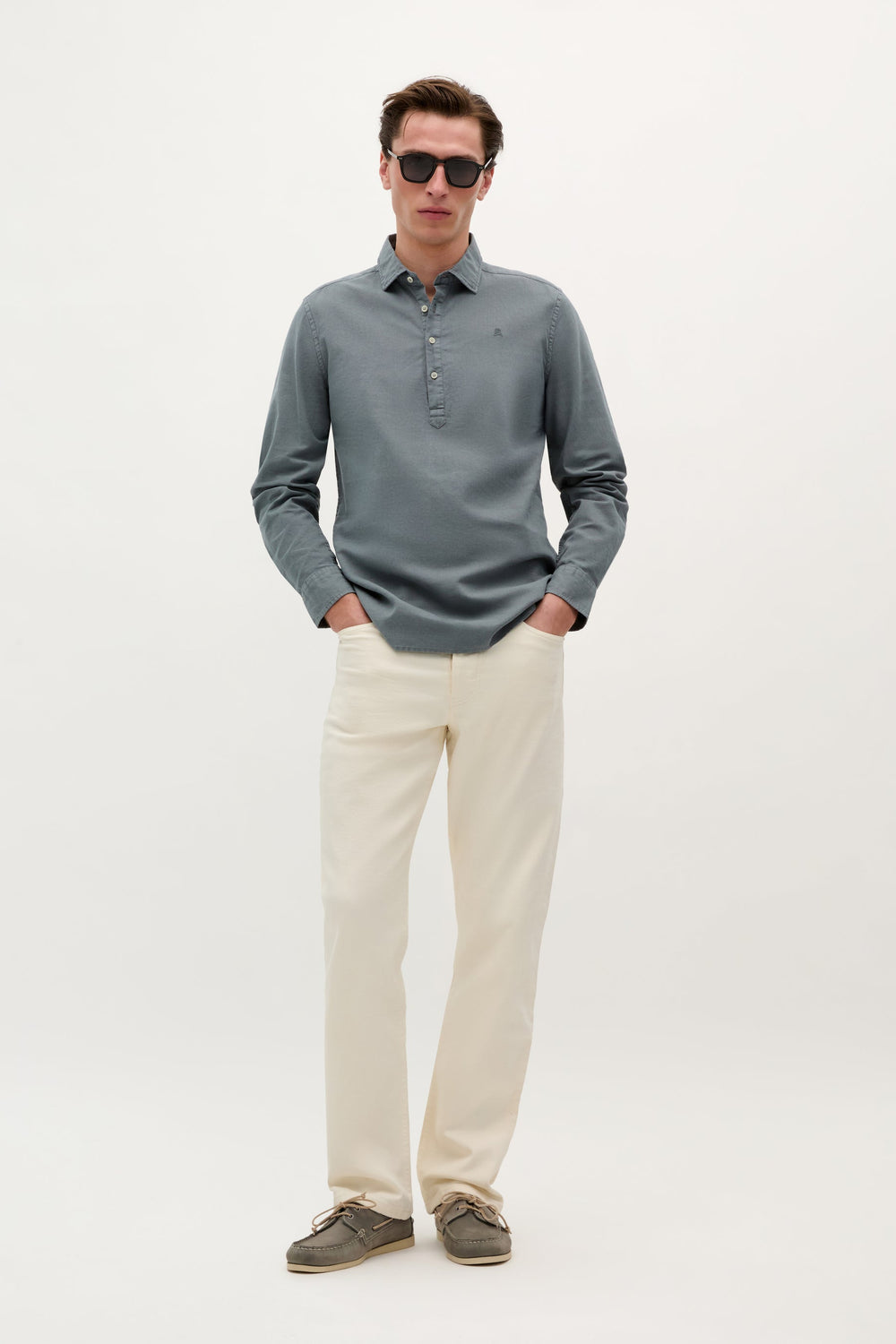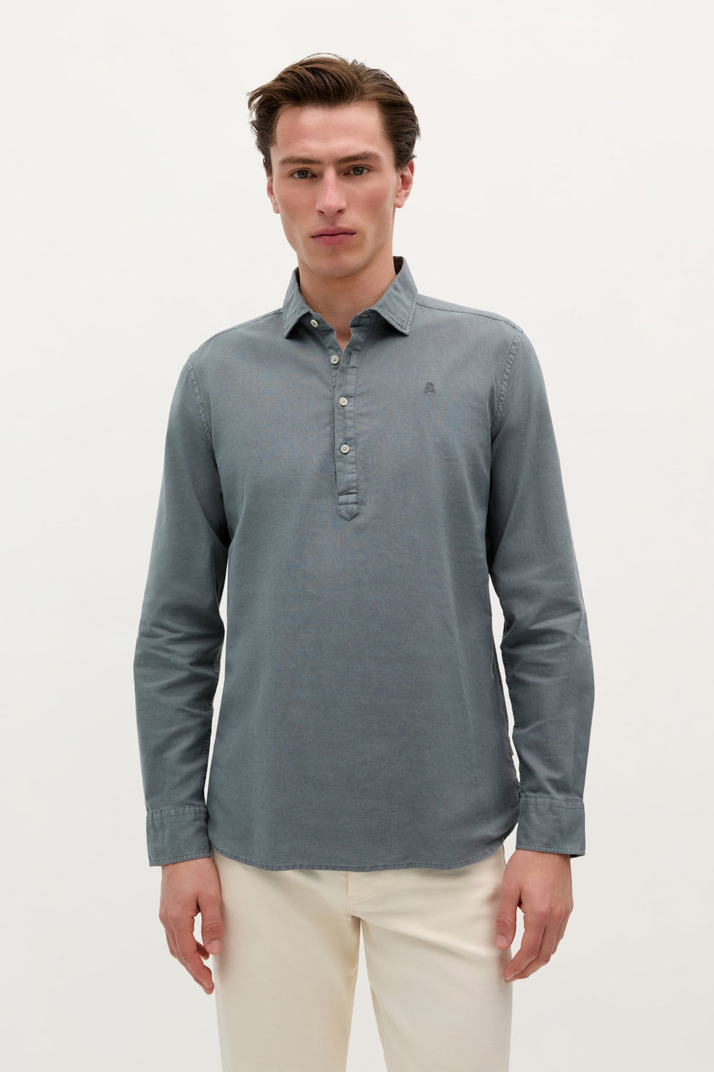 Chemise en coton et lin. Fermeture boutonnée style polo. Manches longues. Poignets boutonnés. Logo brodé en ton sur ton devant.